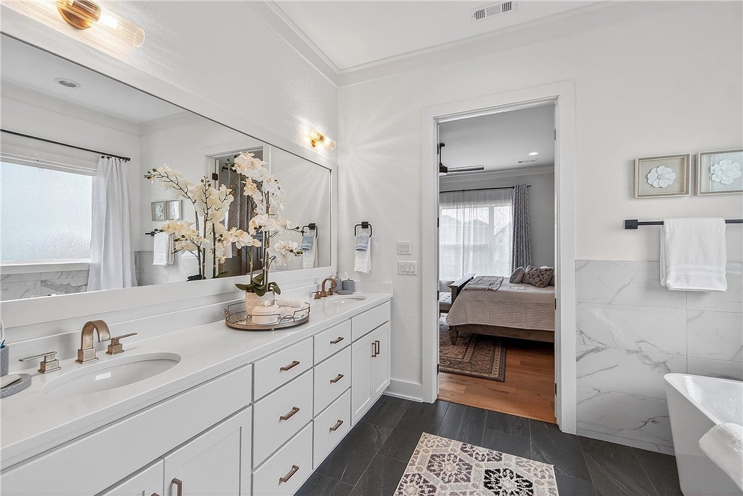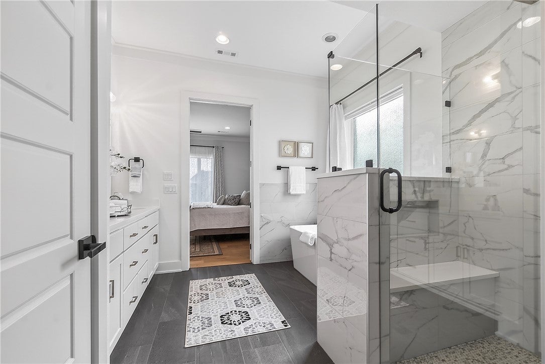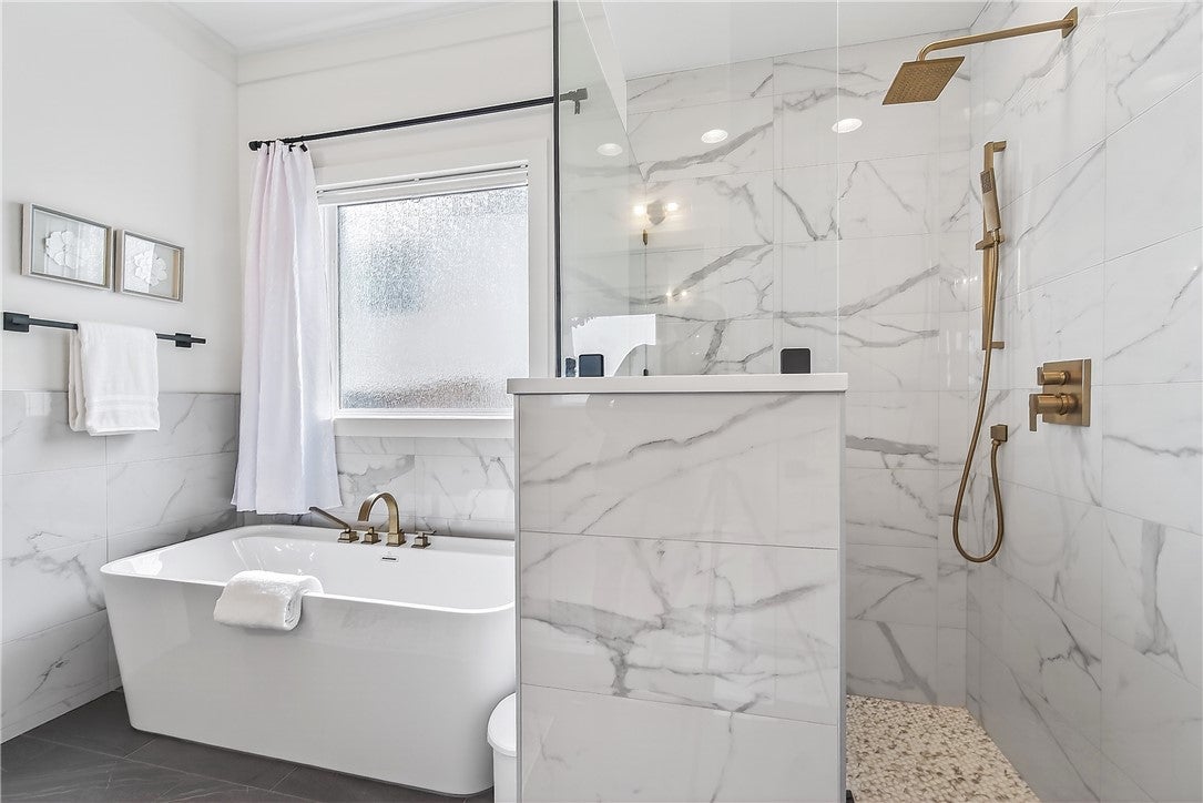 Imagine a unique and special opportunity to enjoy a peaceful setting in a luxurious already renovated home while being able to customize for the future, feeling worlds away from the bustle of the city, yet so close to everything; imagine 2014 North Ponce. Newly renovated mid-century two story brick traditional in historic Druid Hills perched on a hilltop acre lot offers the perfect blend of privacy, luxury, and possibility. Tucked between Olmsteds Deepdene Park and the Fernbank Forest, winding up a long tree-lined drive surrounded by mature landscaping, a peaceful approach transports you to a private retreat. Envision morning sipping a favorite drink, listening to birds, and relaxing in the beauty of your own private nature preserve. Exceptional interior renovation by Avalon Custom Homes creates bright, airy, and open rooms while adding a wing for a primary suite. Every interior detail, from the choice of materials to the intentional use of space, is thoughtfully and professionally planned and updated from the top-of-the-line kitchen to the spa-inspired bathrooms. An abundance of natural light flows in from windows which strategically frame views. The oversized great room boasts a dramatic vaulted ceiling, skylights, a wood burning fireplace, floating cabinets, and a roomy window seat. The completely custom kitchen with island, overlooking both the great room and the separate dining room, features custom-built natural oak cabinets, Caesarstone countertops, Nemo stacked tile backsplash, Thermador appliances: 36 inch 6 burner dual fuel range, wall oven, cabinet-paneled dishwasher, cabinet paneled 48 inch built-in refrigerator, and built-in microwave. Flow out onto the deck from multiple points in the home, perfect for entertainment circulation. Flat and expansive back yard has been graded for a pool and offers ample space to create your dream back yard oasis. Main floor primary suite off of a secluded hallway is a true sanctuary, with vaulted ceilings and its own screen porch - an ideal spot to unwind. Primary bathroom features a long floating double vanity, separate glass enclosed shower, free-standing deep soaking tub, a separate water closet, and Marmo Calcatta Gold porcelain tile. Mudroom entry in the rear of the home has floor to ceiling custom made oak closets and pantry storage. Main floor laundry room features extra cabinetry, space for hanging clothes, and terrazzo tile flooring. Main floor also includes a home office with built-in bookcases, a separate living room/ bonus room, a glass walled reading nook, and a sophisticated wall-papered powder room. Upper floor encompasses three more bedrooms. Upper floor mini-primary bedroom suite boasts a walk-in closet and ensuite bathroom. Two additional upstairs bedrooms share a hall bathroom. A concrete pad, with underground utilities (electric conduit, water line, sewer line) has been poured and is ready for a future two car garage with carriage house. Site finished solid oak flooring throughout the home; built-in speakers; whole house water filter; roof, tankless water heater, and both HVAC systems (one zoned) are less than 3 years old; irrigation system (requires new controls). A premier intown location between Downtown Decatur and Emory University, convenient to CDC/VA, Midtown Atlanta, and Downtown Atlanta.