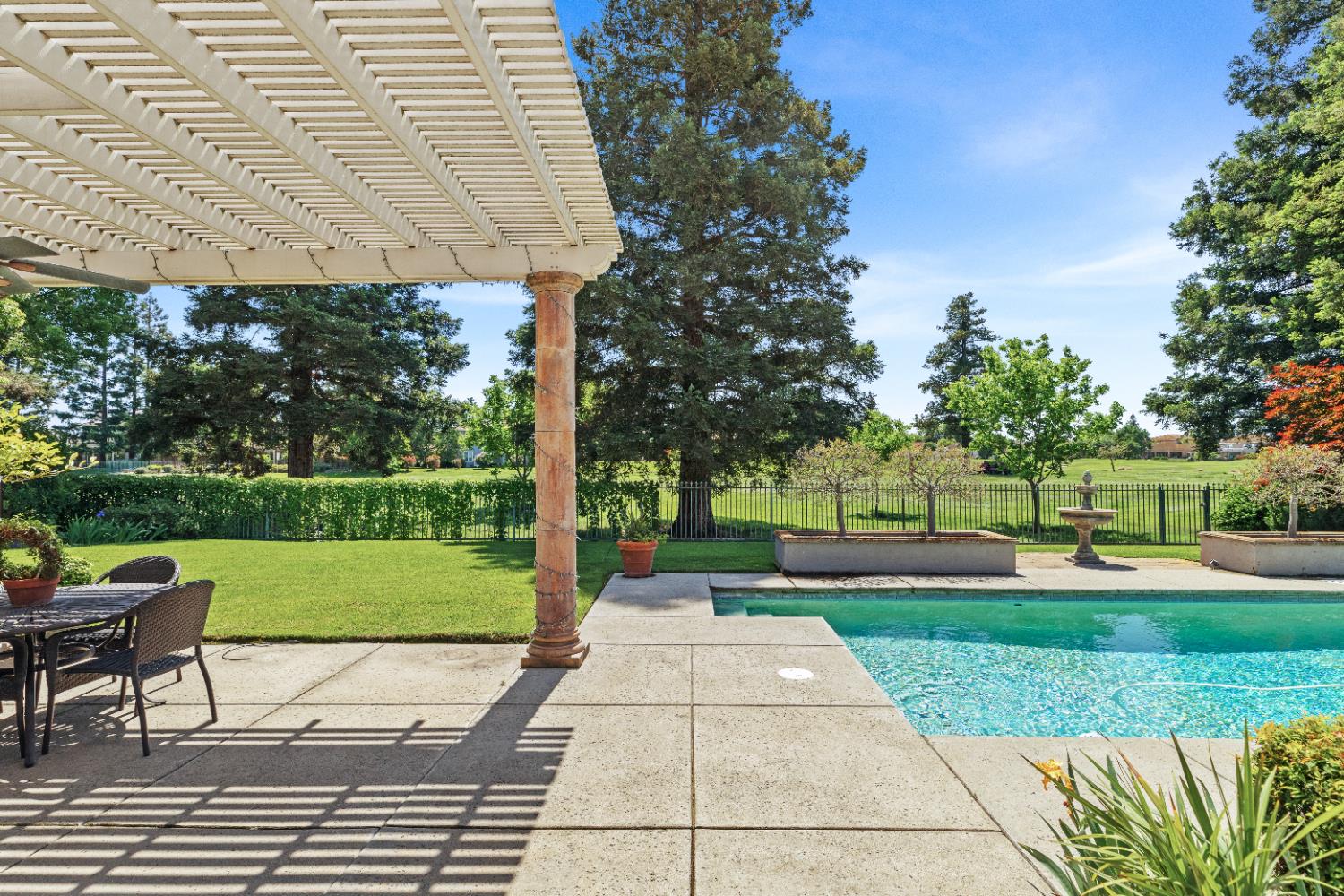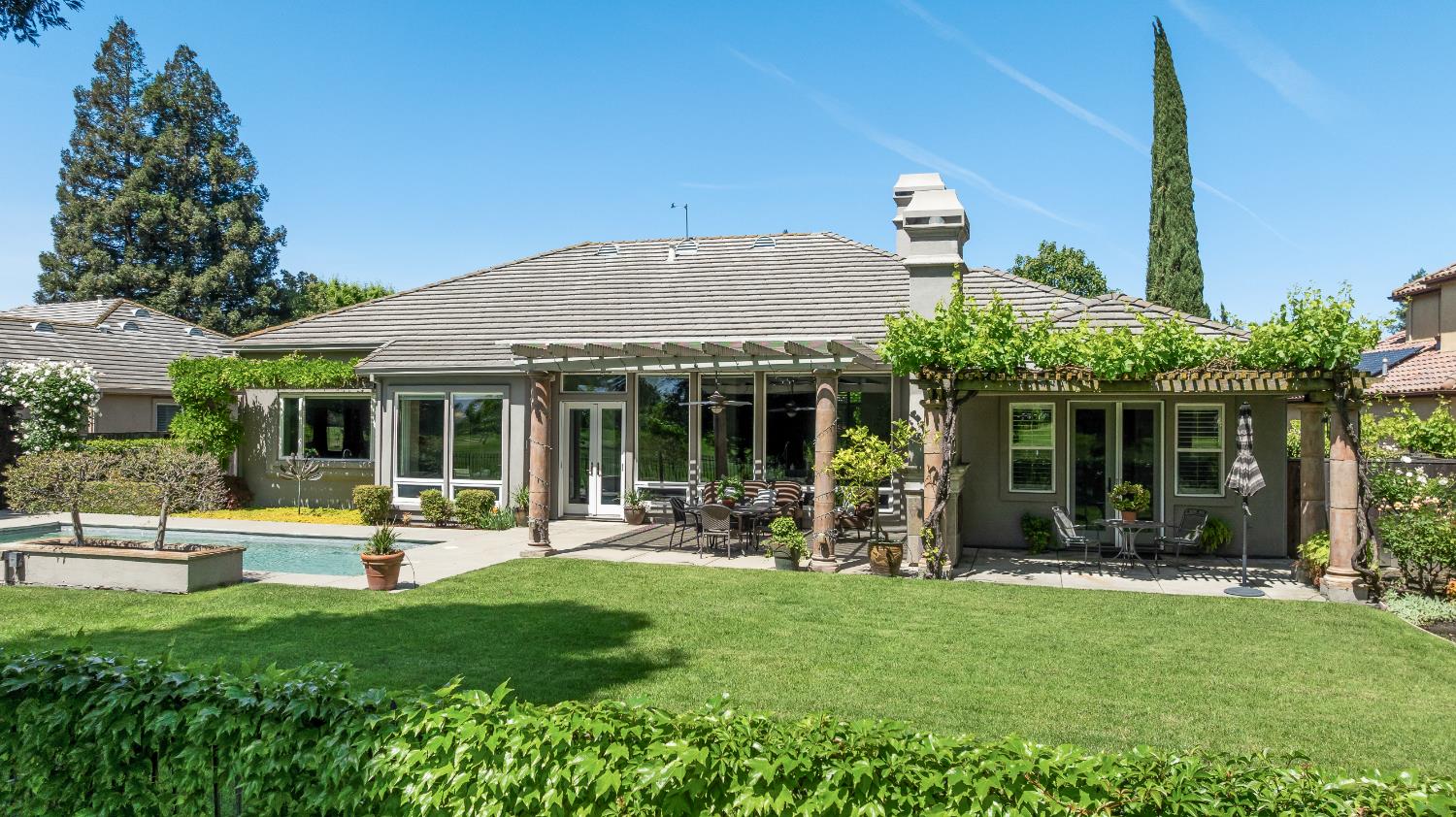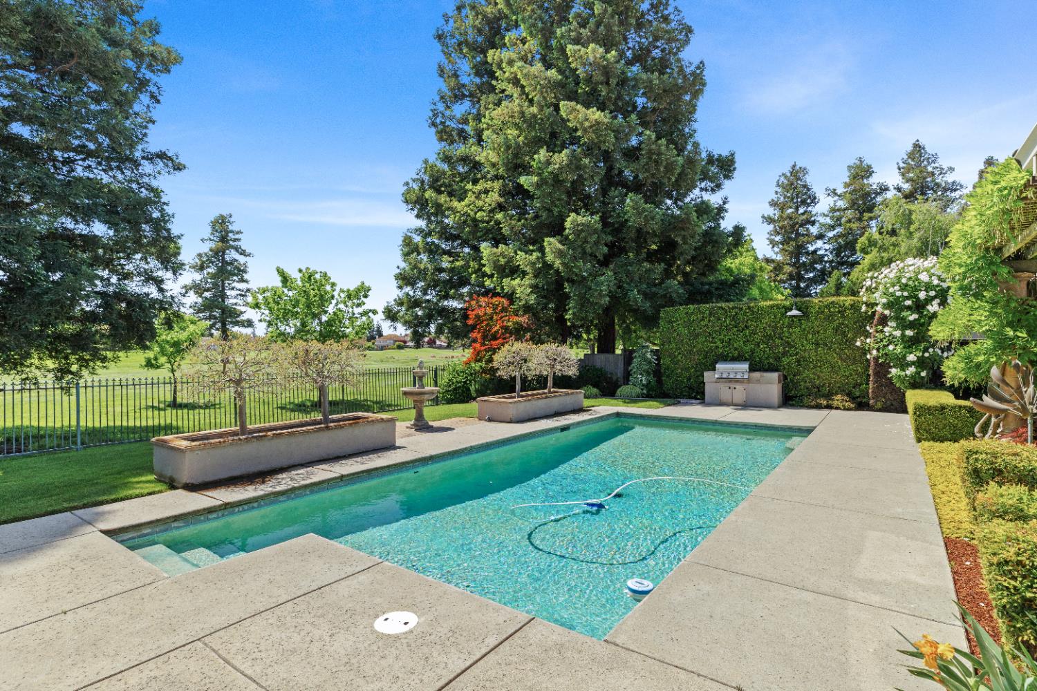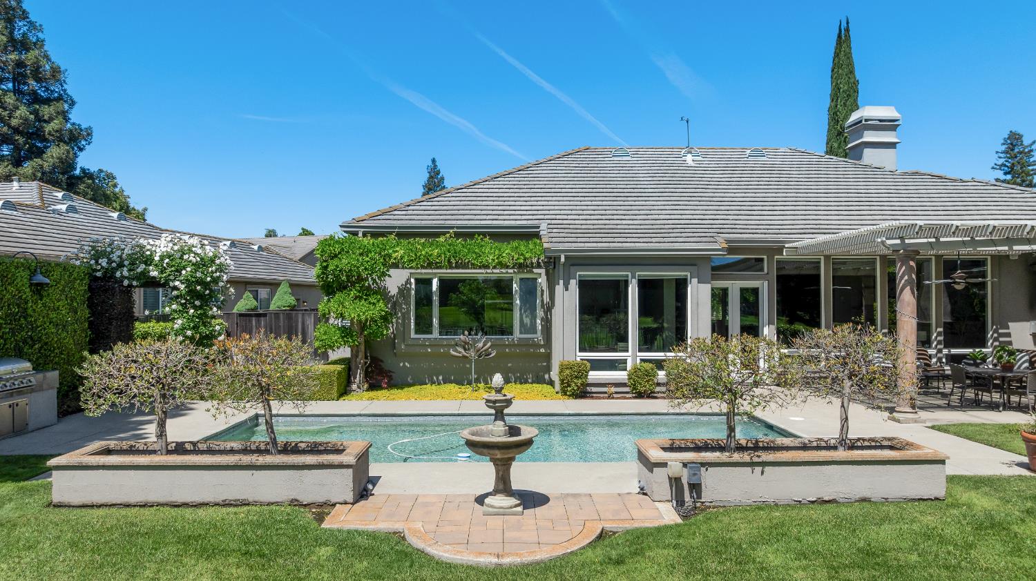 Experience refined living in this mostly single-story masterpiece, perfectly positioned on the golf course with wonderful, picturesque views. Custom-built by a builder for his own family, this exceptional home showcases superior quality, thoughtful design and distinctive craftsmanship throughout. Enter through a private courtyard and large, grand, wood antique double doors into a warm and inviting space. Inside youll find walls of windows that flood the home with natural light, soaring, dramatic, high ceilings, spacious, generous living areas and a highly desirable floor plan featuring primarily single-story living, with only a generous loft upstairs. The formal living room impresses with a stunning coffered ceiling, a beautiful cast stone fireplace, a built-in wall of bookshelves and cabinets and expansive windows overlooking the extensive patio areas, desirable pool and lush golf course beyond. The thoughtfully remodeled kitchen offers abundant counter space, beautiful cabinetry and picturesque views of the pool. A charming breakfast nook provides the perfect spot for casual dining. The luxurious primary suite features its own private patio and a cozy fireplace - ideal for peaceful evenings. Three additional bedrooms provide flexibility, including one currently used as an office and another en suite bedroom, offering the option for dual primary suites. Upstairs, a large loft space serves perfectly as a game room, fitness area or additional office. Set on almost a 1/3 acre lot, the backyard is designed for both relaxation and entertaining. Enjoy expansive patio areas, a dramatic double-sided fireplace and a refreshing pool for summertime enjoyment. Mature trees and a generous setback from the course ensure privacy while preserving breathtaking views. In addition, the four car garage provides ample room for vehicles, storage and hobbies. This is a rare opportunity to own a truly unique and desirable single-story golf course home, where elegance, comfort and lifestyle come together beautifully.
