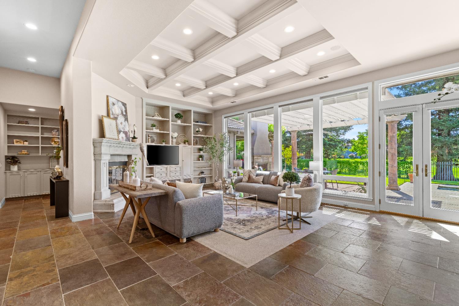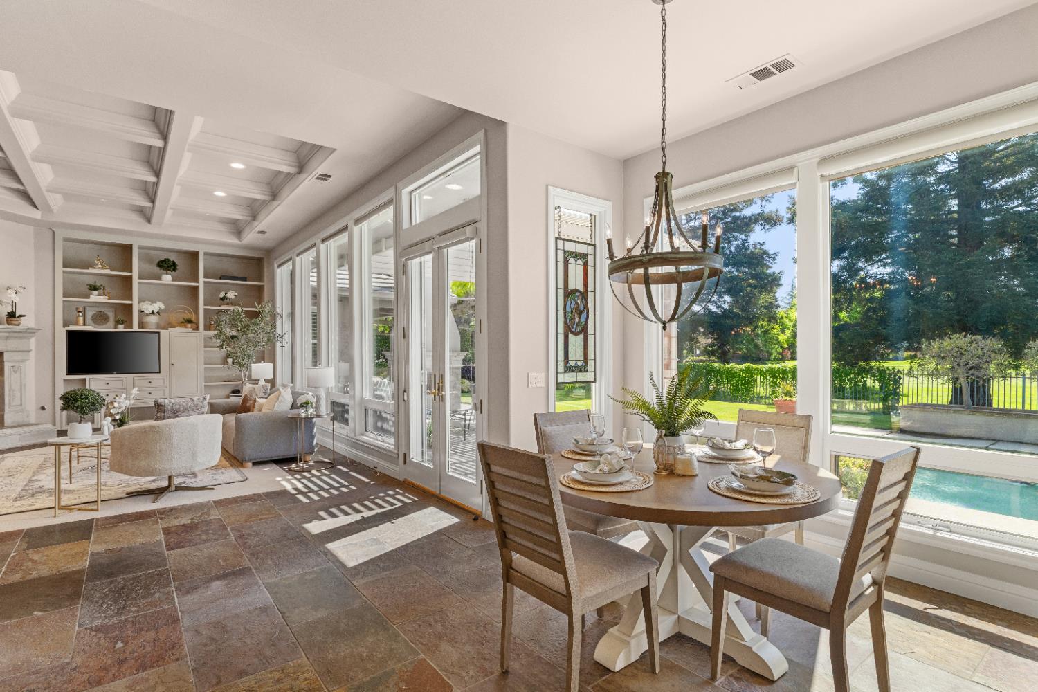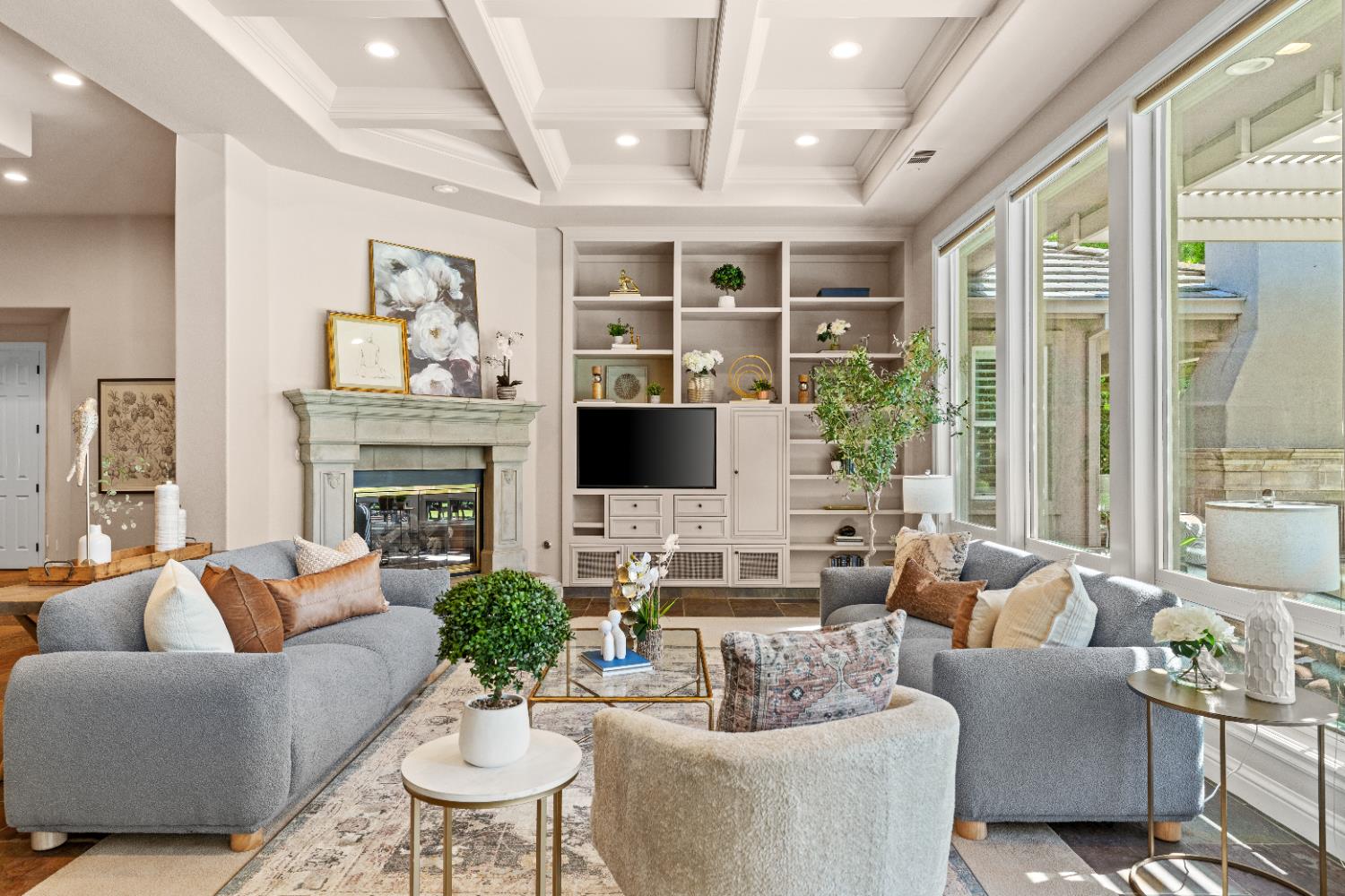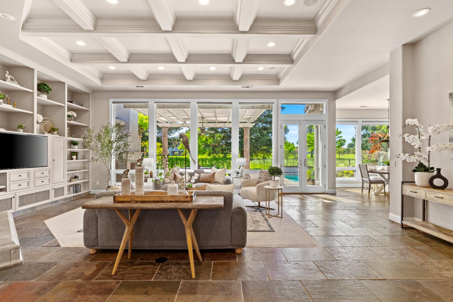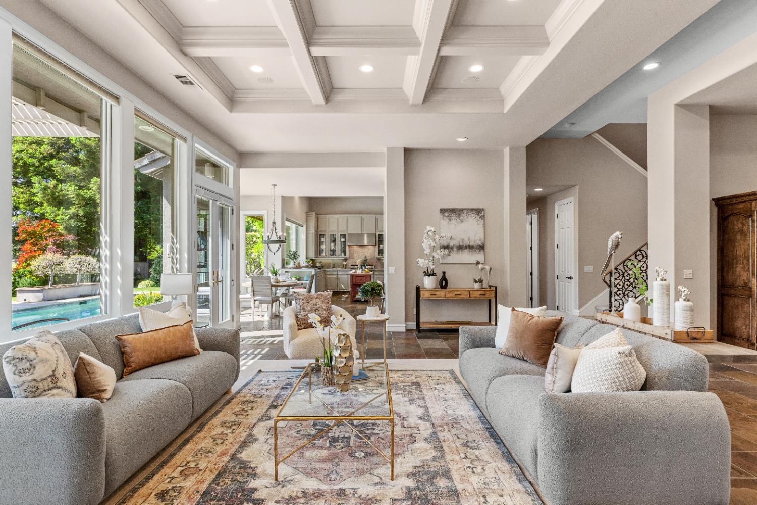 Experience refined living in this mostly single-story masterpiece, perfectly positioned on the golf course with wonderful, picturesque views. Custom-built by a builder for his own family, this exceptional home showcases superior quality, thoughtful design and distinctive craftsmanship throughout. Enter through a private courtyard and large, grand, wood antique double doors into a warm and inviting space. Inside youll find walls of windows that flood the home with natural light, soaring, dramatic, high ceilings, spacious, generous living areas and a highly desirable floor plan featuring primarily single-story living, with only a generous loft upstairs. The formal living room impresses with a stunning coffered ceiling, a beautiful cast stone fireplace, a built-in wall of bookshelves and cabinets and expansive windows overlooking the extensive patio areas, desirable pool and lush golf course beyond. The thoughtfully remodeled kitchen offers abundant counter space, beautiful cabinetry and picturesque views of the pool. A charming breakfast nook provides the perfect spot for casual dining. The luxurious primary suite features its own private patio and a cozy fireplace - ideal for peaceful evenings. Three additional bedrooms provide flexibility, including one currently used as an office and another en suite bedroom, offering the option for dual primary suites. Upstairs, a large loft space serves perfectly as a game room, fitness area or additional office. Set on almost a 1/3 acre lot, the backyard is designed for both relaxation and entertaining. Enjoy expansive patio areas, a dramatic double-sided fireplace and a refreshing pool for summertime enjoyment. Mature trees and a generous setback from the course ensure privacy while preserving breathtaking views. In addition, the four car garage provides ample room for vehicles, storage and hobbies. This is a rare opportunity to own a truly unique and desirable single-story golf course home, where elegance, comfort and lifestyle come together beautifully.