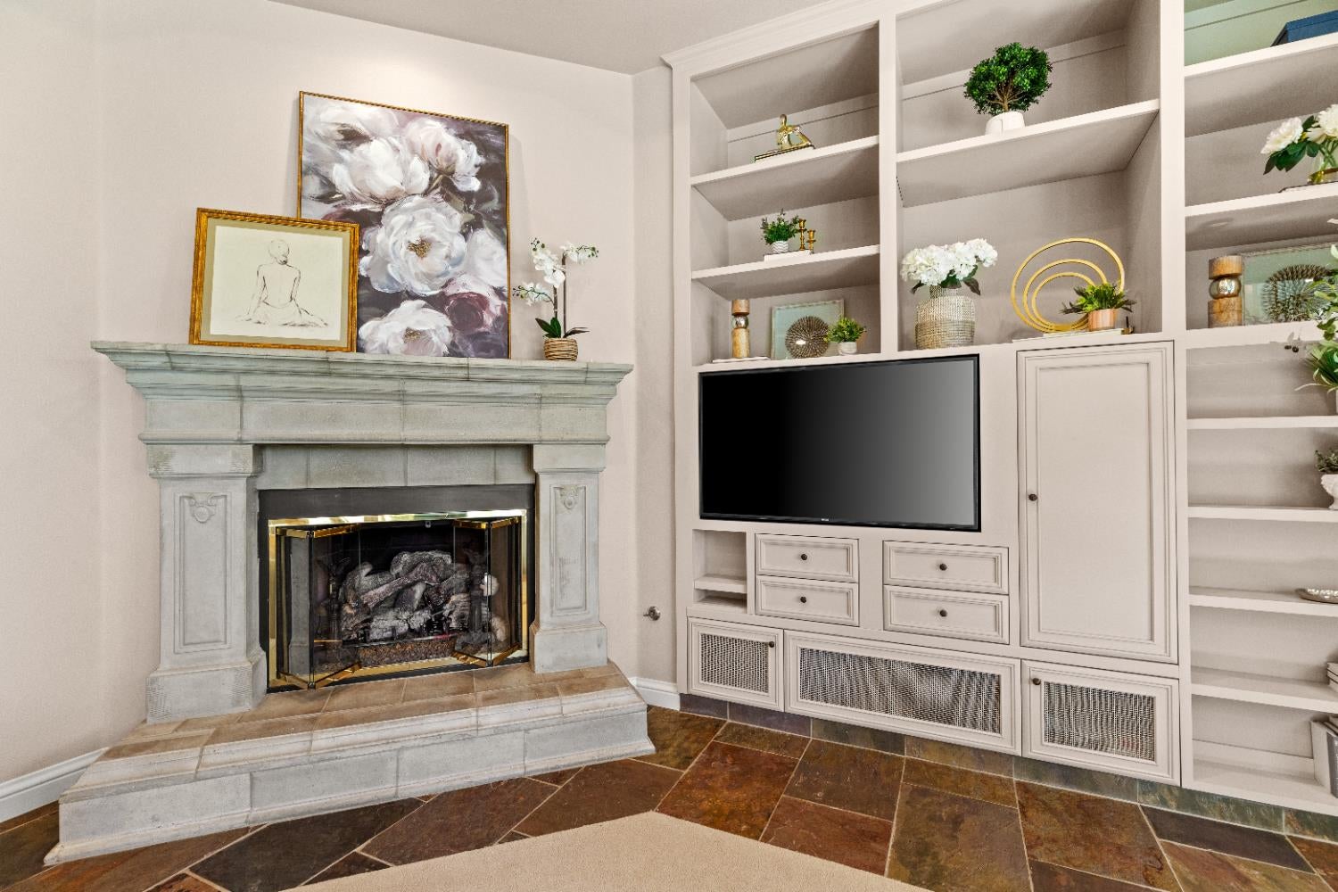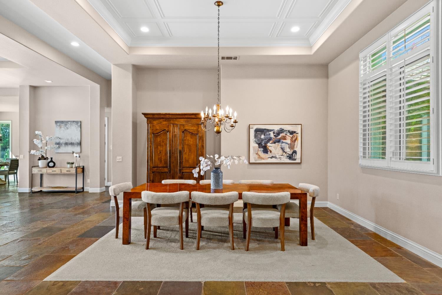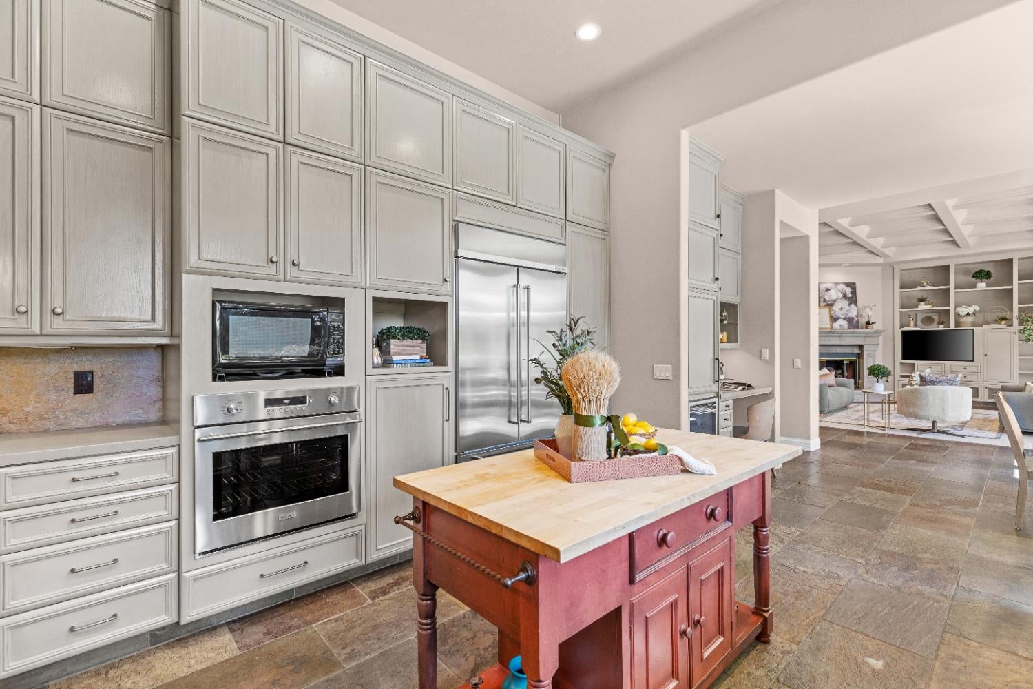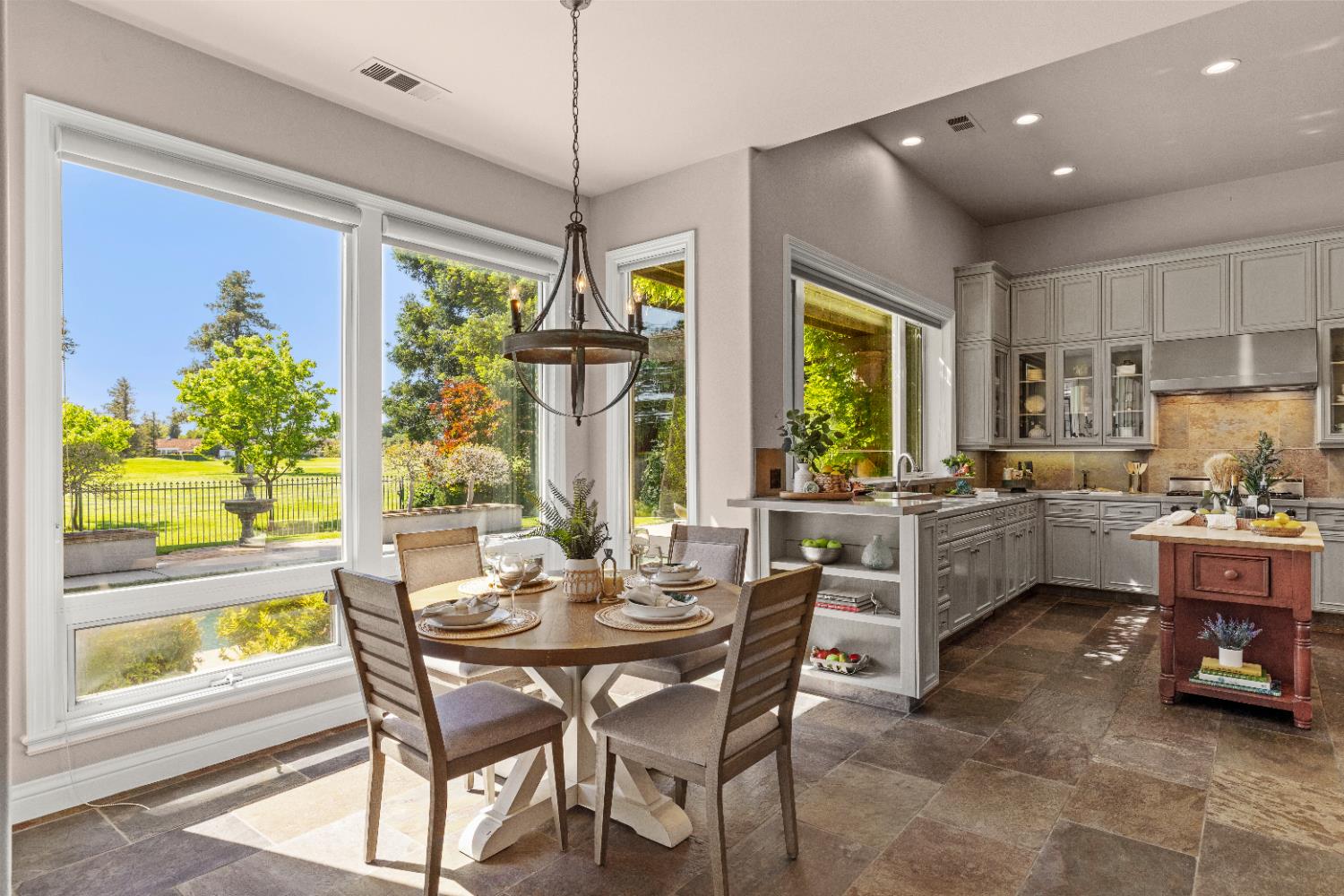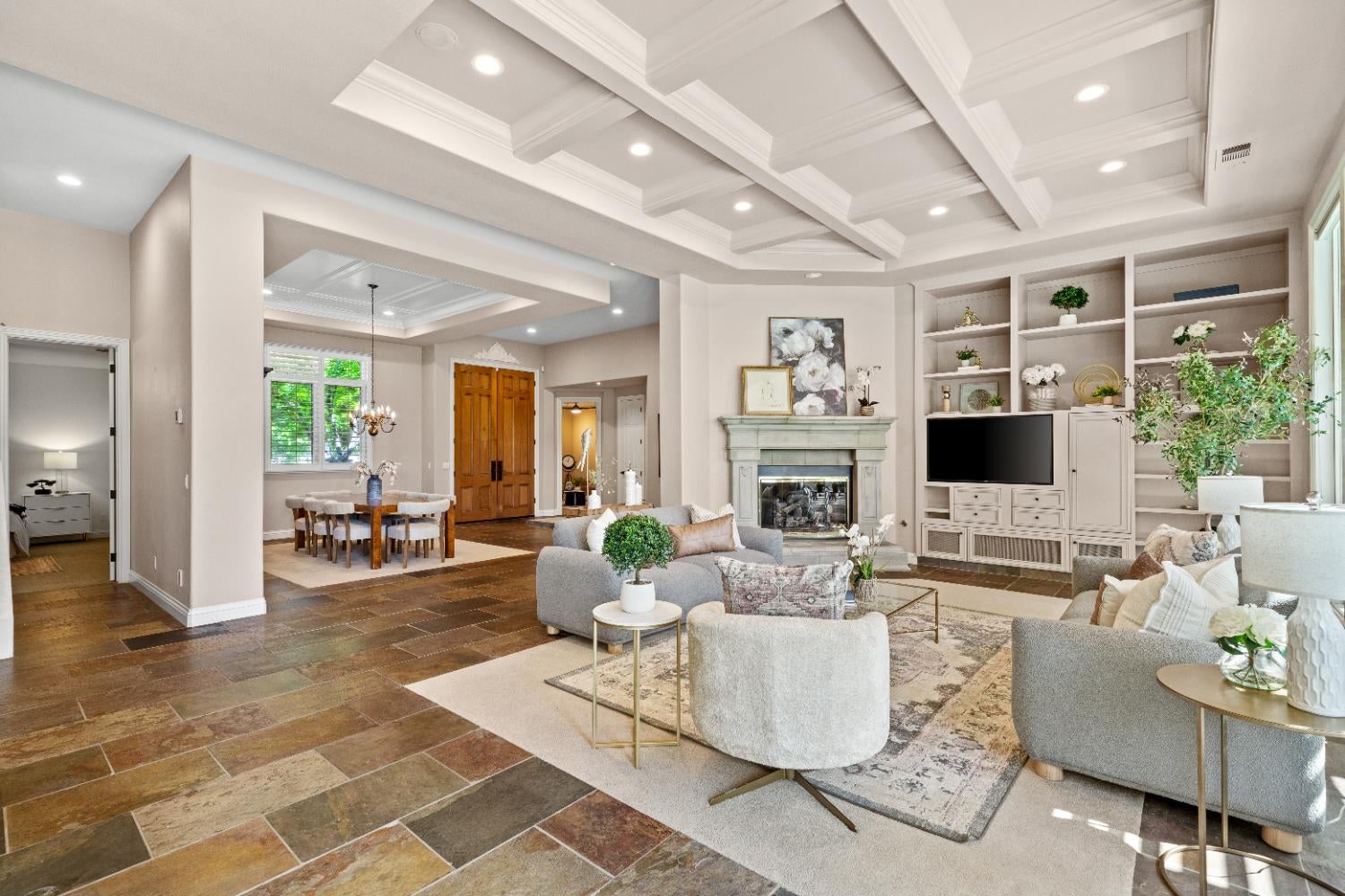 Experience refined living in this mostly single-story masterpiece, perfectly positioned on the golf course with wonderful, picturesque views. Custom-built by a builder for his own family, this exceptional home showcases superior quality, thoughtful design and distinctive craftsmanship throughout. Enter through a private courtyard and large, grand, wood antique double doors into a warm and inviting space. Inside youll find walls of windows that flood the home with natural light, soaring, dramatic, high ceilings, spacious, generous living areas and a highly desirable floor plan featuring primarily single-story living, with only a generous loft upstairs. The formal living room impresses with a stunning coffered ceiling, a beautiful cast stone fireplace, a built-in wall of bookshelves and cabinets and expansive windows overlooking the extensive patio areas, desirable pool and lush golf course beyond. The thoughtfully remodeled kitchen offers abundant counter space, beautiful cabinetry and picturesque views of the pool. A charming breakfast nook provides the perfect spot for casual dining. The luxurious primary suite features its own private patio and a cozy fireplace - ideal for peaceful evenings. Three additional bedrooms provide flexibility, including one currently used as an office and another en suite bedroom, offering the option for dual primary suites. Upstairs, a large loft space serves perfectly as a game room, fitness area or additional office. Set on almost a 1/3 acre lot, the backyard is designed for both relaxation and entertaining. Enjoy expansive patio areas, a dramatic double-sided fireplace and a refreshing pool for summertime enjoyment. Mature trees and a generous setback from the course ensure privacy while preserving breathtaking views. In addition, the four car garage provides ample room for vehicles, storage and hobbies. This is a rare opportunity to own a truly unique and desirable single-story golf course home, where elegance, comfort and lifestyle come together beautifully.
