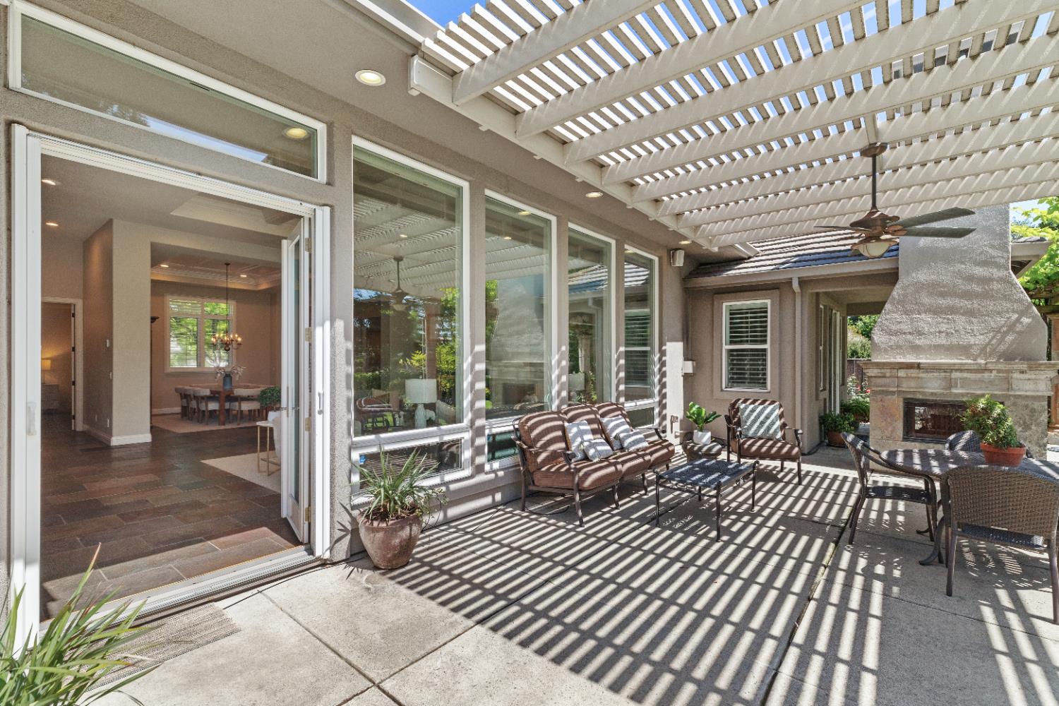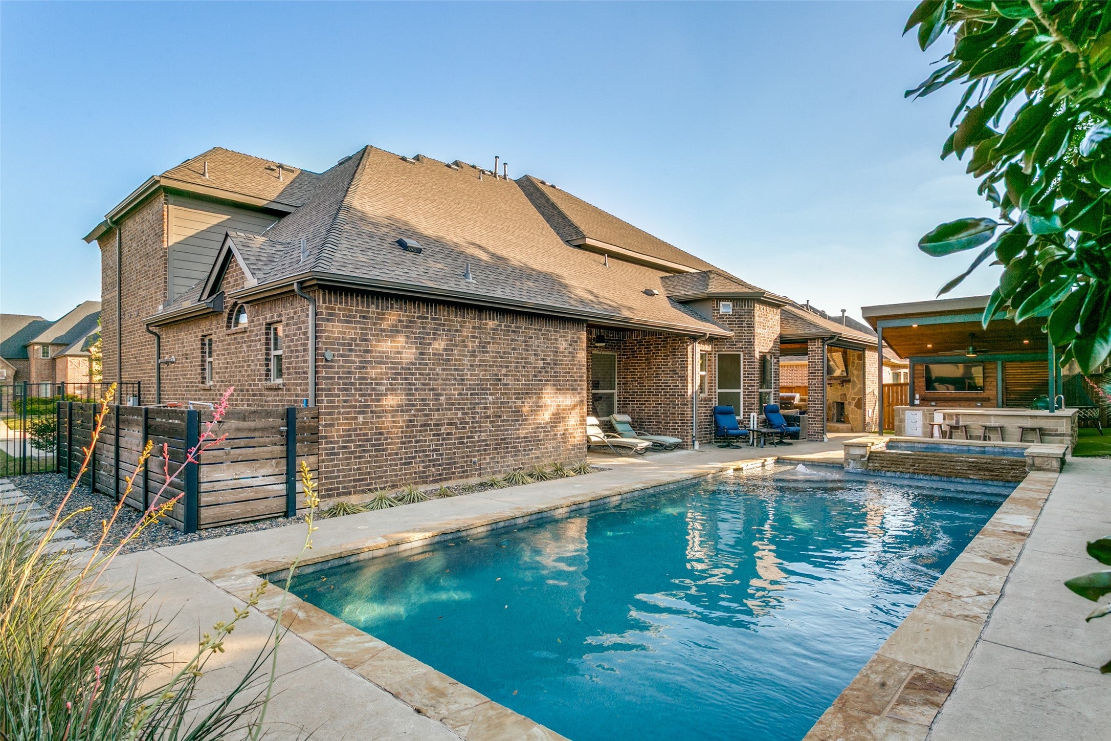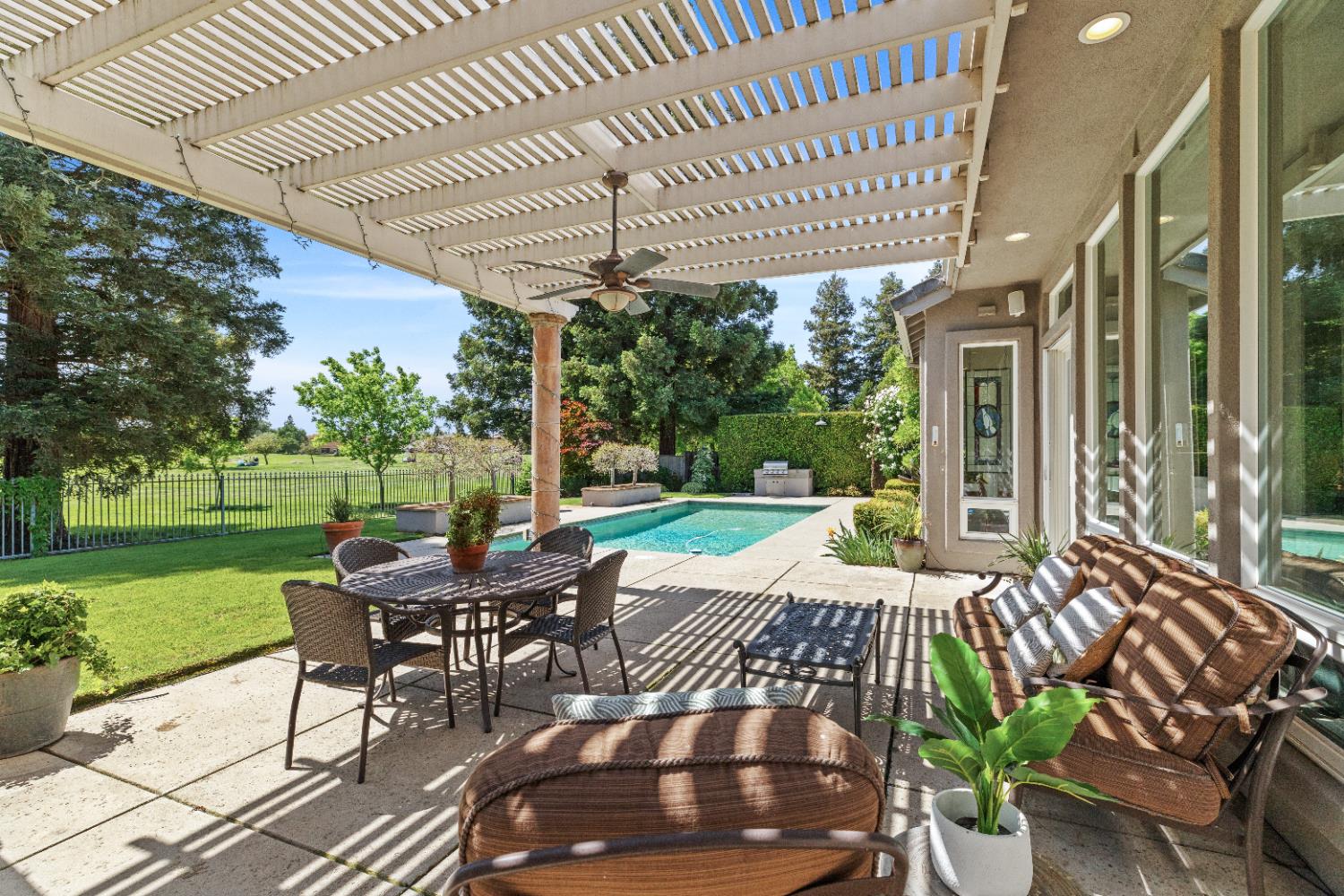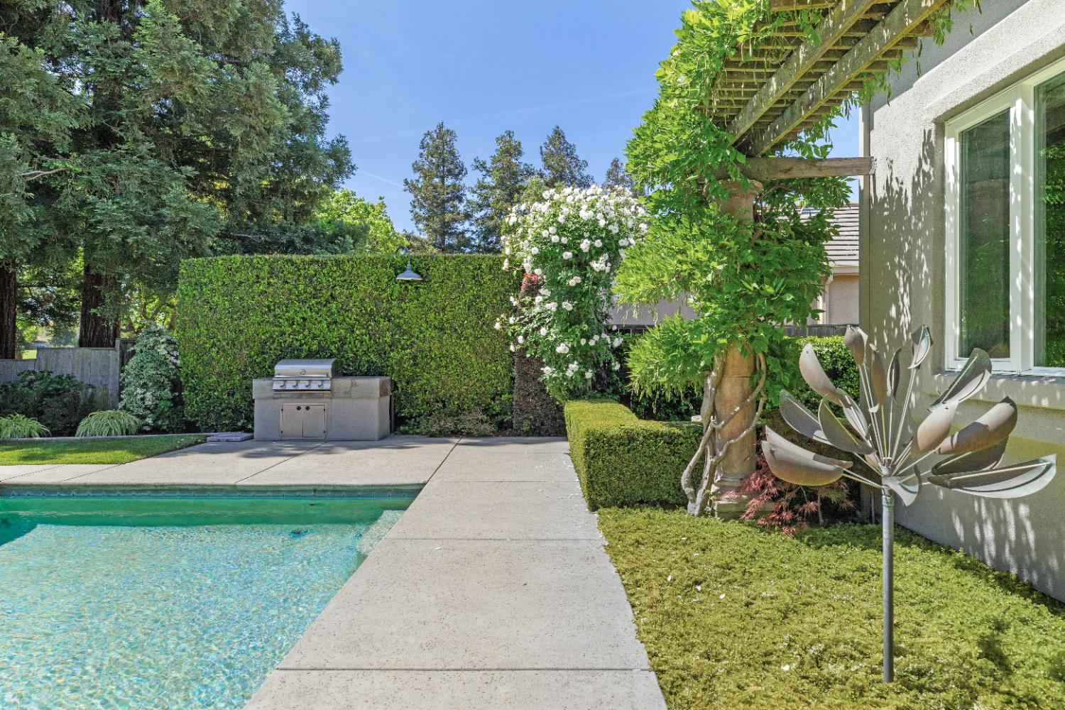 This exceptional original-owner home blends luxury, comfort, and functionality across 5 bedrooms, 5.5 bathrooms, multiple living and dining areas, a dedicated office, game room, media room, and a 3-car garageall centered around a beautiful pool and spa.The grand entry showcases rich hardwood floors and cathedral ceilings that flood the home with natural light. A private office with French doors sits at the front of the home. The open-concept living and dining areas flow seamlessly into the well-appointed kitchen featuring stainless steel appliances, gas cooktop, double ovens, granite countertops, and a beautiful tile backsplash. The breakfast nook overlooks the backyard oasis and opens to the family room.The downstairs primary suite offers a newly renovated spa-inspired bathroom with a striking light fixture, soaking tub, oversized shower, upgraded cabinetry, and dual walk-in closets. A second downstairs bedroom with an ensuite bath provides ideal guest accommodations.Upstairs includes a spacious game room, media room, three bedrooms, 3 full baths, and a versatile study area. Additional highlights include an oversized walk-in attic for exceptional storage.The outdoor living space is designed for year-round enjoyment with a covered patio, remote-control sunscreens, gas grill, pellet smoker, and a cozy fireplace. The outdoor kitchen area sits just steps from the sparkling pool and spa. Conveniently located near schools, parks & golf, this home is the perfect blend of elegance and everyday comfort.