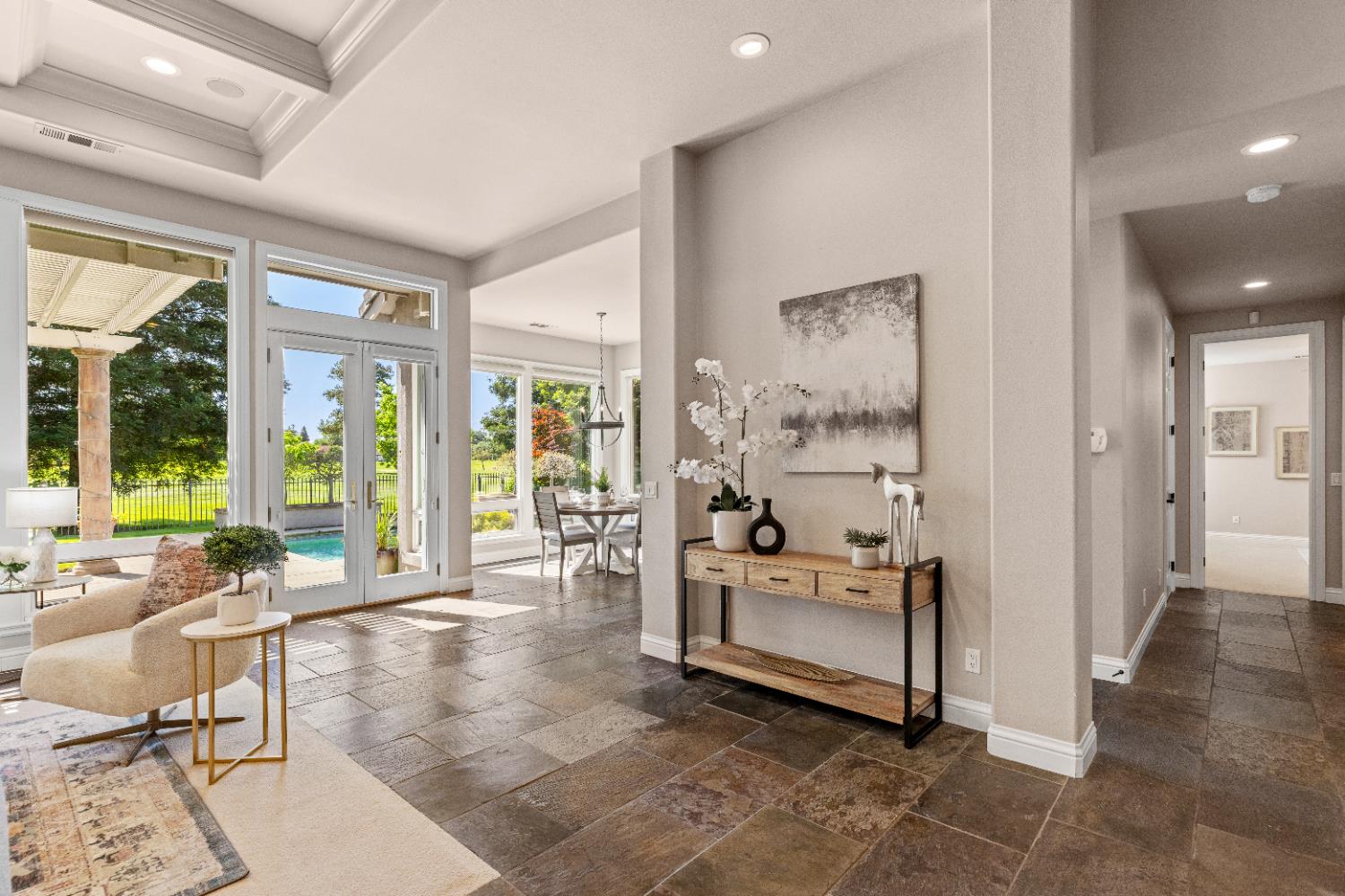 This exceptional original-owner home blends luxury, comfort, and functionality across 5 bedrooms, 5.5 bathrooms, multiple living and dining areas, a dedicated office, game room, media room, and a 3-car garageall centered around a beautiful pool and spa.The grand entry showcases rich hardwood floors and cathedral ceilings that flood the home with natural light.