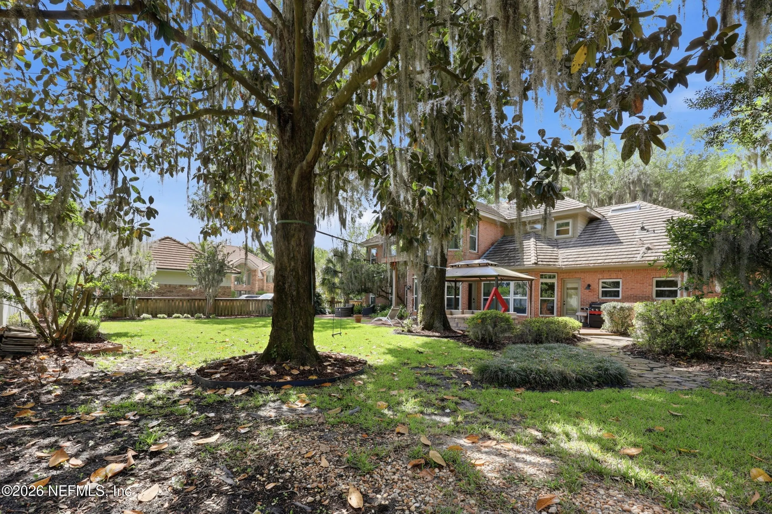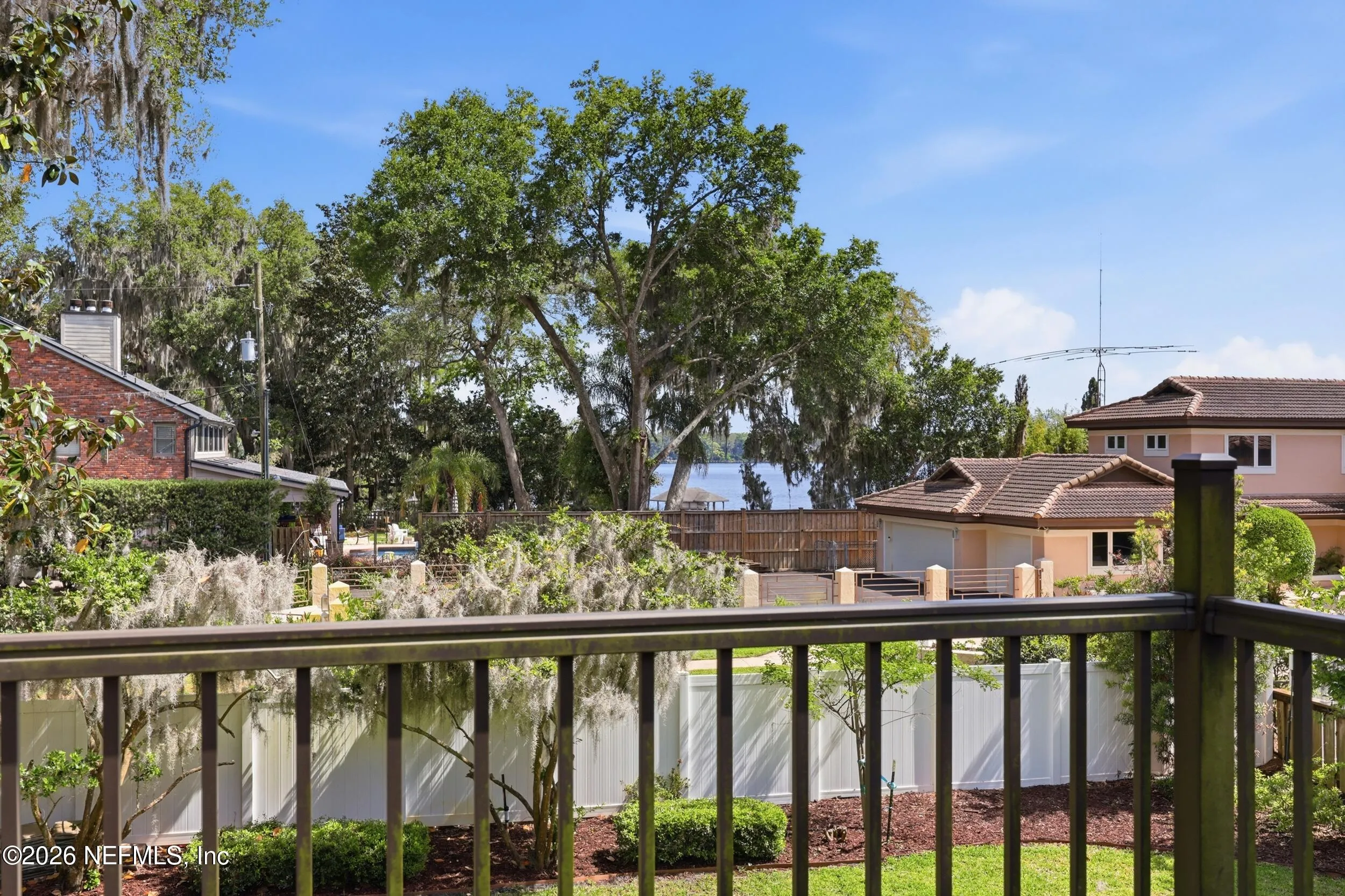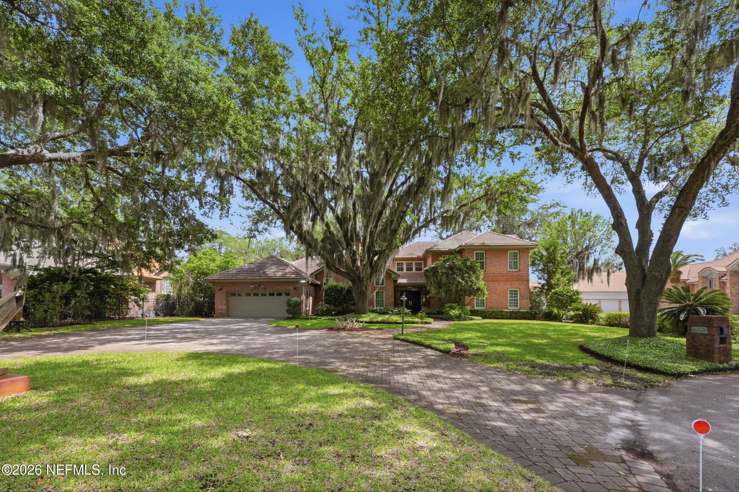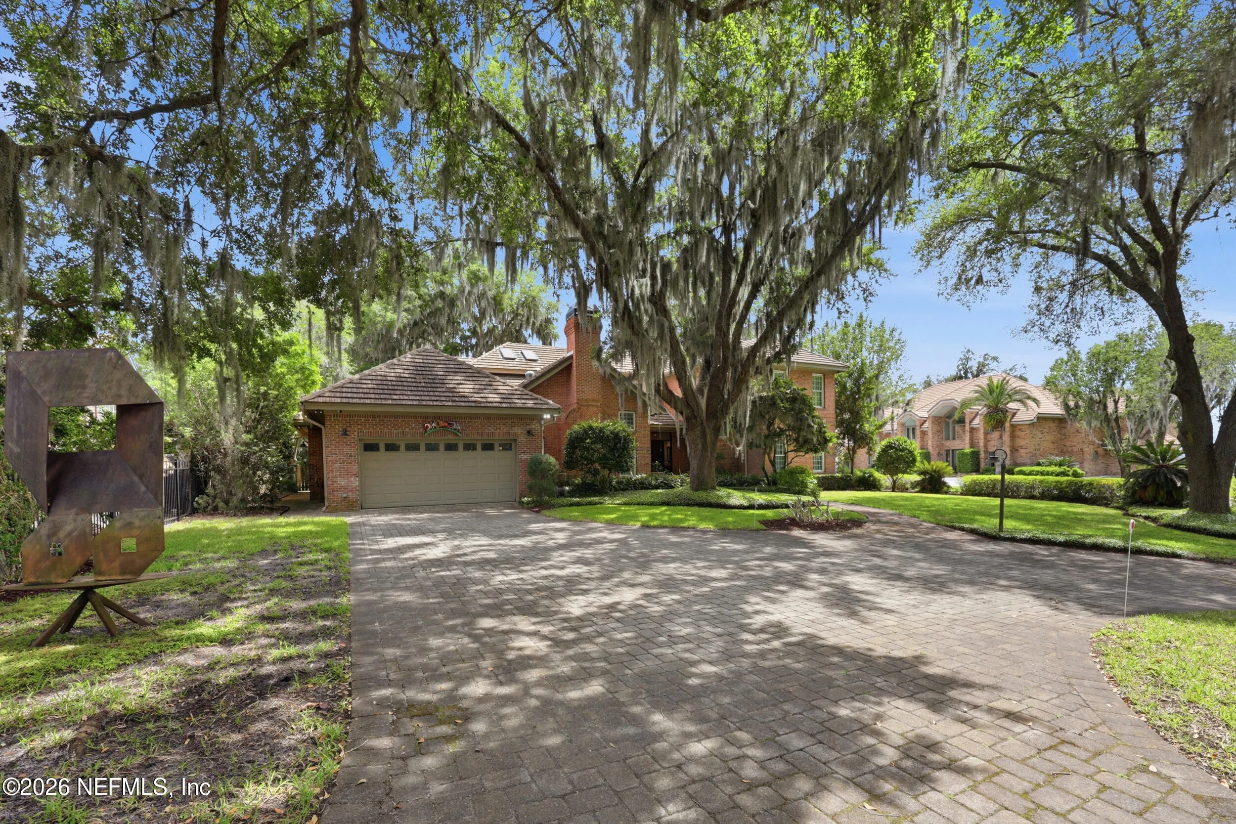 Imagine arriving home to a stately, solid brick residence nestled beneath a canopy of lush, mature oak trees, tucked away on a private cul-de-sac just one home from the river. Located in the highly sought-after Beauclerc/Forest Circle area, this custom-built home by Blosam Constructors showcases timeless architecture among surrounding estate riverfront properties. Inside, youll find spacious, sun-filled rooms with soaring ceilings designed for both comfort and elegance. The recently upgraded eat-in kitchen is a standout feature, highlighted by a striking black-and-white granite island with sink and breakfast bar, stainless steel appliances, abundant cabinetry, and the rare convenience of dual dishwashers--perfect for effortless entertaining. The dramatic two-story living room features an entire wall of windows, filling the space with natural light and creating an inviting setting for gatherings. Just off the kitchen, a charming round sunroom offers flexible use as a breakfast area, playroom, or tranquil reading retreat. The den/family room, complete with a wood-burning fireplace, provides a cozy space for relaxing evenings. The first floor also includes a private au pair, nanny, or in-law suite with its own bathroom and separate entrance. Two additional bedrooms share a bath, with one currently serving as a home office. Upstairs, the expansive primary suite features a private balcony with river views, creating a peaceful retreat. Two additional bedrooms share a Jack-and-Jill bathroom with individual vanities. Laundry is conveniently located both upstairs near the primary suite and downstairs near the kitchen. Recent upgrades include a whole-home Generac generator, a newer two-car garage, and updated windows and doors throughout, enhancing both comfort and efficiency.