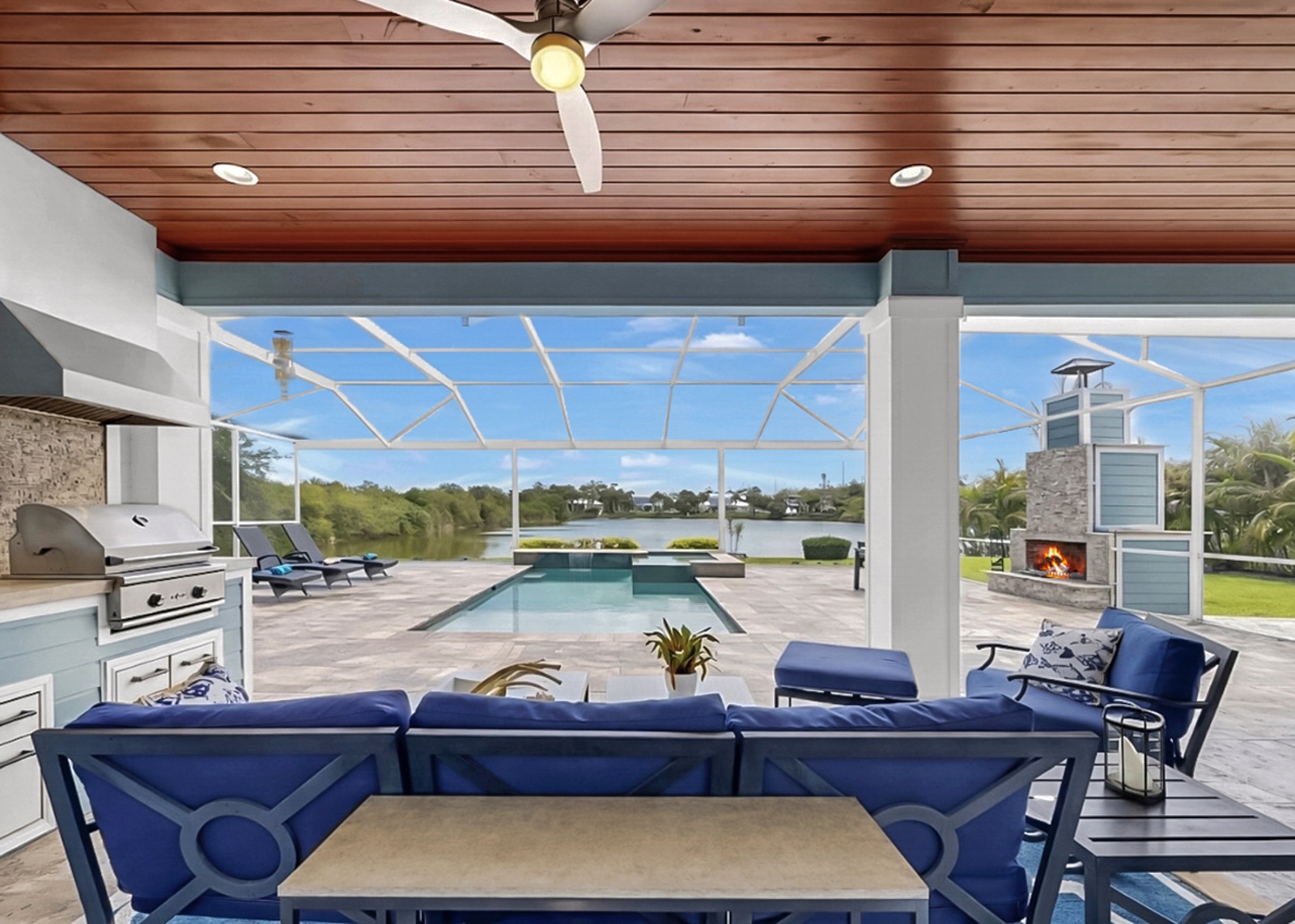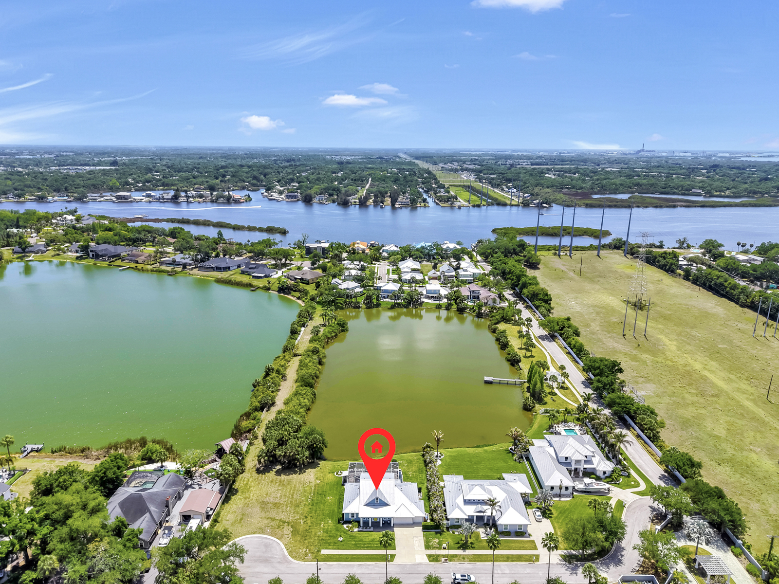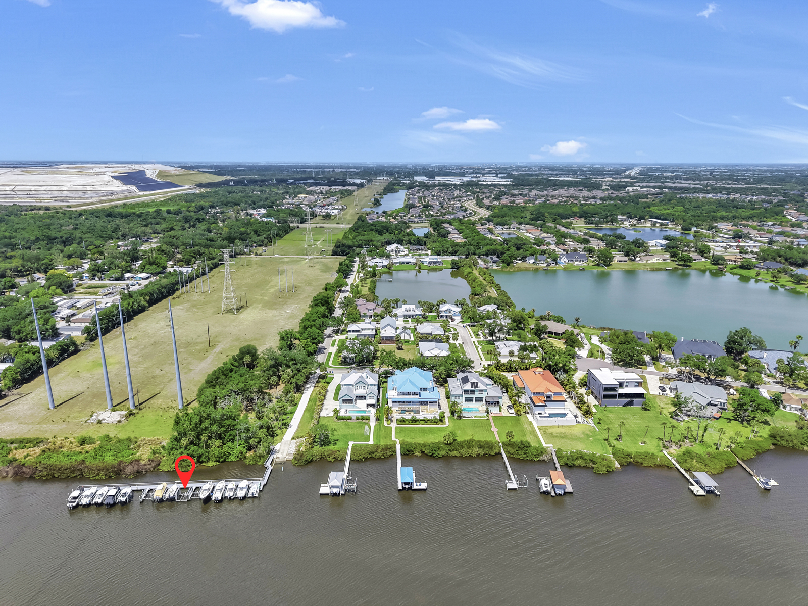 Welcome to your personal paradise where the allure of waterfront living meets high-end luxury and NO FLOOD INSURANCE required. A rare opportunity to live in a Key West inspired private community of Key West Landings on the Alafia River off of Tampa Bay. This gated oasis of only 18 homes, with DEEDED BOAT SLIPS offers a lifestyle that dreams are made of. Imagine stepping into a world where palm trees sway gently in the breeze, surrounded by mature landscape with grand oaks and the tranquil waters of the Alafia River invite you to explore.This stunning executive home boasts a coveted boat slip with lift, setting the stage for sunset cruises and boating adventures. The Alafia River offers a unique Old Florida charm with several water front restaurants. Only minutes to Tampa Bay with the contrast of skyline views, sandy beach islands and all the excitement of the Riverwalk. This is a true boaters paradise.Nature is calling, unwind on this oversized lot with views of a private 4 acre lake stocked and ready for bass fishing. Bird lovers will enjoy the endless variety and your own aviary off of the lanai.The heart of the home is the expansive living room, where French doors open to reveal an enormous pavered lanai. The centerpiece is a resort style pool, outdoor living with al fresco dinning, and a dream outdoor kitchen. Imagine gatherings around the 4-foot-wide fireplace, under the stars, creating memories that last a lifetime.Walk through the grand entrance to discover a haven of comfort and style. The downstairs primary suite is a sanctuary with two walk-in closets and a spa inspired bath featuring separate double vanities, a frameless glass shower, and a sleek freestanding tub. A second primary or guest suite, study, and laundry room complete this level, ensuring convenience and privacy.Upstairs, two more bedrooms sharing a jack and jill bath and an oversized loft offer space for family and guests. Throughout the home, 10-foot ceilings and 8-foot doors create an airy, open feel. The kitchen is a chefs delight with quartz counters, Thermador and Bosch appliances, and 42-inch maple cabinetry.This home is equipped with high end upgrades, from the exterior Hardie board siding, metal roof, Low E double pane hurricane impact windows, a full-house water filtration system, and an invisible dog fence. Recent updates ensure peace of mind, with a new pool screen, freshly resealed pool tiles, and a new pool heater and air conditioning system.In this idyllic waterfront community, every day feels like a vacation. Step into a life where elegance meets adventure, and tranquility is part of your everyday routine.Seize this opportunity to own a piece of paradise. Your dream home awaits.