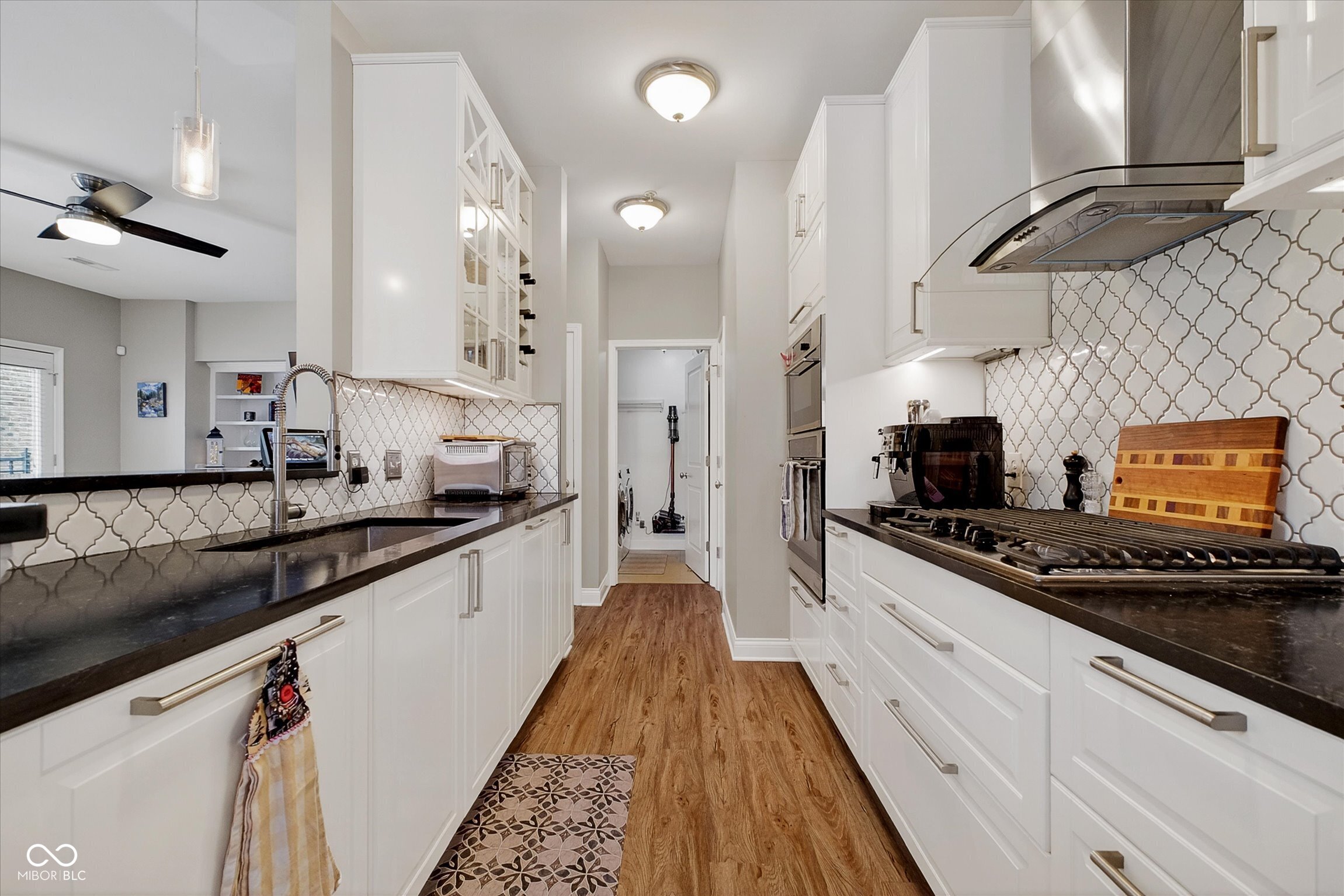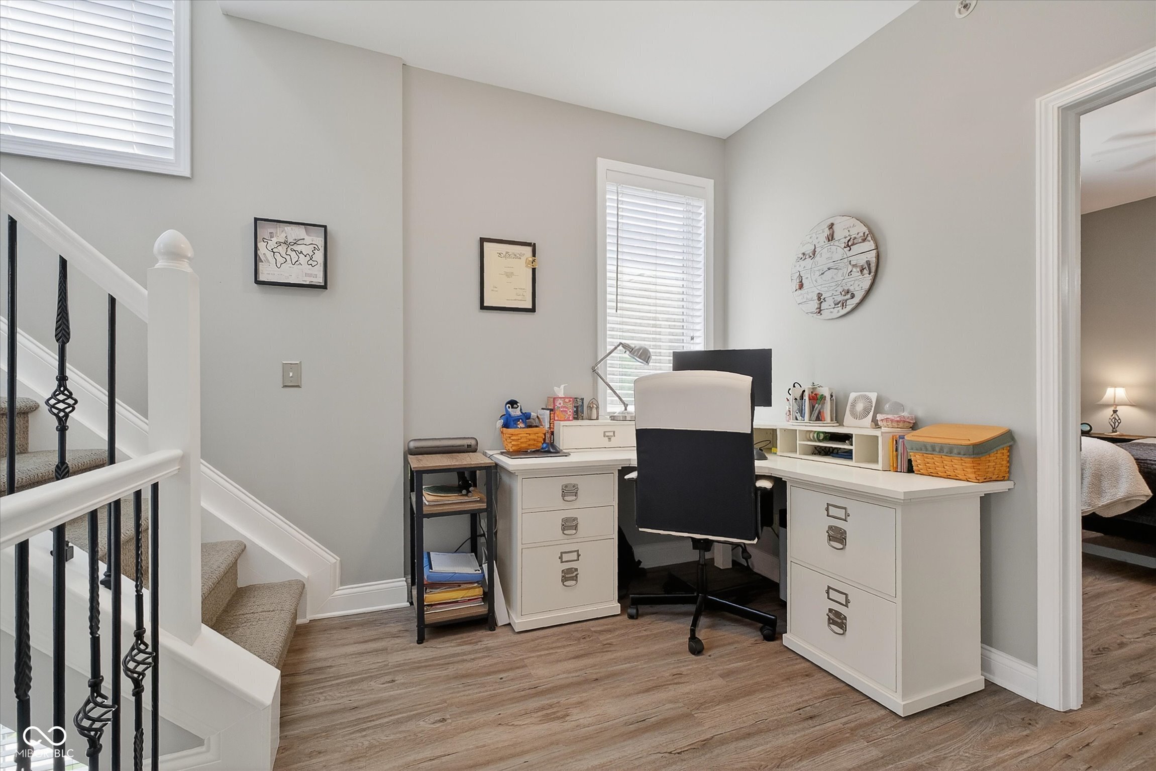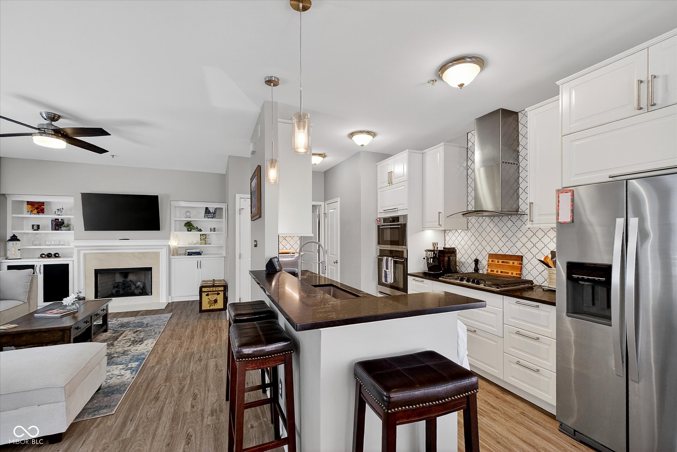 Unique four-story townhome that lives like a single-family residence! Ideally located in the heart of the Lockerbie Square within Desoto Condominiums, this exceptional unit is attached only at the rear, allowing for abundant natural light through multiple exposures. The main living level features a fully renovated, open-concept galley kitchen with generous cabinetry, seamlessly flowing into the spacious living and dining areas. A double set of French doors lines the south side of the unit while another set leads to the front-facing balcony-perfect for entertaining or relaxing. Upstairs, the landing provides an ideal space for a home office. Both bedrooms are generously sized and include en-suite bathrooms along with well-designed closet storage. The top level offers a private rooftop deck with stunning views of downtown Indianapolis. The lower level includes an oversized garage with built-in storage and a versatile bonus room-ideal for a home office, gym, or flex space. This area could potentially be converted into a third bedroom, as original plans included a window that could be added. Enjoy a walkable lifestyle with easy access to Mass Ave & the Circle with nearby dining, coffee, and shopping. Local favorites include Vida, Red Door Cafe, and Parlor Public House.