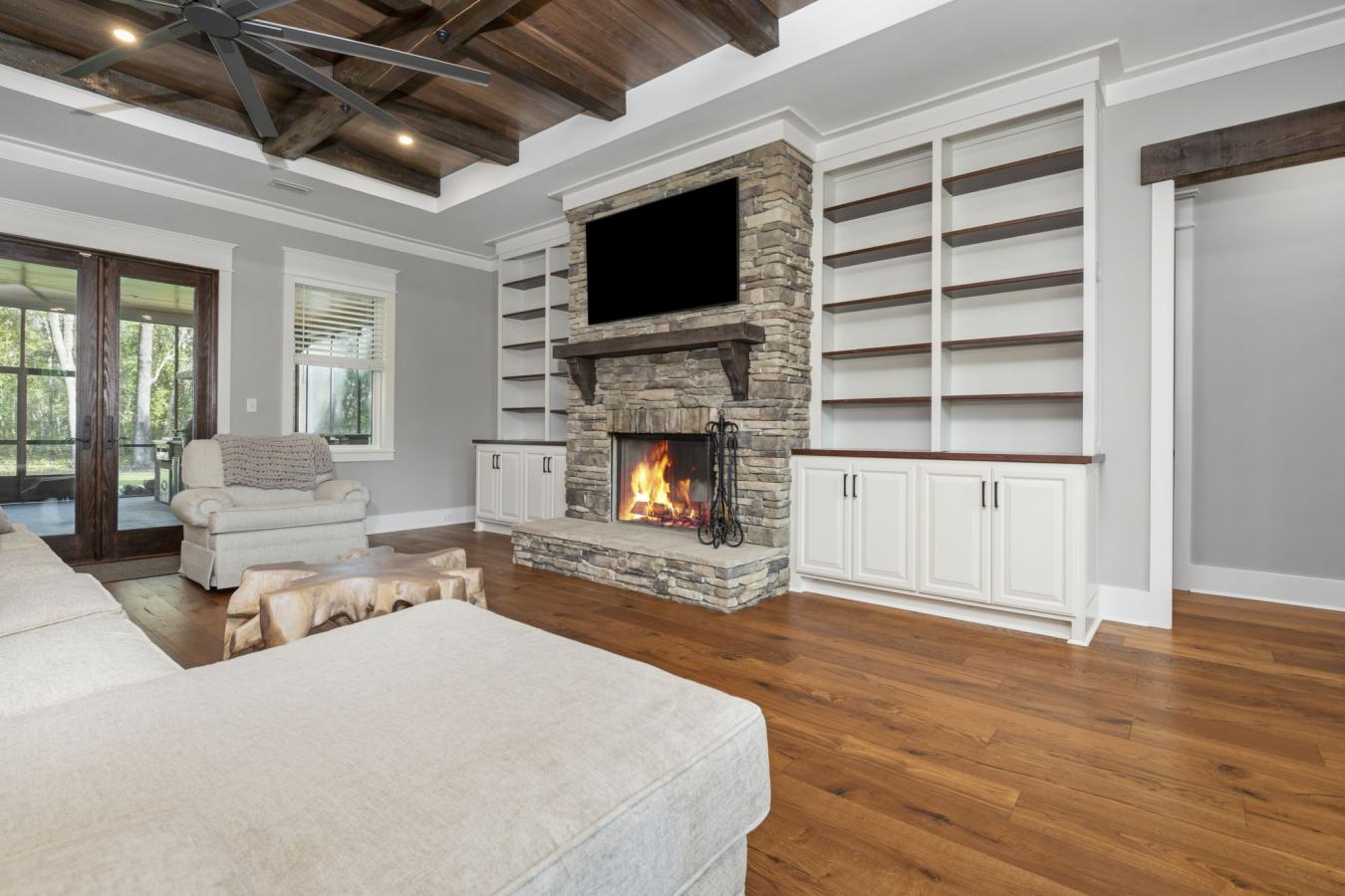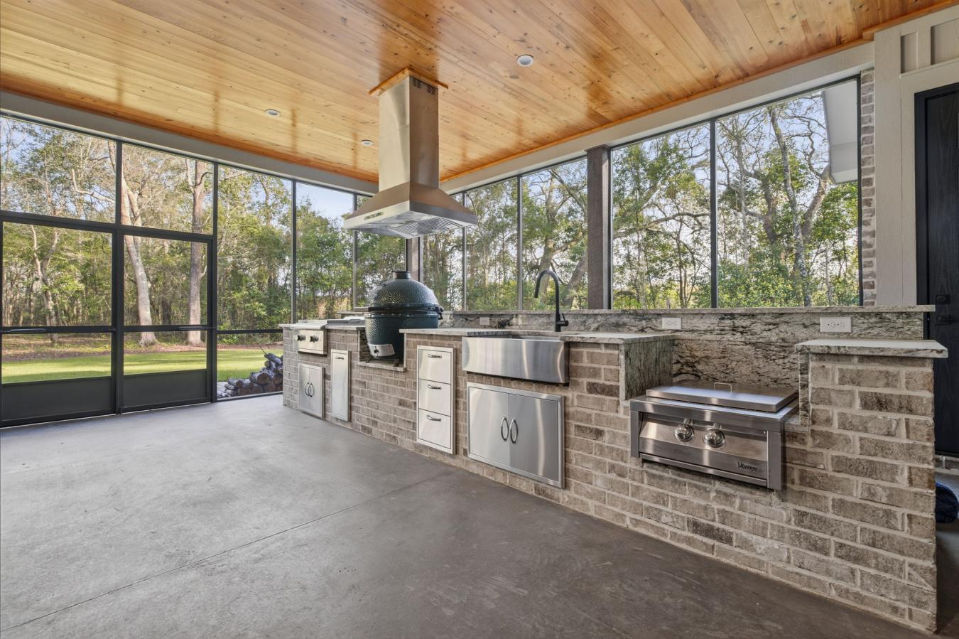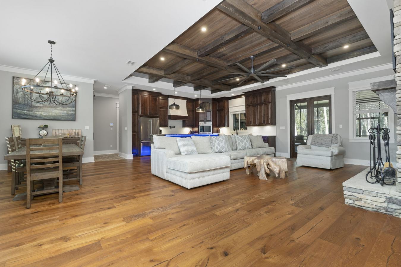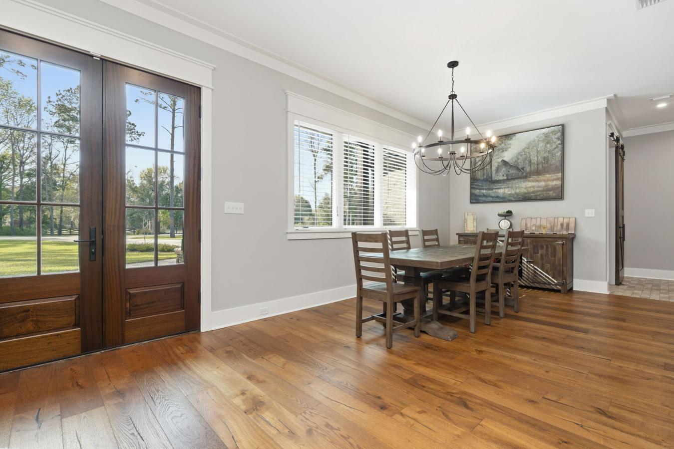 Welcome to 9501 Ben Hamilton Road! A spectacular GOLD-FORTIFIED custom-built home completed in 2023, nestled on 5.5 beautiful acres with a mix of cleared land and wooded privacy, offering an exceptional blend of luxury, comfort, and nature. The main home features 4,557 sq. ft. of heated and cooled living space, with an additional 1,786 sq. ft. heated and cooled garage, creating an incredible amount of functional space for everyday living, storage, hobbies, and entertaining. Designed with both comfort and style in mind, the main level features an open-concept layout connecting the kitchen, living, and dining areas. The chefs kitchen is beautifully appointed with quartz countertops, double ovens, a five-burner gas cooktop, stainless farmhouse sink, drawer microwave, and a spacious walk-in pantry with its own freezer. The family room is anchored by a striking stone wood-burning fireplace with gas starter, framed by custom built-in bookcases. The oversized primary suite is a true retreat, highlighted by a double tray ceiling and a spa-inspired bath with a soaking tub, walk-in shower with multiple shower heads, and a customized walk-in closet. Conveniently tucked nearby for privacy is the well-equipped laundry room featuring Electrolux appliances, cabinetry, and countertop workspace. On the opposite side of the home, two additional bedrooms each offer private en-suite baths and walk-in closets with built-ins. Upstairs, youll find an oversized rec room, a fourth bedroom currently serving as an exercise room with cushioned flooring, a full bath, dedicated office area, and a walk-up attic providing outstanding storage. The outdoor living spaces are just as impressive. The screened back porch is built for entertaining, featuring a full outdoor kitchen with hibachi grill, Green Egg grill, broiler, wood-burning fireplace with gas starter, and space for TVs. The heated and cooled triple garage includes a third bay with a 14 x 12 door designed to accommodate an RV or boat, plus sewer and power hookups for RV use. Additional features include engineered hardwood flooring and tile throughout, cypress wood accents on tray ceilings in the living room, garage, and back porch, LED lighting in the kitchen and primary suite, three HVAC systems, irrigation system, central shop vac, and a current termite bond that conveys. With GOLD-FORTIFIED construction, new custom craftsmanship, acreage, and high-end details throughout, this is truly a rare find.