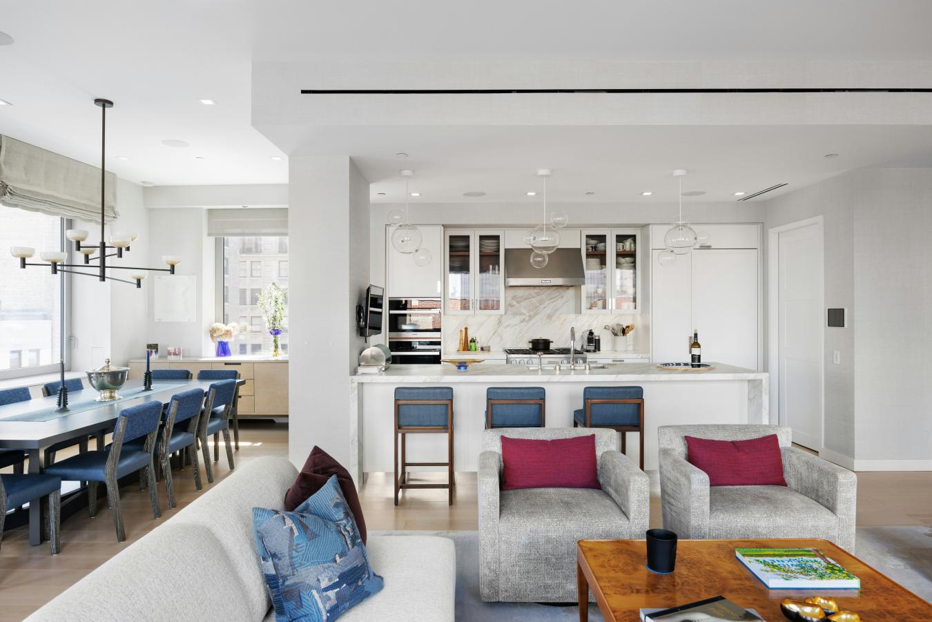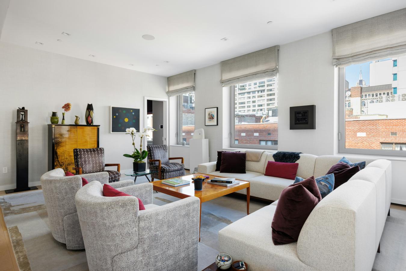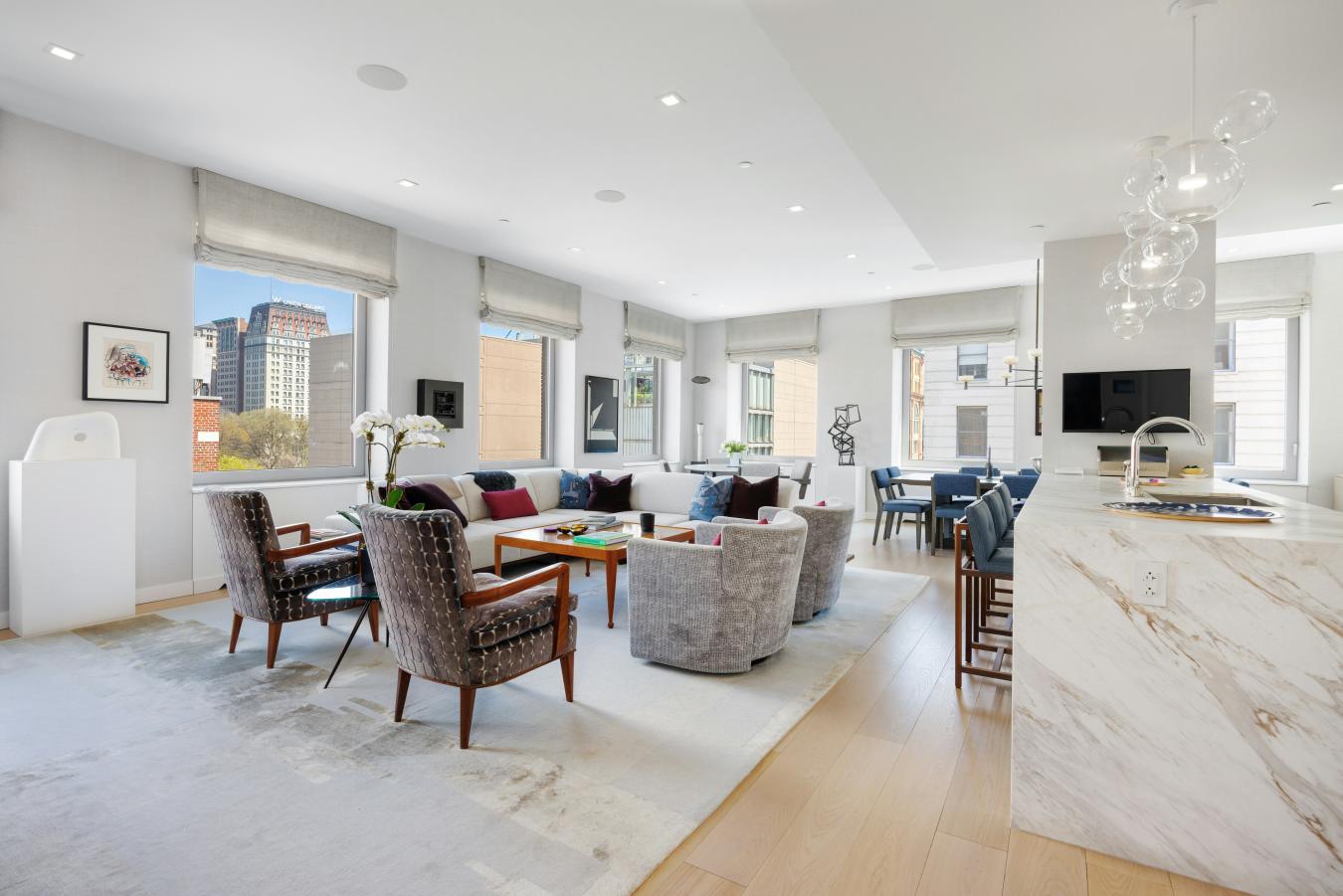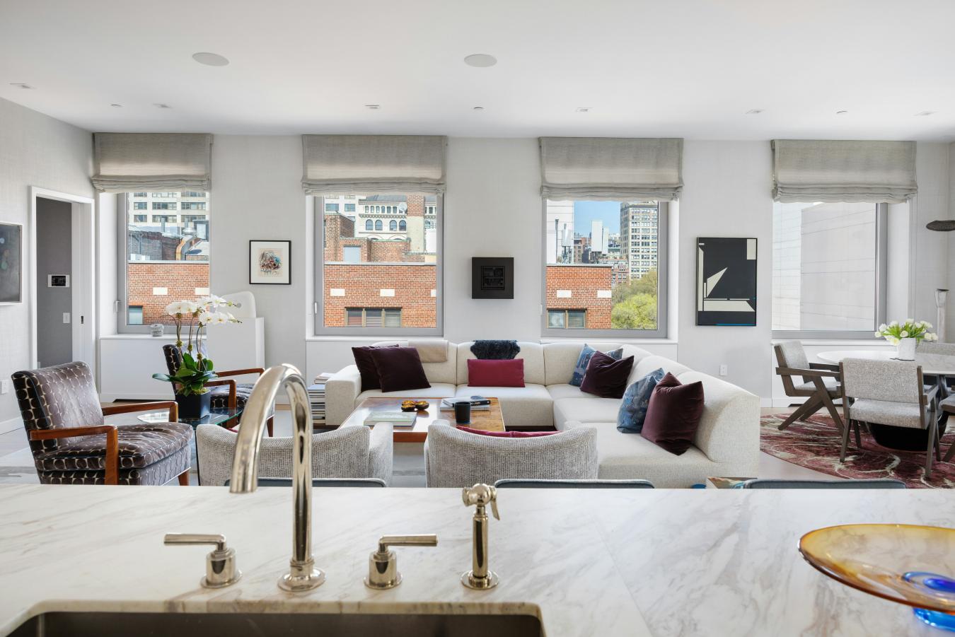 Penthouse Paradise in the Heart of Greenwich Village! Perched atop one of downtowns most coveted addresses, this exceptional full-floor penthouse offers the ultimate expression of modern Village living. Designed by Morris Adjmi Architects and masterfully curated by acclaimed interior designer Amie Weitzman, this three-bedroom residence with a library (or fourth bedroom) seamlessly blends refined contemporary design with warm, livable elegance. Spanning approximately 3,127 square feet of interior space, the home is complemented by a spectacular 1,361-square-foot private roof terrace-fully landscaped, irrigated, and equipped with an outdoor kitchen-ideal for alfresco dining, entertaining, or simply taking in sweeping views toward Union Square and across downtown Manhattan. A private elevator opens directly into a grand entrance gallery, leading to expansive corner living and dining areas framed by 16 oversized windows and nearly 11-foot ceilings. Flooded with natural light from both north and south exposures, these spaces offer an airy, loft-like feel while maintaining a sense of intimacy and sophistication. The chefs kitchen, custom-designed by Smallbone of Devizes, is both striking and highly functional. It features hand-painted cabinetry, Calacatta marble countertops and backsplash, and a dramatic waterfall island. Top-of-the-line Miele appliances include a six-burner gas range, dual ovens, two dishwashers, a wine refrigerator, and a generous walk-in pantry-perfectly suited for both everyday living and entertaining. Private quarters are thoughtfully separated and equally impressive. The primary suite is a serene retreat, complete with a dressing area and over 28 linear feet of custom-designed walk-in closet space. Its spa-like, windowed bathroom features a beautiful walnut double vanity, deep soaking tub, and oversized glass-enclosed shower, finished in exquisite Calacatta and limestone. Additional bedrooms offer open city views and are complemented by beautifully appointed bathrooms. Additional highlights include wide-plank white oak flooring, multi-zone HVAC, integrated sound wiring, a utility room with vented washer/dryer and sink, and abundant storage. Two private storage units transfer with the residence. 116 University Place offers a full-service lifestyle with an attended lobby and state-of-the-art fitness center, embodying the very best of downtown luxury living!