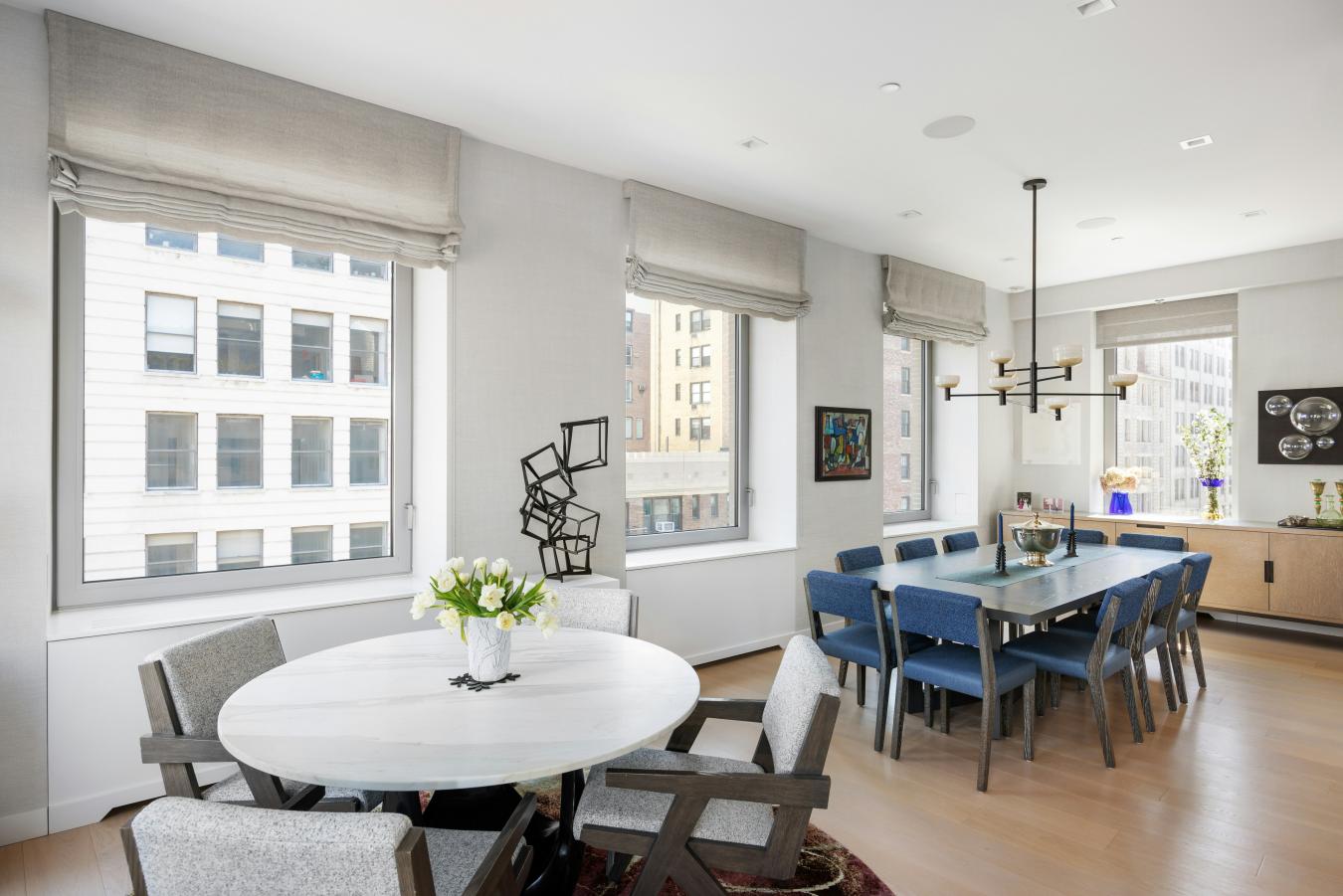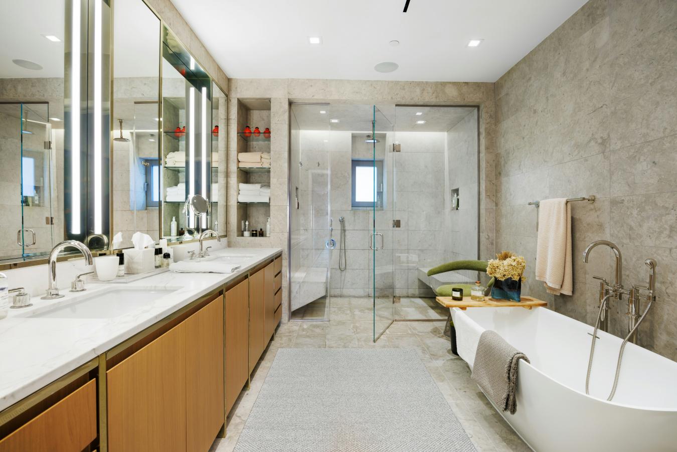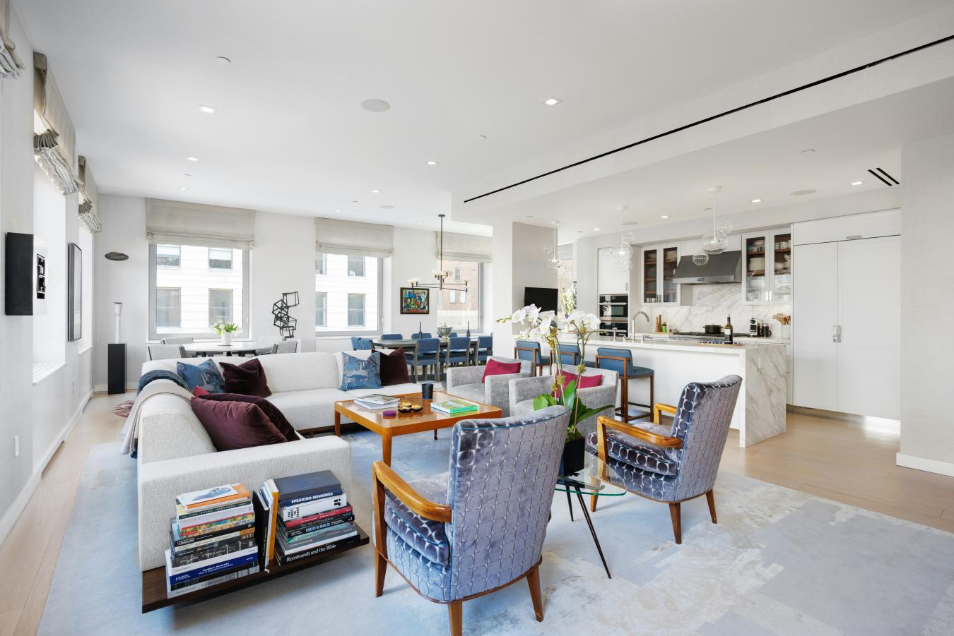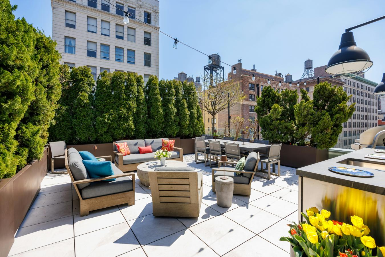 Penthouse Paradise in the Heart of Greenwich Village! Perched atop one of downtowns most coveted addresses, this exceptional full-floor penthouse offers the ultimate expression of modern Village living. Designed by Morris Adjmi Architects and masterfully curated by acclaimed interior designer Amie Weitzman, this three-bedroom residence with a library (or fourth bedroom) seamlessly blends refined contemporary design with warm, livable elegance. Spanning approximately 3,127 square feet of interior space, the home is complemented by a spectacular 1,361-square-foot private roof terrace-fully landscaped, irrigated, and equipped with an outdoor kitchen-ideal for alfresco dining, entertaining, or simply taking in sweeping views toward Union Square and across downtown Manhattan. A private elevator opens directly into a grand entrance gallery, leading to expansive corner living and dining areas framed by 16 oversized windows and nearly 11-foot ceilings. Flooded with natural light from both north and south exposures, these spaces offer an airy, loft-like feel while maintaining a sense of intimacy and sophistication. The chefs kitchen, custom-designed by Smallbone of Devizes, is both striking and highly functional. It features hand-painted cabinetry, Calacatta marble countertops and backsplash, and a dramatic waterfall island. Top-of-the-line Miele appliances include a six-burner gas range, dual ovens, two dishwashers, a wine refrigerator, and a generous walk-in pantry-perfectly suited for both everyday living and entertaining. Private quarters are thoughtfully separated and equally impressive. The primary suite is a serene retreat, complete with a dressing area and over 28 linear feet of custom-designed walk-in closet space. Its spa-like, windowed bathroom features a beautiful walnut double vanity, deep soaking tub, and oversized glass-enclosed shower, finished in exquisite Calacatta and limestone. Additional bedrooms offer open city views and are complemented by beautifully appointed bathrooms. Additional highlights include wide-plank white oak flooring, multi-zone HVAC, integrated sound wiring, a utility room with vented washer/dryer and sink, and abundant storage. Two private storage units transfer with the residence. 116 University Place offers a full-service lifestyle with an attended lobby and state-of-the-art fitness center, embodying the very best of downtown luxury living!