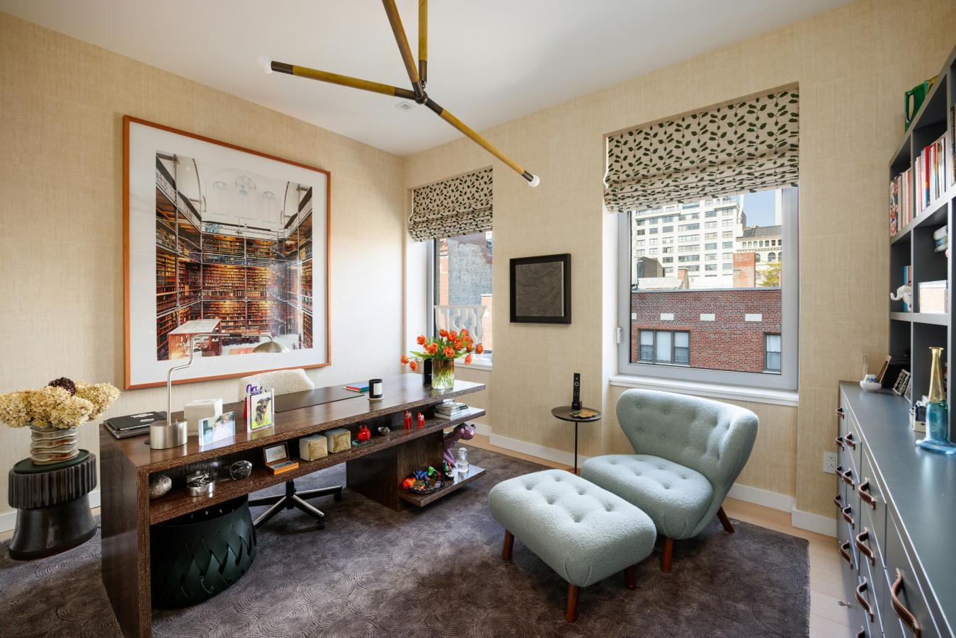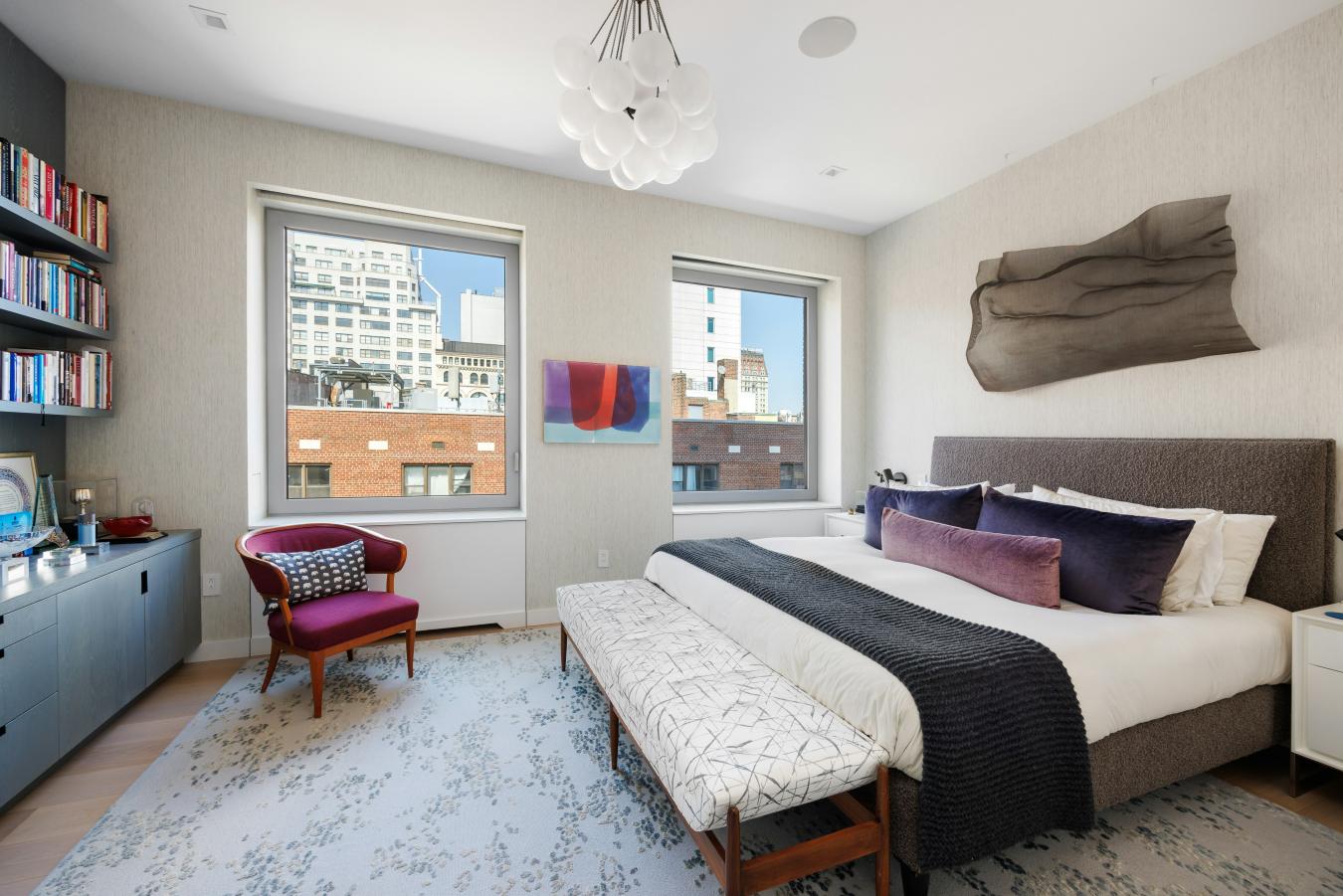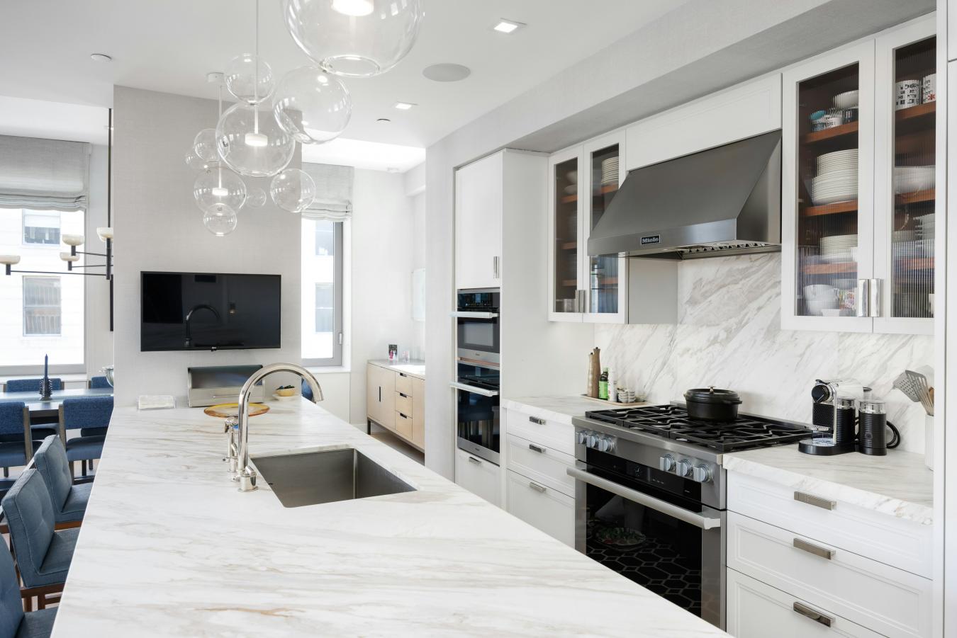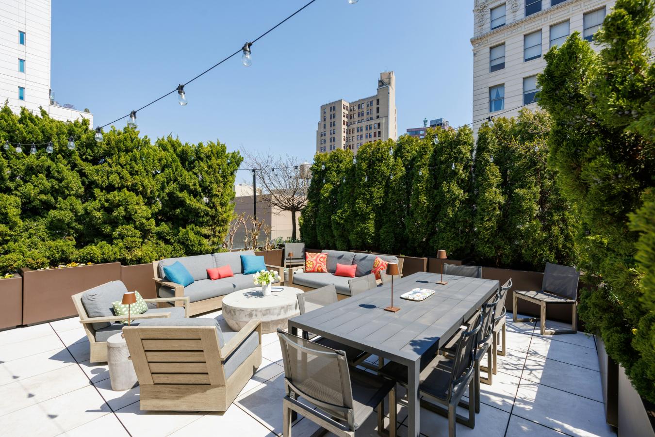 Penthouse Paradise in the Heart of Greenwich Village! Perched atop one of downtowns most coveted addresses, this exceptional full-floor penthouse offers the ultimate expression of modern Village living. Designed by Morris Adjmi Architects and masterfully curated by acclaimed interior designer Amie Weitzman, this three-bedroom residence with a library (or fourth bedroom) seamlessly blends refined contemporary design with warm, livable elegance. Spanning approximately 3,127 square feet of interior space, the home is complemented by a spectacular 1,361-square-foot private roof terrace-fully landscaped, irrigated, and equipped with an outdoor kitchen-ideal for alfresco dining, entertaining, or simply taking in sweeping views toward Union Square and across downtown Manhattan. A private elevator opens directly into a grand entrance gallery, leading to expansive corner living and dining areas framed by 16 oversized windows and nearly 11-foot ceilings. Flooded with natural light from both north and south exposures, these spaces offer an airy, loft-like feel while maintaining a sense of intimacy and sophistication. The chefs kitchen, custom-designed by Smallbone of Devizes, is both striking and highly functional. It features hand-painted cabinetry, Calacatta marble countertops and backsplash, and a dramatic waterfall island. Top-of-the-line Miele appliances include a six-burner gas range, dual ovens, two dishwashers, a wine refrigerator, and a generous walk-in pantry-perfectly suited for both everyday living and entertaining. Private quarters are thoughtfully separated and equally impressive. The primary suite is a serene retreat, complete with a dressing area and over 28 linear feet of custom-designed walk-in closet space. Its spa-like, windowed bathroom features a beautiful walnut double vanity, deep soaking tub, and oversized glass-enclosed shower, finished in exquisite Calacatta and limestone. Additional bedrooms offer open city views and are complemented by beautifully appointed bathrooms. Additional highlights include wide-plank white oak flooring, multi-zone HVAC, integrated sound wiring, a utility room with vented washer/dryer and sink, and abundant storage. Two private storage units transfer with the residence. 116 University Place offers a full-service lifestyle with an attended lobby and state-of-the-art fitness center, embodying the very best of downtown luxury living!