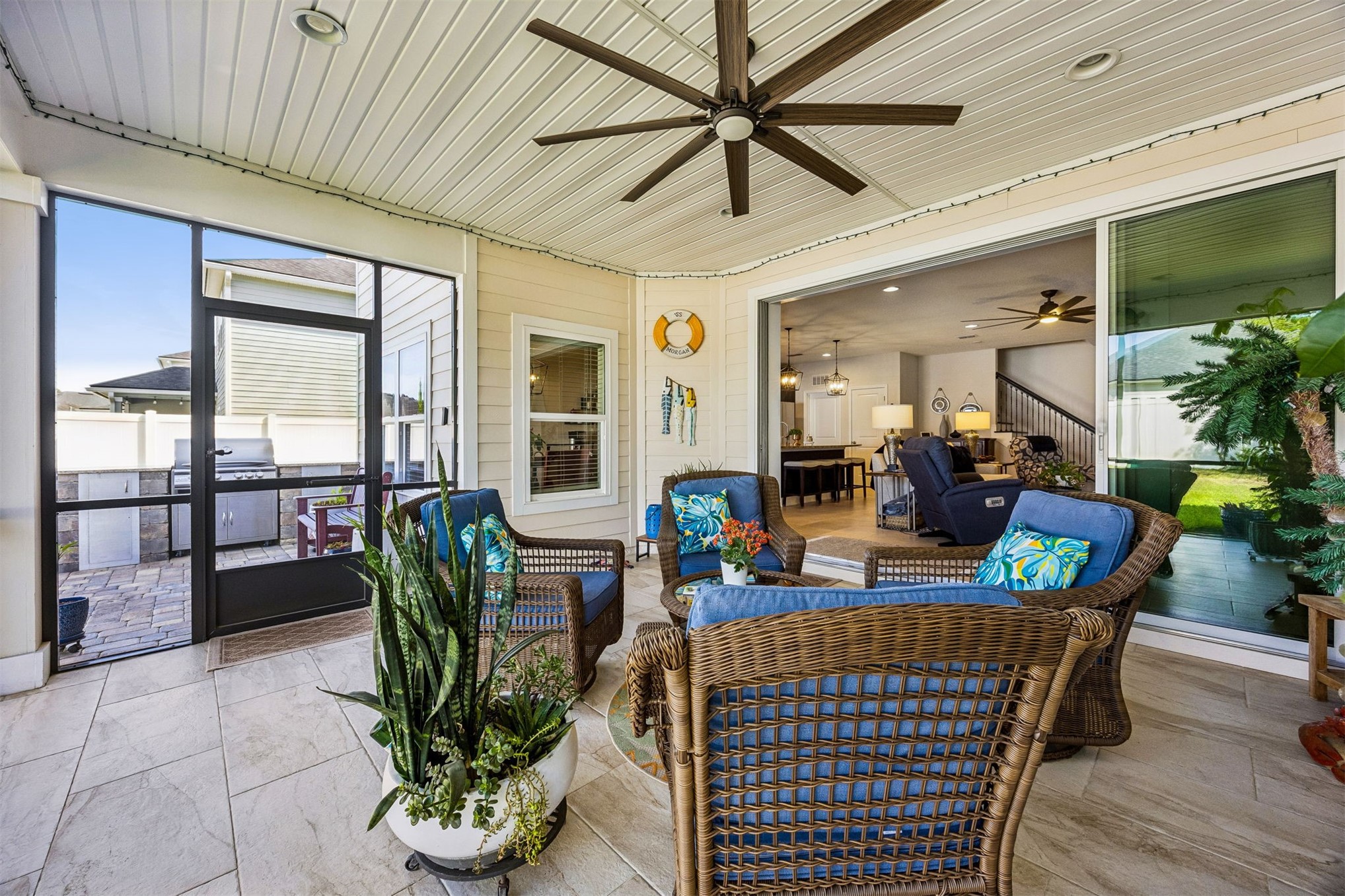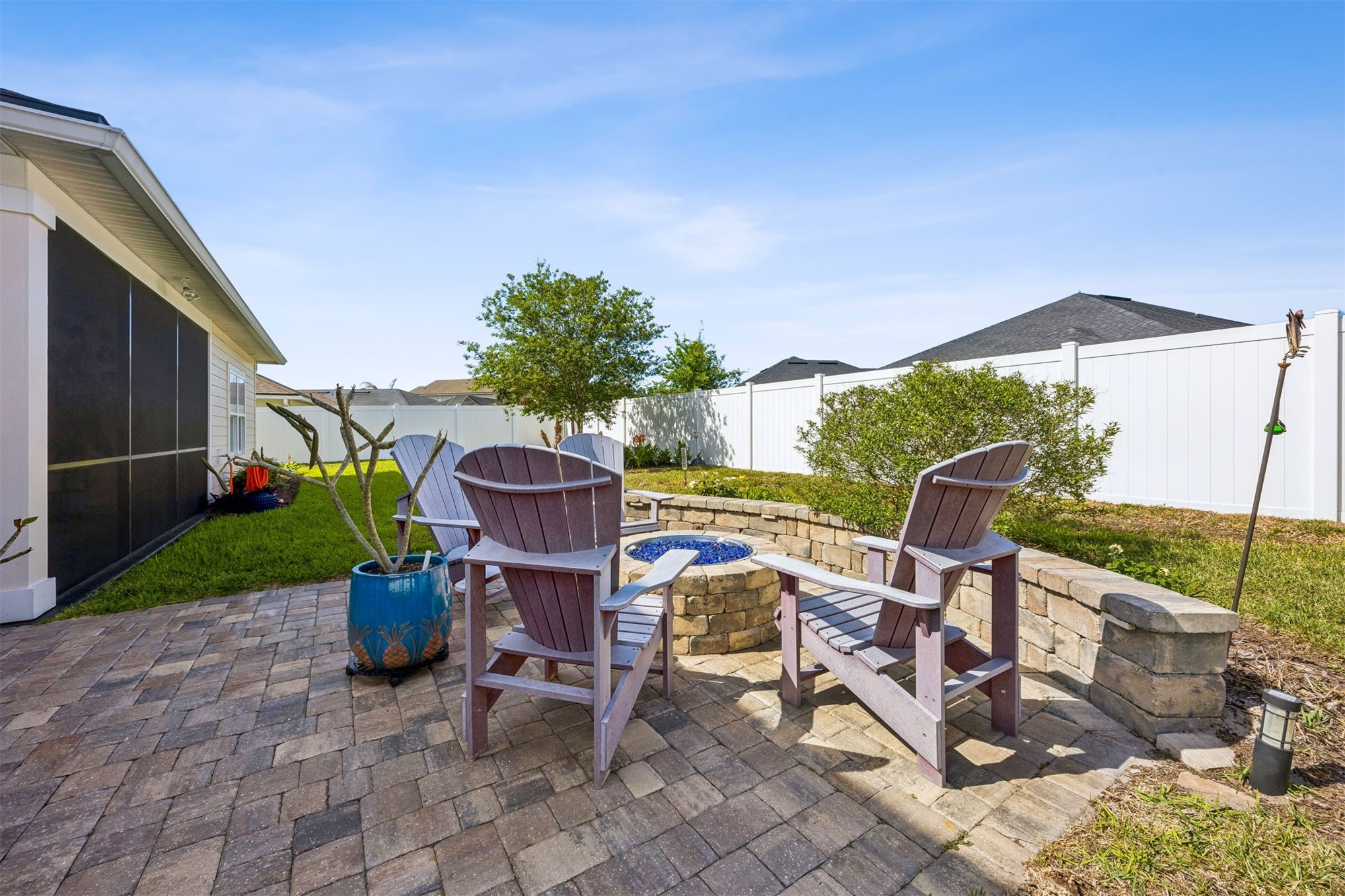 CDD BOND PAID OFF! This stunning home offers an abundance of thoughtful upgrades, modern design, and exceptional indoor-outdoor living. Step through the double door front entry into an open-concept layout featuring tile flooring throughout the main living areas and new plush upgraded carpet in the downstairs bedrooms. The kitchen and bathrooms showcase upgraded countertops (granite in kitchen and quartz in bathrooms), soft-close cabinets, subway tile backsplash, and pull-out storage designed for convenience. The primary suite is a true retreat with a spa-like bath including a pulse shower system, upgraded glass enclosure, and custom closet. Seamless indoor-outdoor living is achieved with a triple sliding glass door that fully opens to the screened lanai with tile flooring. Step outside to your private backyard oasis featuring brick pavers, a natural gas fire-pit, and a beautifully designed sitting wall, all surrounded by lush landscaping and a fully fenced yard. The 3-car garage is a standout feature, fully insulated and upgraded with durable Shark Coating flooring, a mini split system for climate control, and a ProSlat wall organization system. Additional highlights include a water softener with a whole house filtration system, upgraded lighting and ceiling fans throughout, smart home features (including security system, cameras, and app-controlled irrigation and thermostats), and a spacious upstairs bonus room with a full bathroom. Community residents have access to the clubhouse, pool, and playground. Conveniently located to Amelia Islands beaches, downtown Fernandina, restaurants, shopping, and about 30 mins to Jax Airport or St. Marys. This home is truly move-in ready with extensive upgrades already completed.