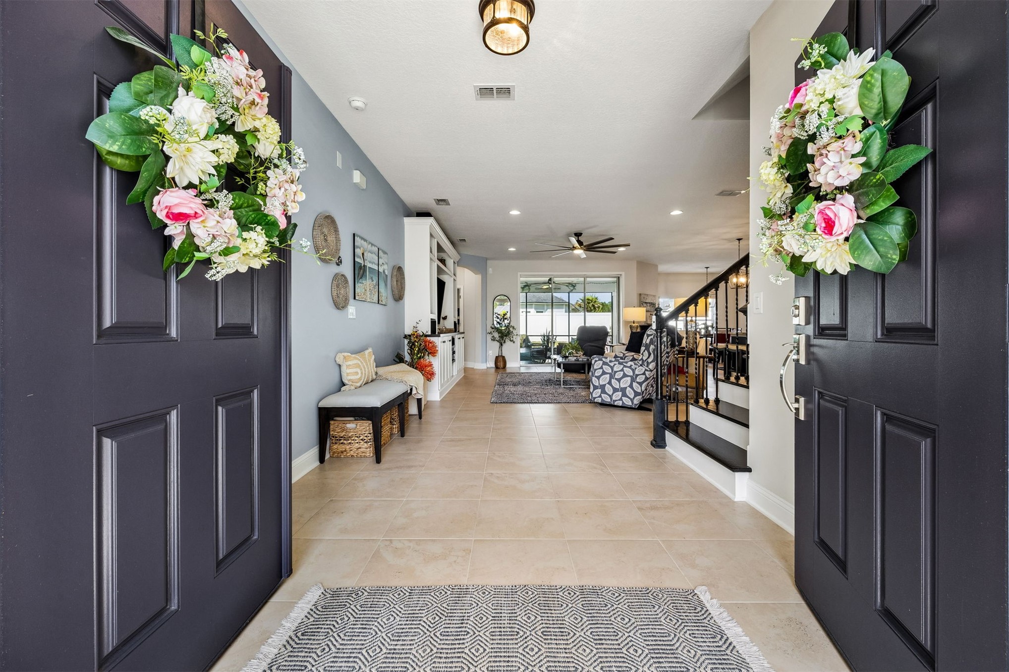 CDD BOND PAID OFF! This stunning home offers an abundance of thoughtful upgrades, modern design, and exceptional indoor-outdoor living. Step through the double door front entry into an open-concept layout featuring tile flooring throughout the main living areas and new plush upgraded carpet in the downstairs bedrooms.