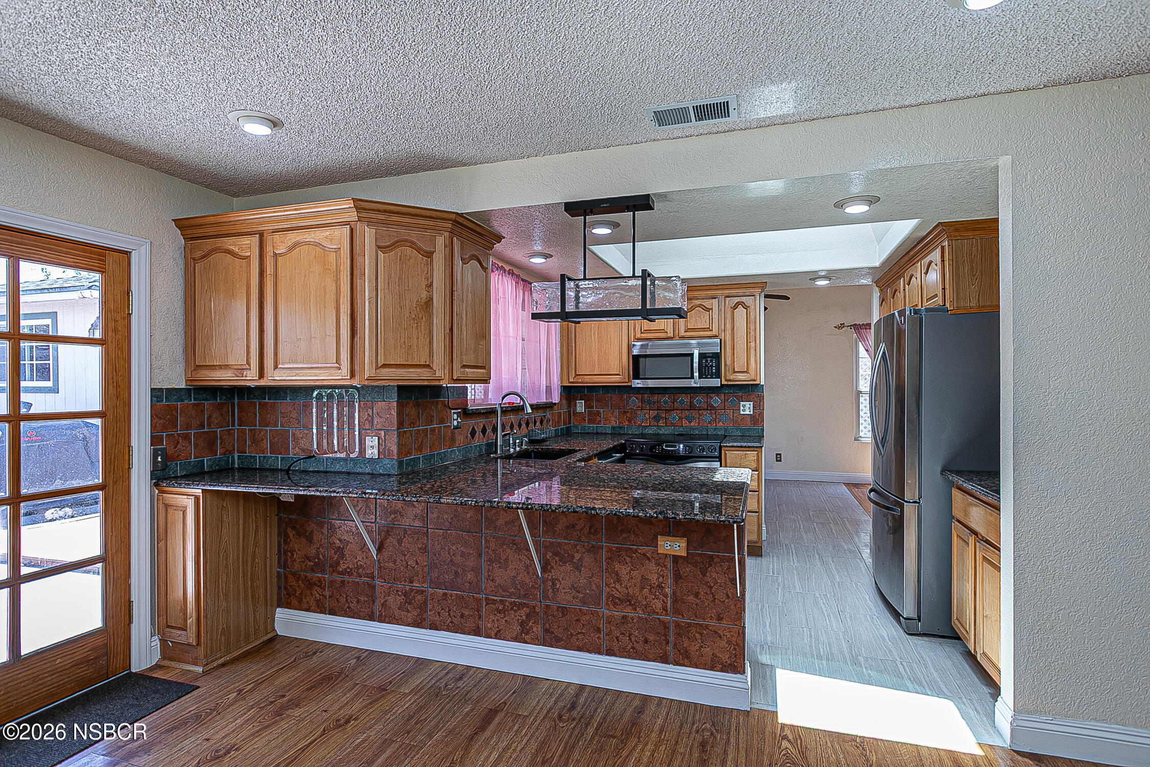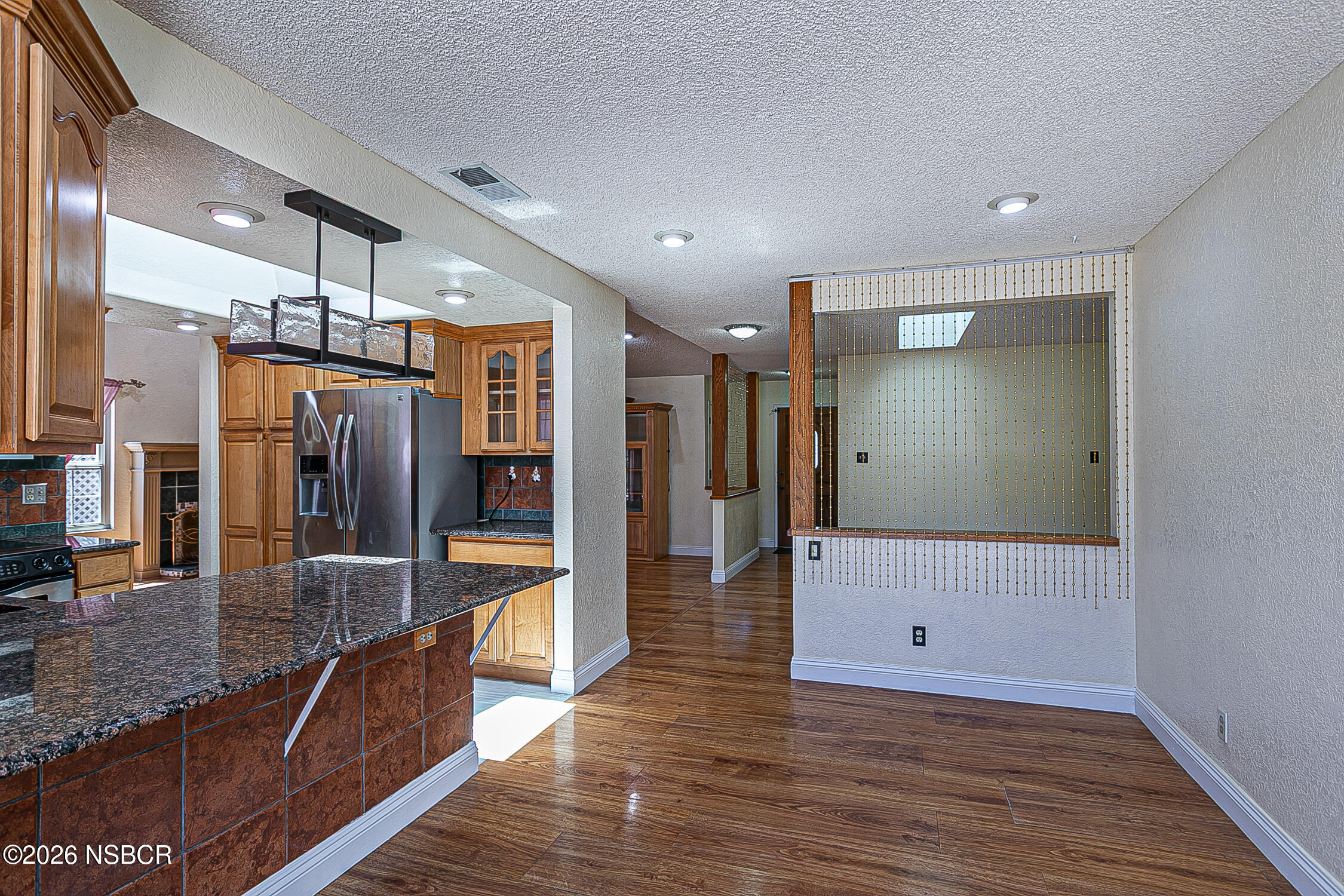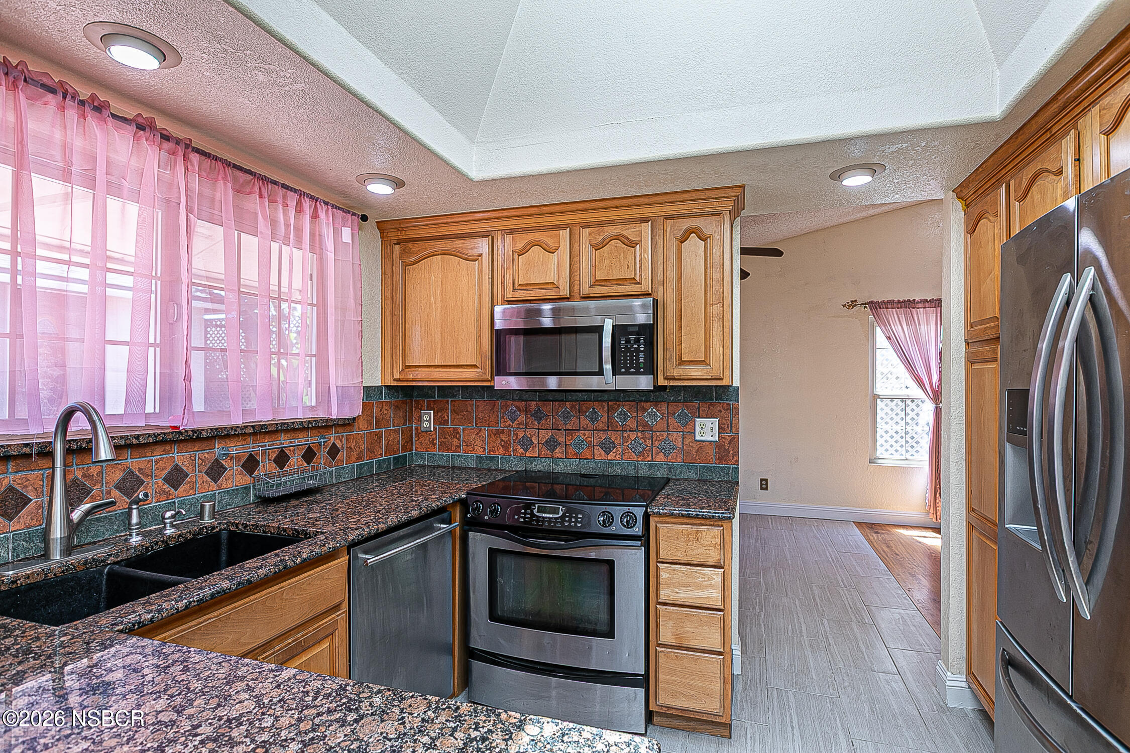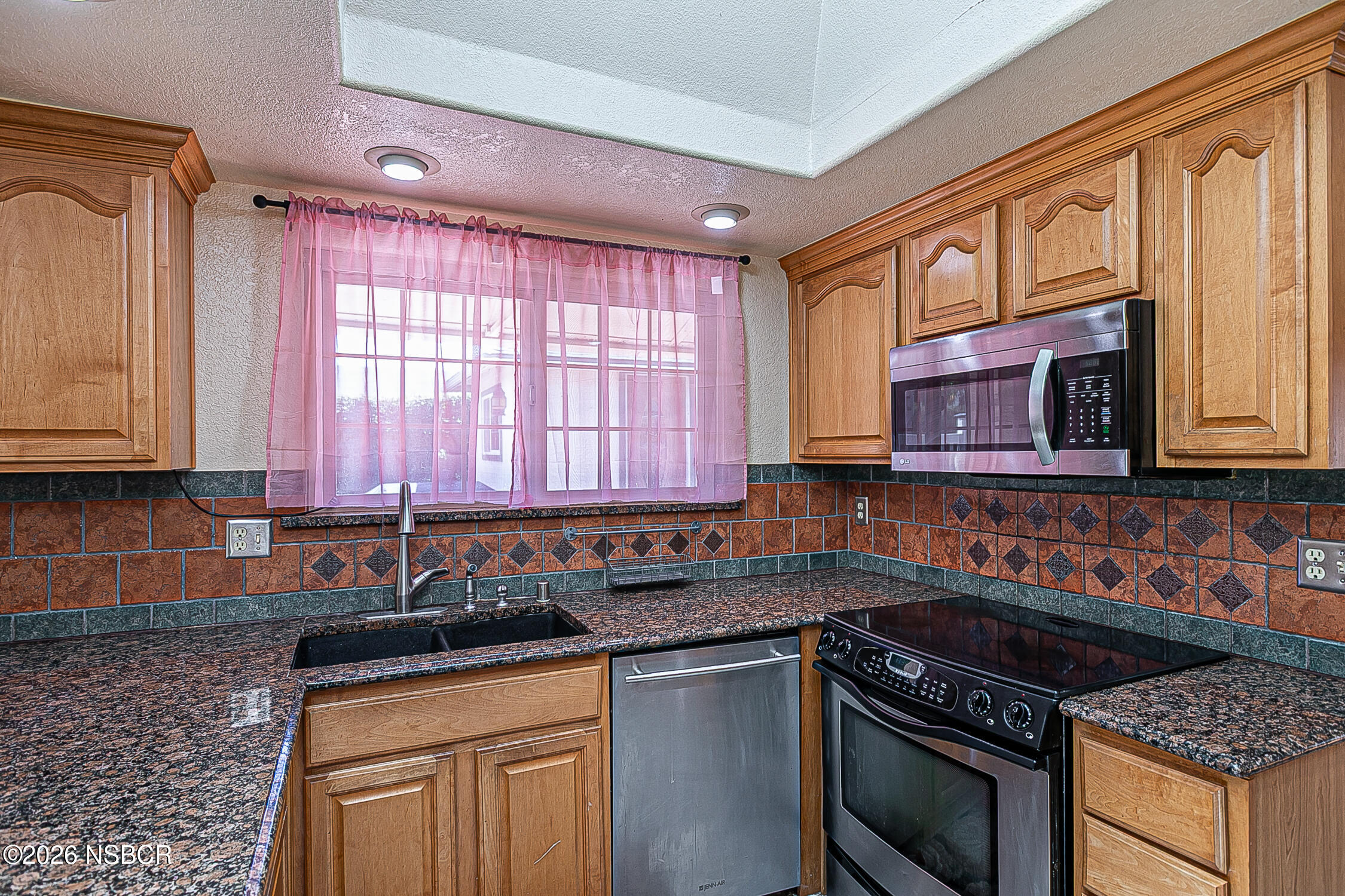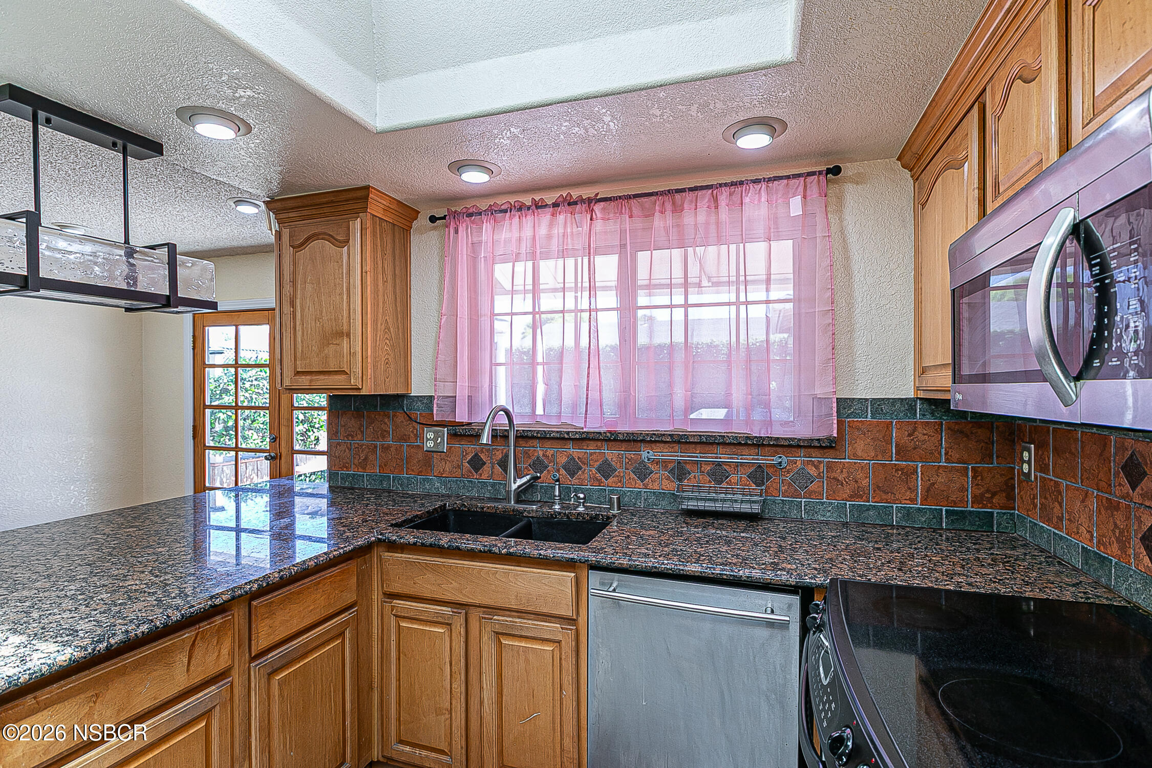 Gorgeous view-home with beautifully landscaped grounds, a fully-fenced yard, and a warm, welcoming feel throughout. This 4-bedroom, 3-bath home offers a brand new roof with warranty, vaulted ceilings, skylights, a cozy fireplace, and natural gas utilities for added comfort and efficiency. Your stunning kitchen offers SS cabinets, a massive island with bar seating, hands-free faucet, custom lighting and leathered-finish granite countertops. Step out to the resort-style backyard with no stairs, lush landscaping, a covered outdoor entertaining area, 2 fruit-bearing apple trees and a cherry tree, and a garden area making outdoor living easy, beautiful, and accessible. Ample storage can be found throughout the home, including built-in shelving in the garage that conveys. Ideally located near shopping, schools, freeway access, and all the amenities you need!