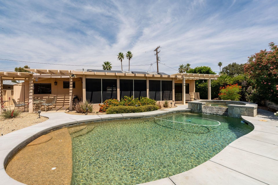 Welcome to your desert retreat in the highly desirable Palm Desert Country Club, where stunning golf course and beautiful mountain views create the perfect backdrop for everyday living. This charming 3-bedroom, 2-bath home has been lovingly maintained and cherished by the same family for over 63 years, offering a rare opportunity to own a truly special property. Perfectly positioned on the golf course, the home captures breathtaking panoramic fairway and mountain views while providing a peaceful and private setting. Step outside to your beautifully updated saltwater pool and spa, ideal for relaxing or entertaining under the desert sky. The pool has been recently resurfaced with a brand-new deck completed in 2024, and the equipment is in excellent condition--giving you peace of mind for years to come. Inside, the home offers a warm and inviting layout filled with natural light and comfortable living spaces. Whether youre looking for a full-time residence, vacation getaway, or investment property, this home checks all the boxes. Additional highlights include leased solar for energy efficiency and one of the lowest HOA fees in the entire desert, making this an exceptional value in a prime location. Dont miss your chance to own a piece of desert history with incredible golf course and mountain views, thoughtful updates, and true pride of ownership throughout.