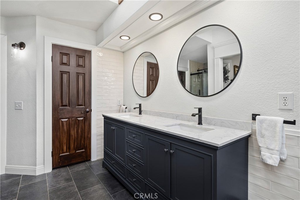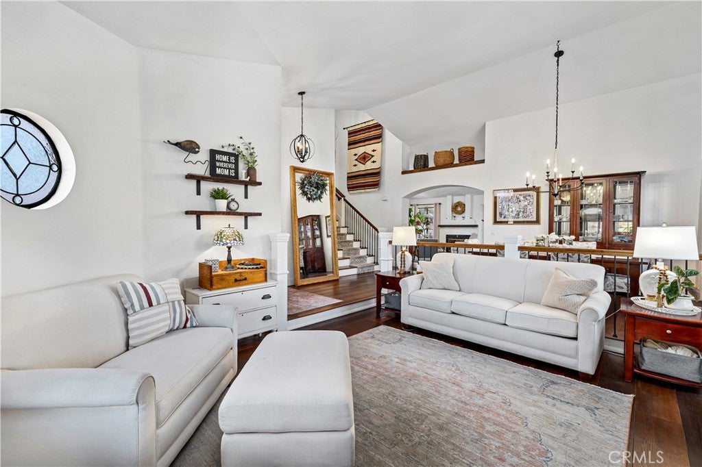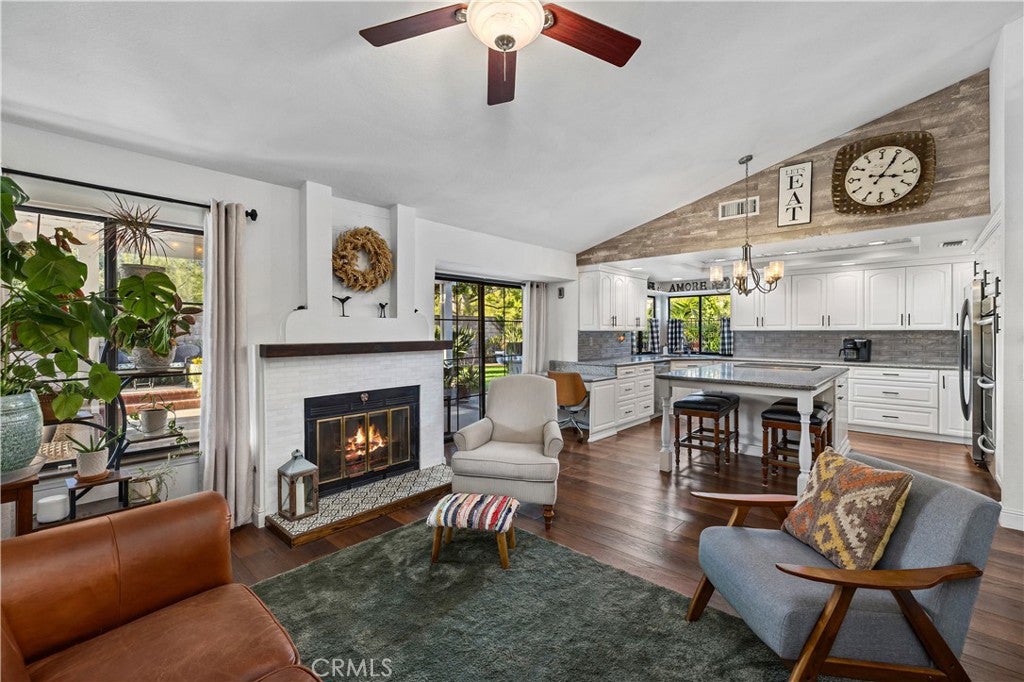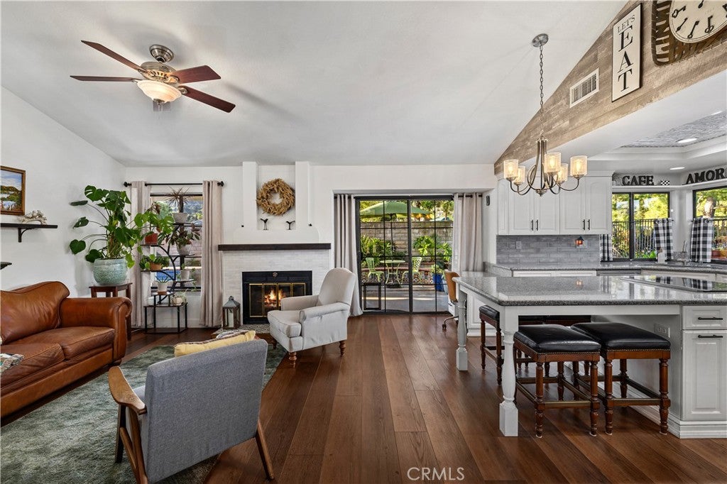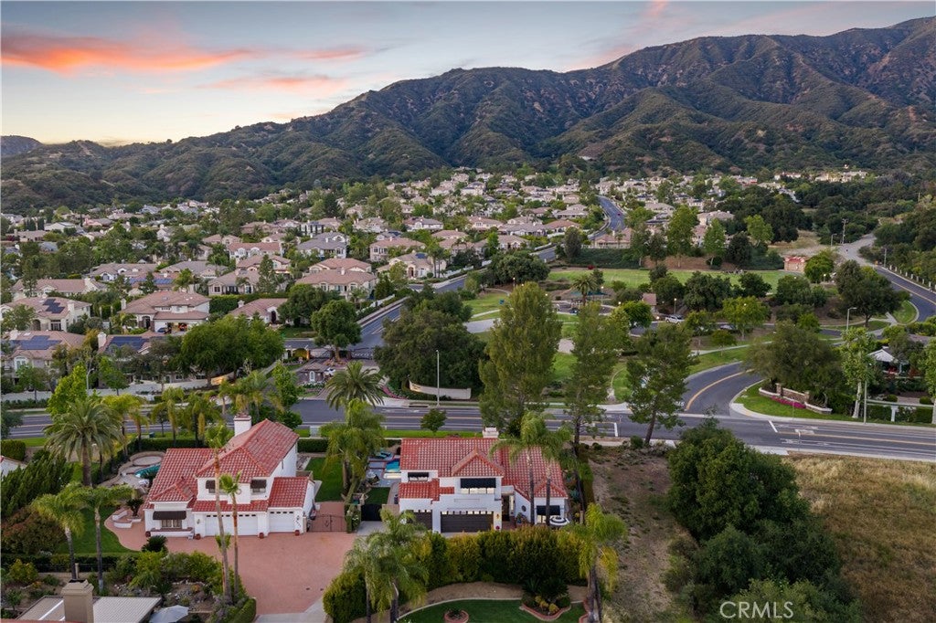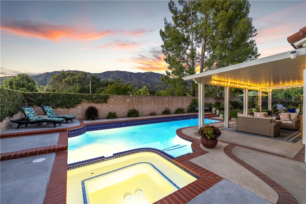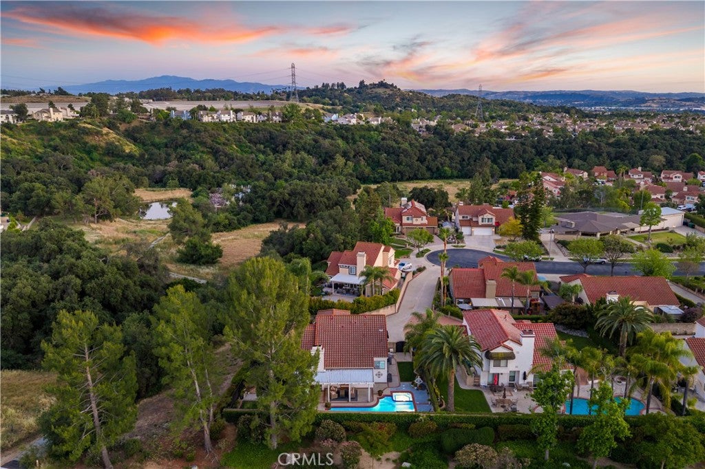 Beautifully remodeled pool home in the gated Sierra La Verne community. Situated at the end of a cul-de-sac approached by a private driveway, this residence offers exceptional privacy. The front grounds are highlighted by a brick ribbon driveway, an expansive herringbone brick courtyard, illuminated planters, and a covered entry leading to a beautifully crafted front door. Inside, vaulted ceilings and a chandelier create an inviting first impression, with LVP flooring extending throughout the main living areas. The living room is filled with natural light and flows seamlessly into the formal dining area, defined by a custom banister and railing. The family room opens directly to the kitchen and features vaulted ceilings and a fireplace with custom tile surround and mantel, and sliding glass doors to the backyard. The kitchen features an oversized island with seating and electric cooktop, classic white cabinetry, granite countertops, tiled backsplash, stainless steel appliances, recessed lighting, and a sink capturing outdoor views. The main level also includes a custom-designed powder room with shiplap detailing, a hall closet with a barn door, and a laundry room with direct access to the finished three-car garage. The primary suite is located on the first floor, offering vaulted ceilings, a paneled accent wall, and access to the backyard. The remodeled primary bath presents dual sinks, circular mirrors, a freestanding soaking tub set against a decorative patterned tile wall with subway tile wainscoting, a separate tiled shower with sliding glass enclosure, and a private water closet. Upstairs, three additional bedrooms are complemented by an oversized, fully remodeled bathroom featuring dual sinks, tile flooring, and a custom tiled shower/tub. The backyard is designed as a private retreat, showcasing a newly plastered pool and spa with brick coping, expansive concrete decking, a grass area with a mature tree, an Alumawood-covered patio, and brick-accented planters. Spacious side yards including one with drought-tolerant succulent landscaping. Wrought iron fencing along one side opens to a neighboring greenbelt area, providing added privacy with no direct adjacent home, while mature city-maintained trees beyond the property offer natural shade and a serene backdrop. Mountain views further enhance the setting. Additional upgrades include a new HVAC system, a tankless water heater, and an attic radiant barrier designed to reduce heat and improve efficiency.