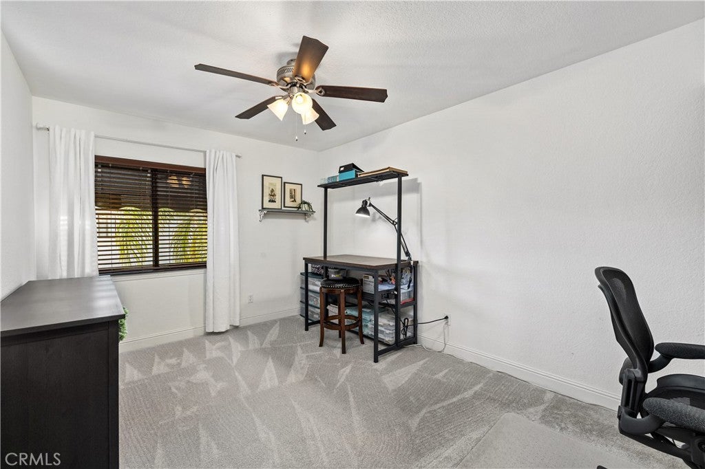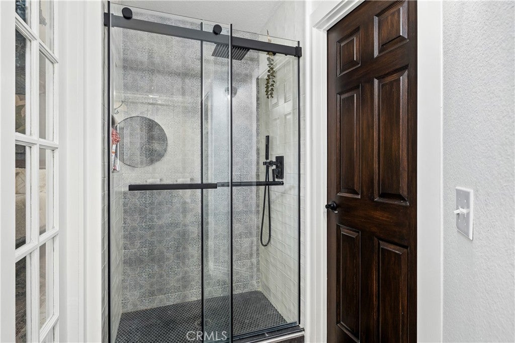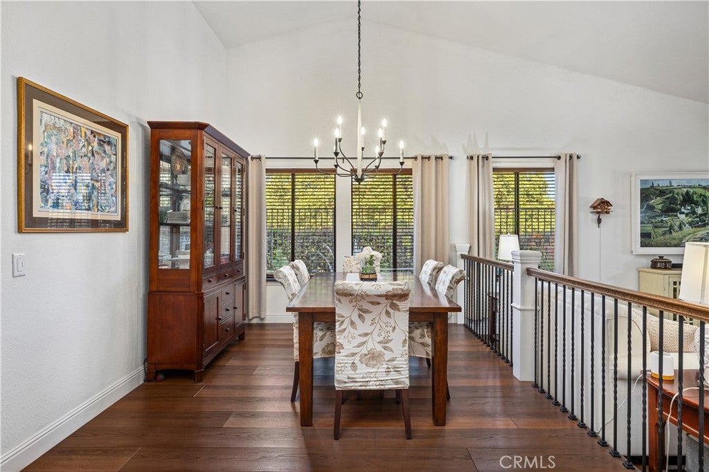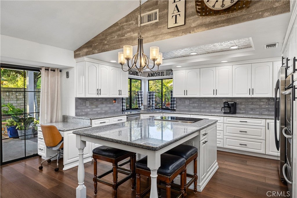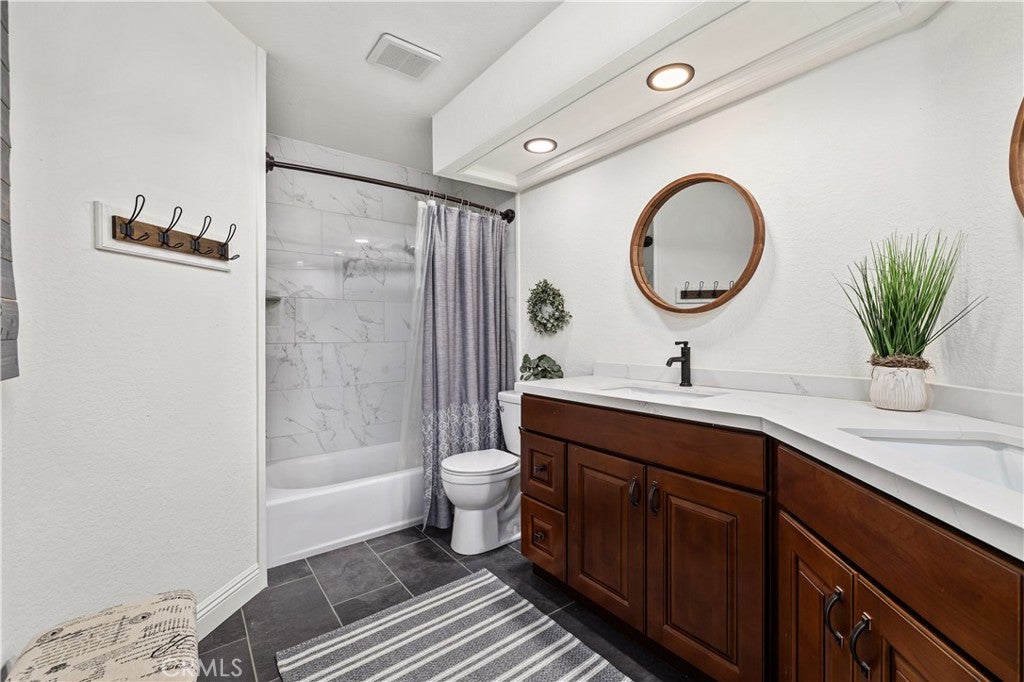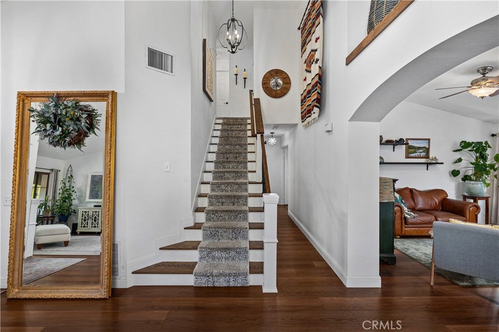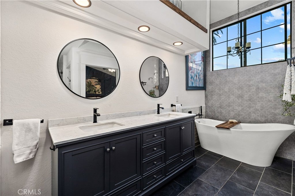 Beautifully remodeled pool home in the gated Sierra La Verne community. Situated at the end of a cul-de-sac approached by a private driveway, this residence offers exceptional privacy. The front grounds are highlighted by a brick ribbon driveway, an expansive herringbone brick courtyard, illuminated planters, and a covered entry leading to a beautifully crafted front door. Inside, vaulted ceilings and a chandelier create an inviting first impression, with LVP flooring extending throughout the main living areas. The living room is filled with natural light and flows seamlessly into the formal dining area, defined by a custom banister and railing. The family room opens directly to the kitchen and features vaulted ceilings and a fireplace with custom tile surround and mantel, and sliding glass doors to the backyard. The kitchen features an oversized island with seating and electric cooktop, classic white cabinetry, granite countertops, tiled backsplash, stainless steel appliances, recessed lighting, and a sink capturing outdoor views. The main level also includes a custom-designed powder room with shiplap detailing, a hall closet with a barn door, and a laundry room with direct access to the finished three-car garage. The primary suite is located on the first floor, offering vaulted ceilings, a paneled accent wall, and access to the backyard. The remodeled primary bath presents dual sinks, circular mirrors, a freestanding soaking tub set against a decorative patterned tile wall with subway tile wainscoting, a separate tiled shower with sliding glass enclosure, and a private water closet. Upstairs, three additional bedrooms are complemented by an oversized, fully remodeled bathroom featuring dual sinks, tile flooring, and a custom tiled shower/tub. The backyard is designed as a private retreat, showcasing a newly plastered pool and spa with brick coping, expansive concrete decking, a grass area with a mature tree, an Alumawood-covered patio, and brick-accented planters. Spacious side yards including one with drought-tolerant succulent landscaping. Wrought iron fencing along one side opens to a neighboring greenbelt area, providing added privacy with no direct adjacent home, while mature city-maintained trees beyond the property offer natural shade and a serene backdrop. Mountain views further enhance the setting. Additional upgrades include a new HVAC system, a tankless water heater, and an attic radiant barrier designed to reduce heat and improve efficiency.