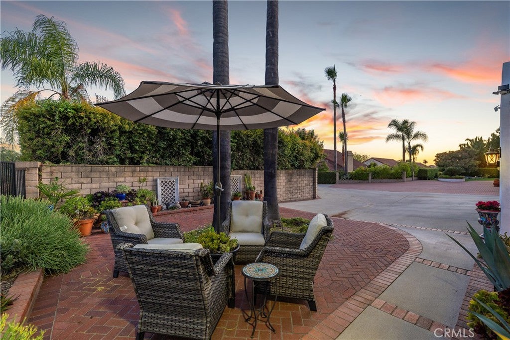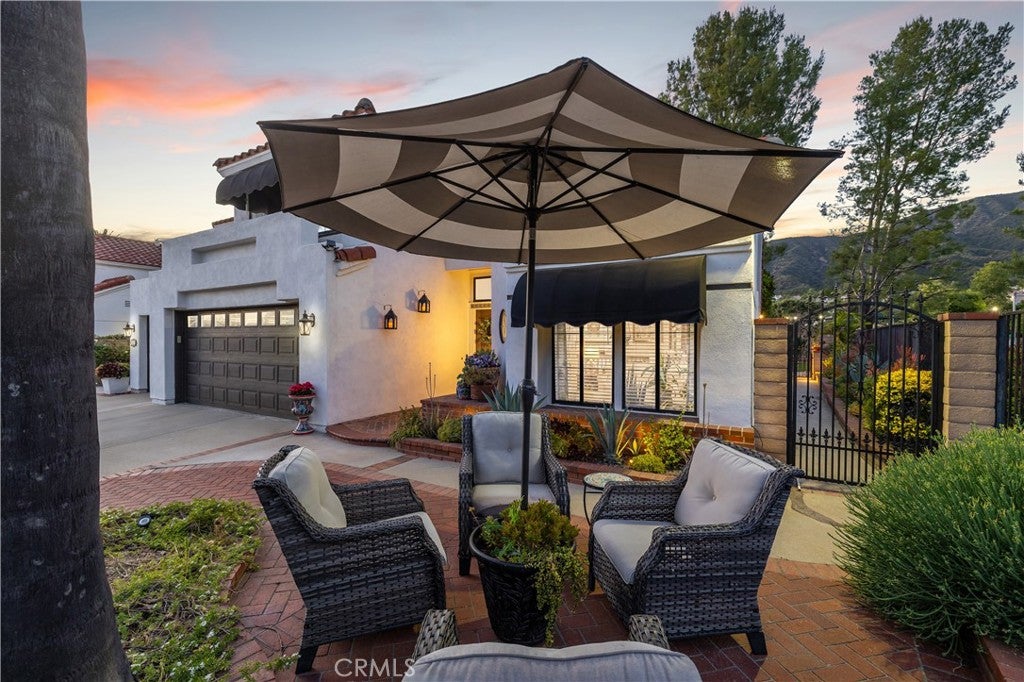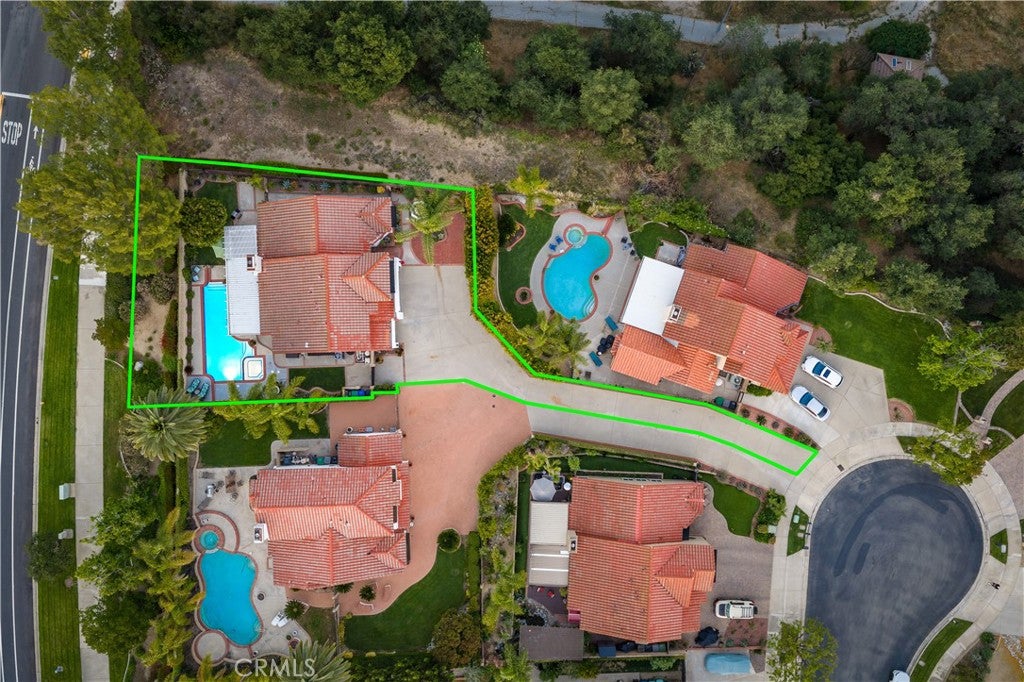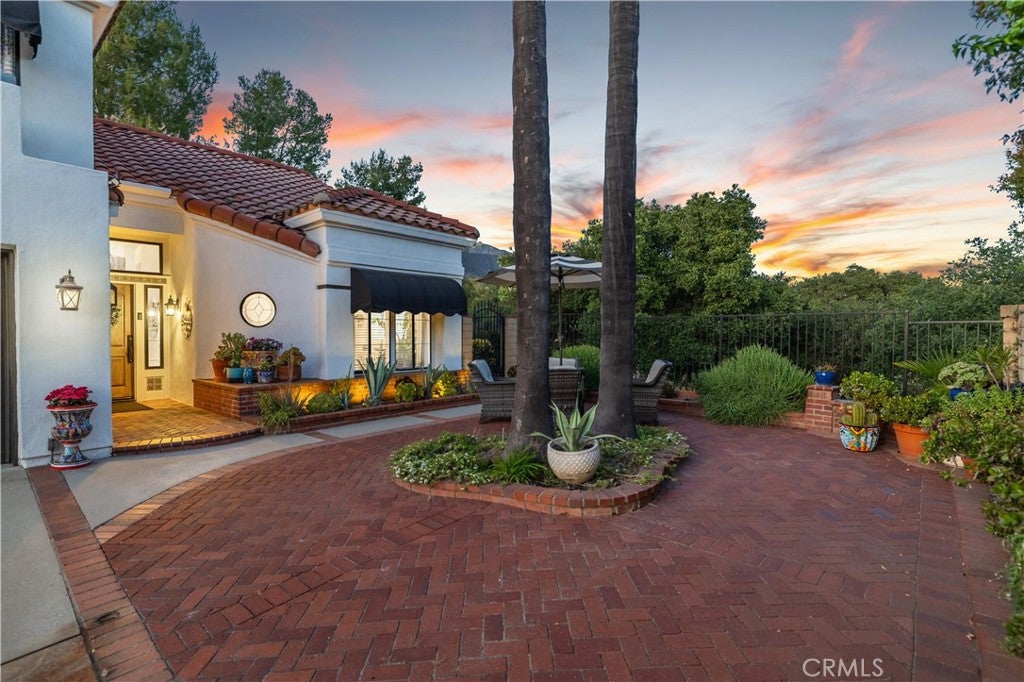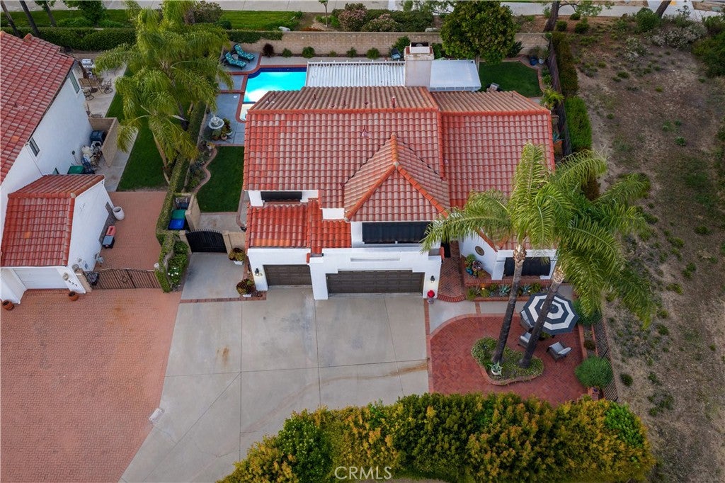 Beautifully remodeled pool home in the gated Sierra La Verne community. Situated at the end of a cul-de-sac approached by a private driveway, this residence offers exceptional privacy. The front grounds are highlighted by a brick ribbon driveway, an expansive herringbone brick courtyard, illuminated planters, and a covered entry leading to a beautifully crafted front door.
