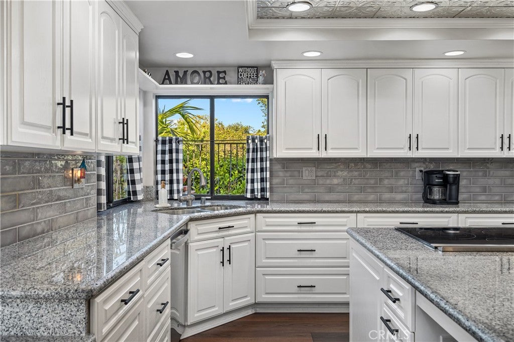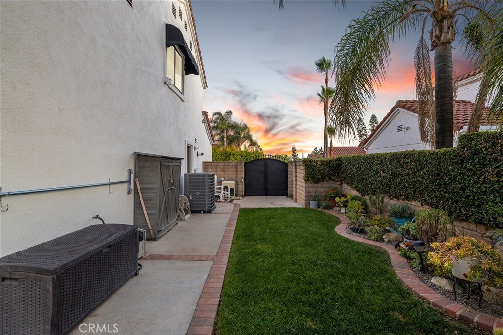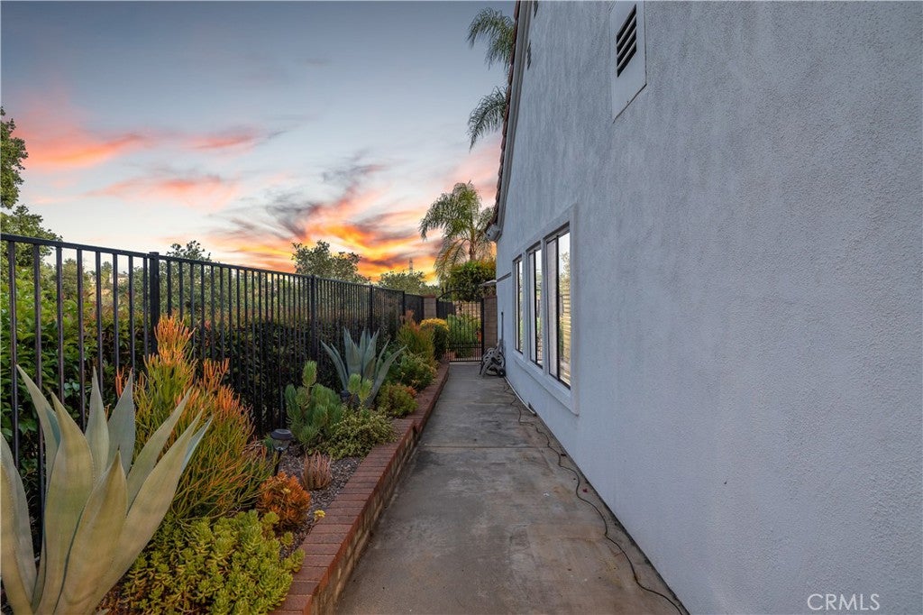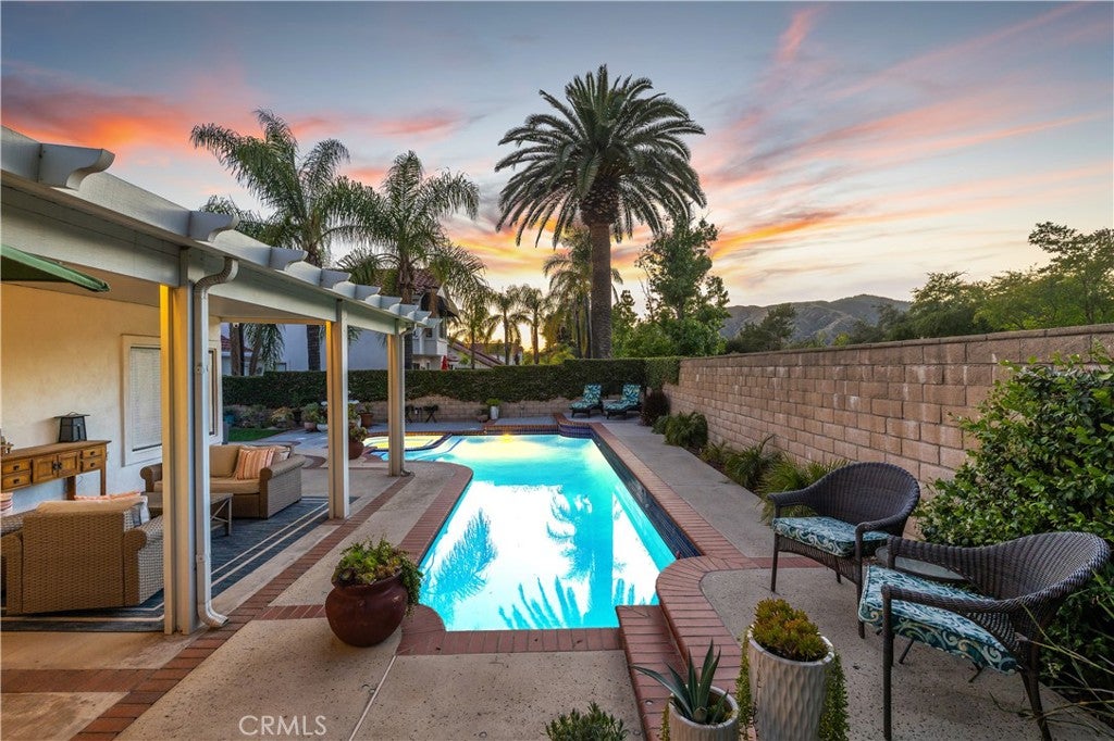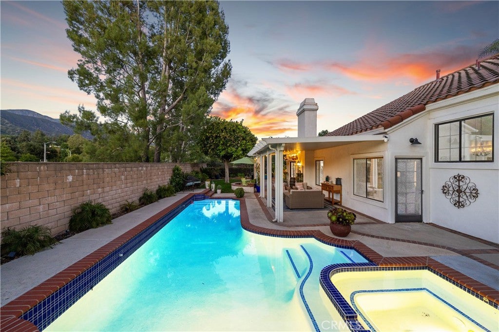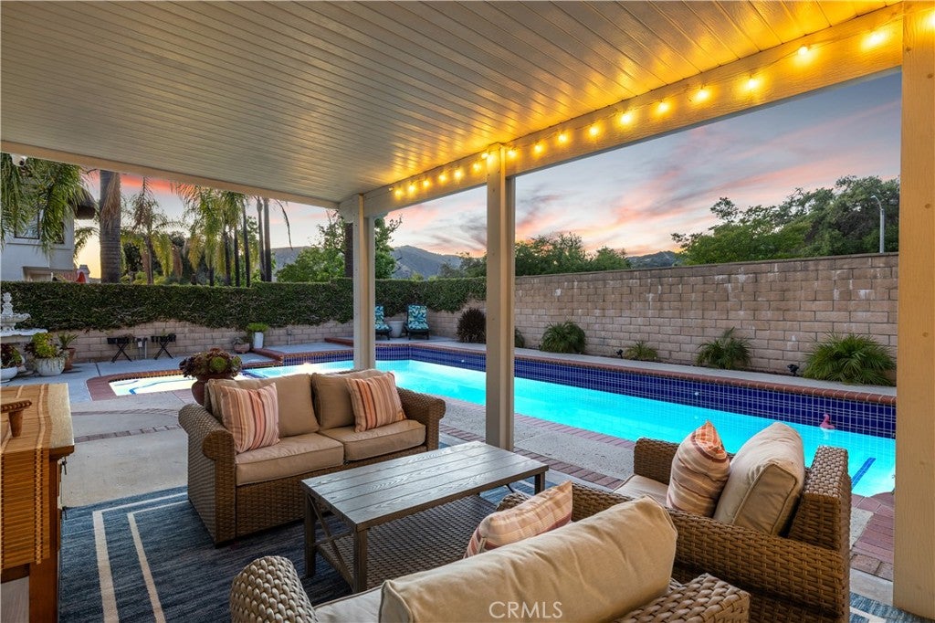Beautifully remodeled pool home in the gated Sierra La Verne community. Situated at the end of a cul-de-sac approached by a private driveway, this residence offers exceptional privacy. The front grounds are highlighted by a brick ribbon driveway, an expansive herringbone brick courtyard, illuminated planters, and a covered entry leading to a beautifully crafted front door.