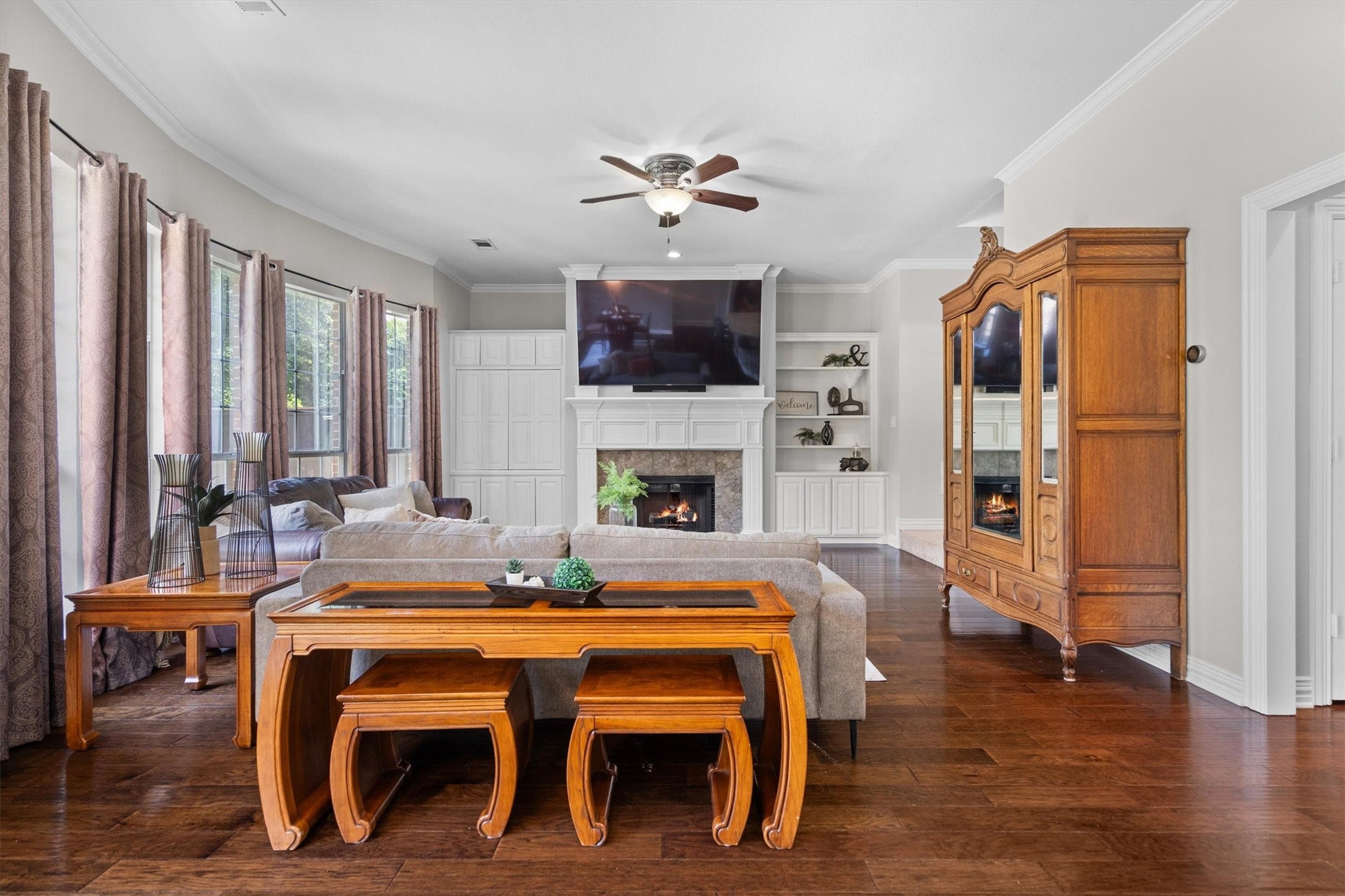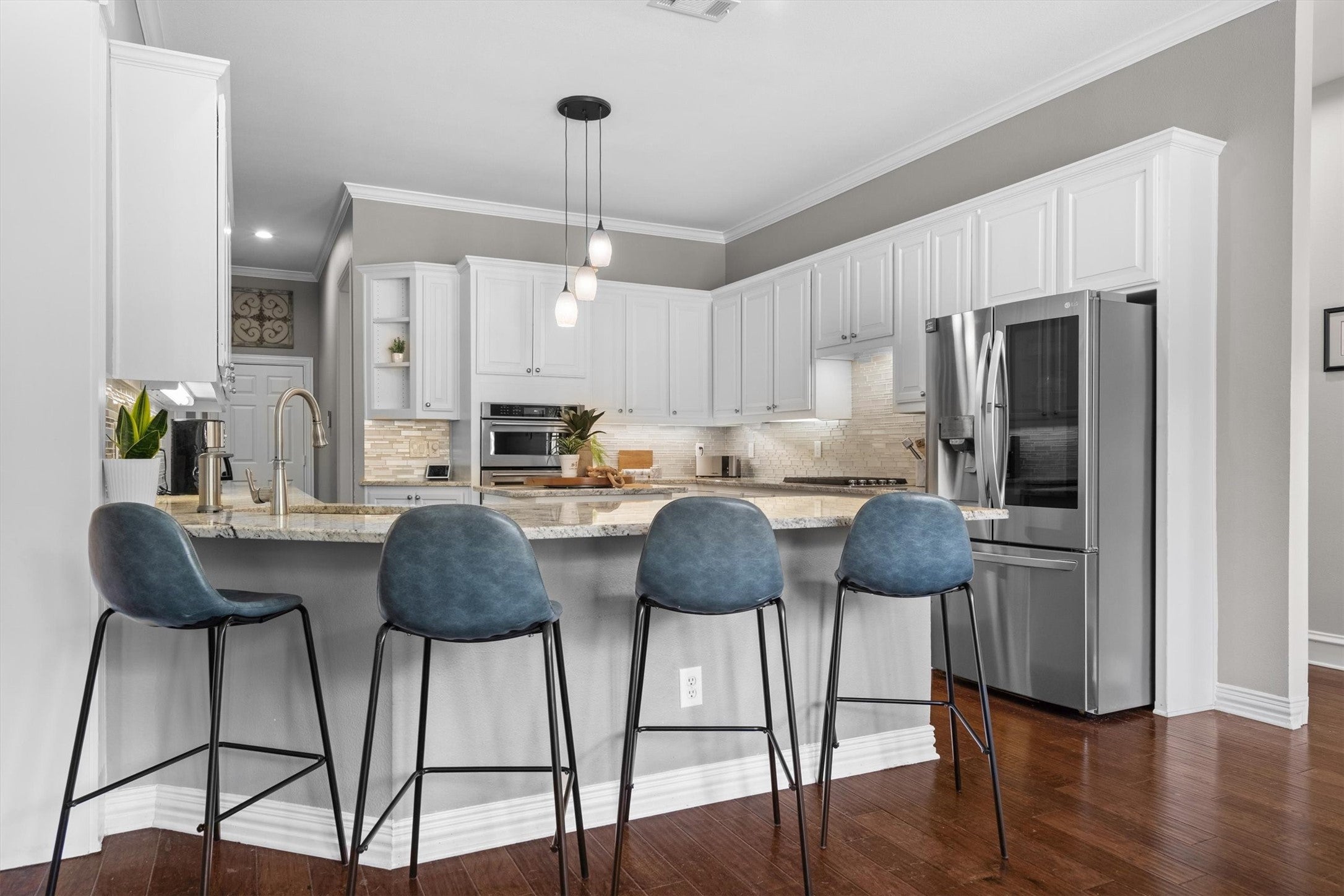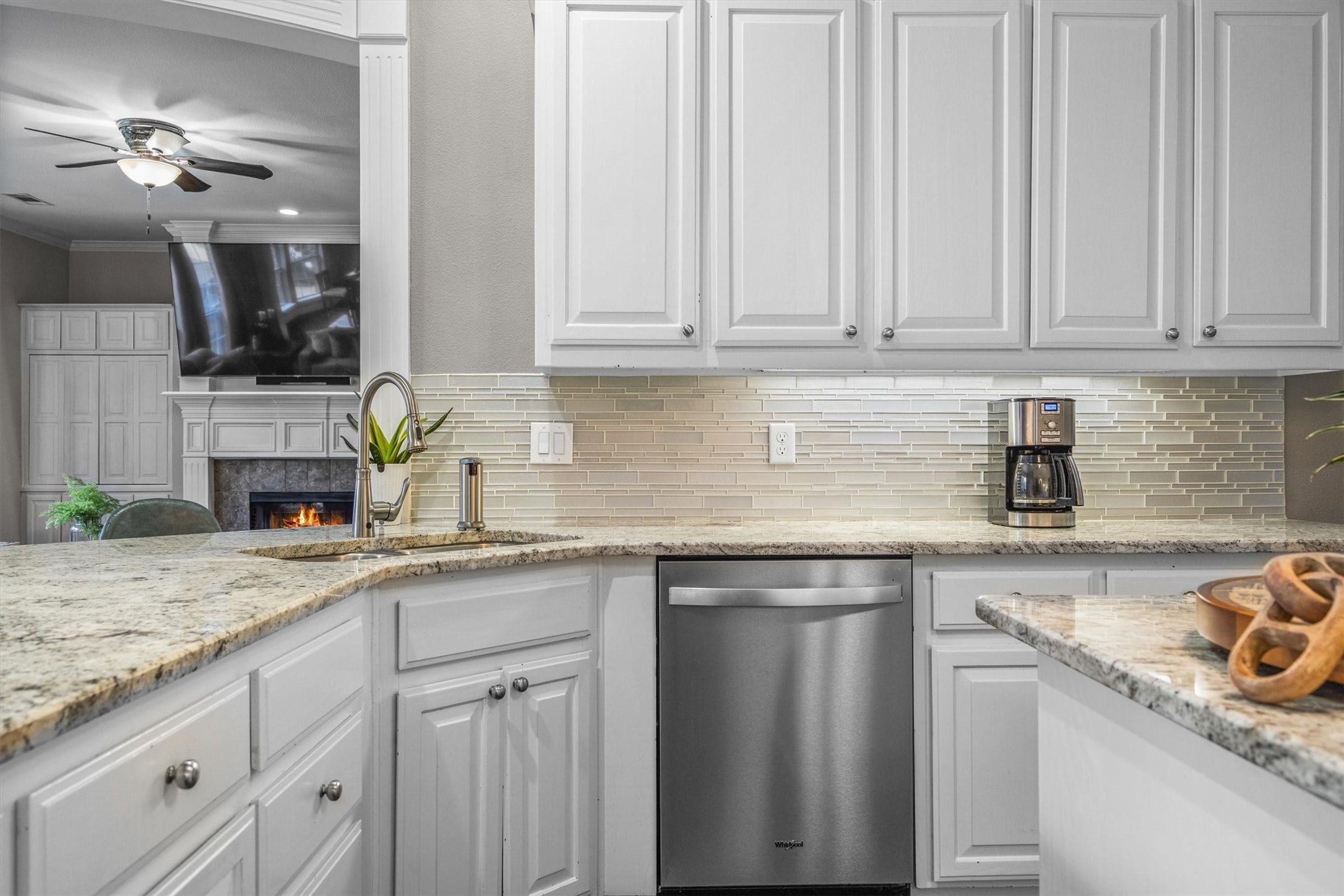 Youll love this gorgeous, ranch style home situated on 3.4 acres with so many fabulous amenities. Inside youll find an open living & dining space with a gas, dual sided fireplace, kitchen featuring Quartz counter tops, stainless commercial gas range/oven, large island, copper farm sink and fridge/freezer combo.