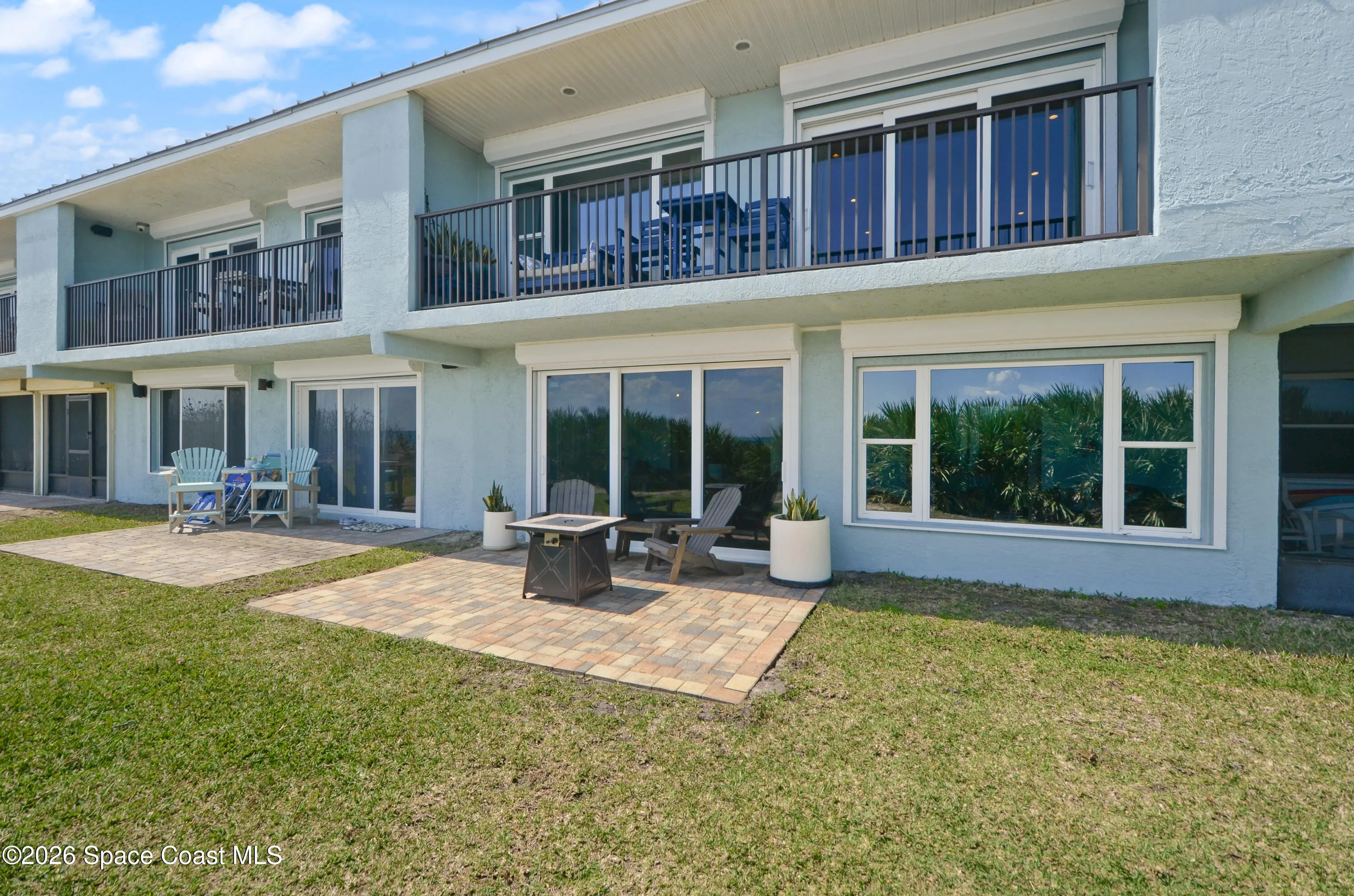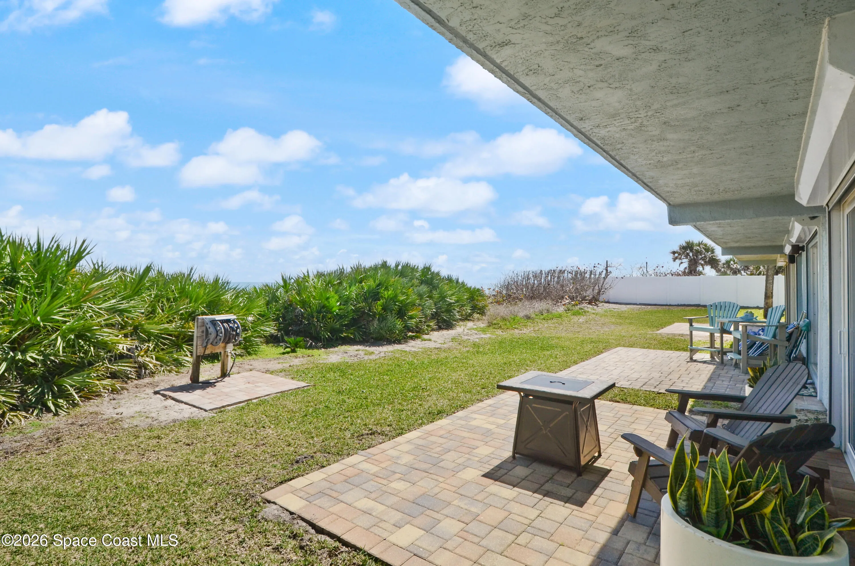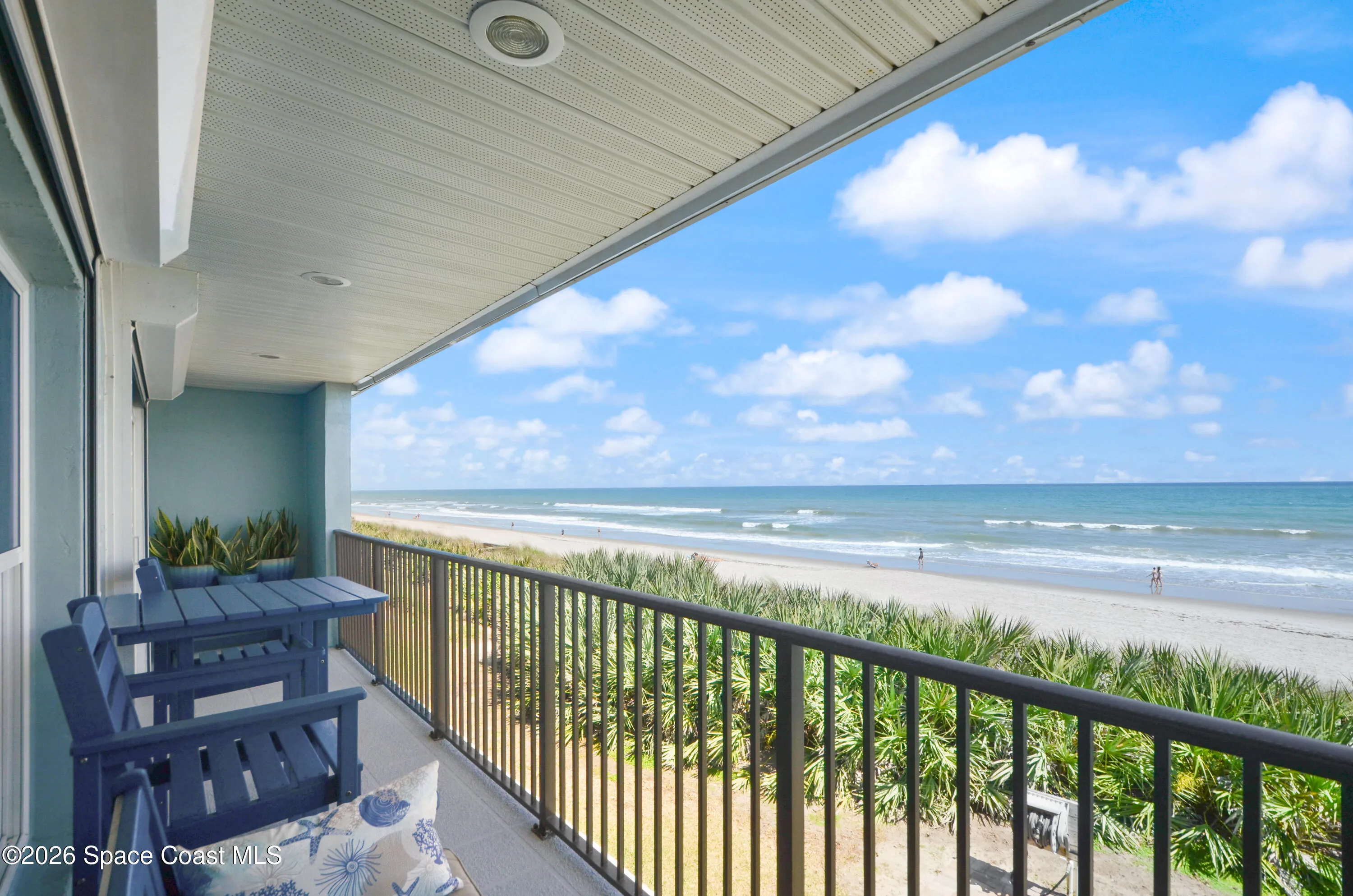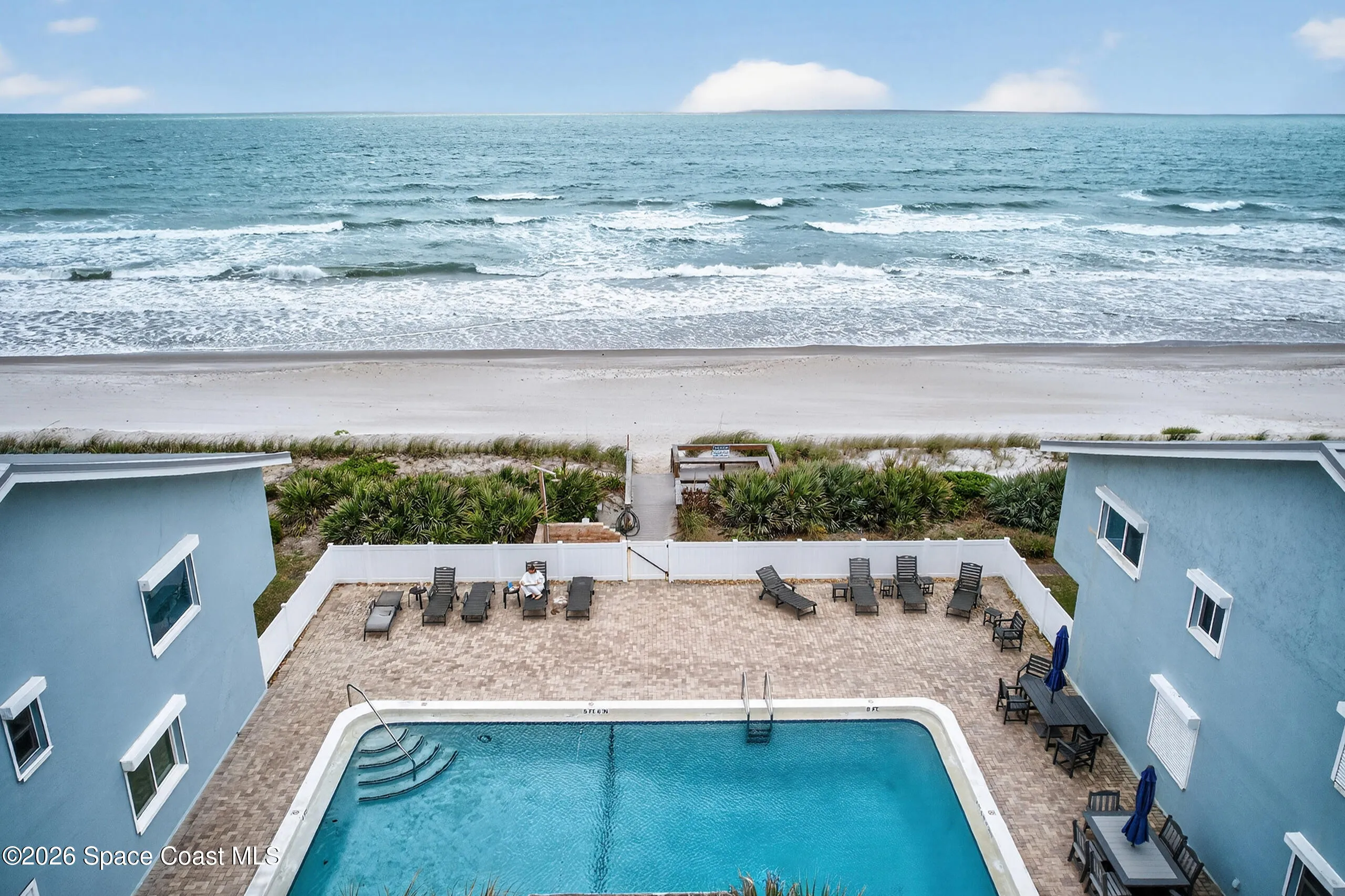 Immaculate 3/3 2-story oceanfront condo with 2-car, *attached* garage, *no pet restrictions* one year *home warranty* included, large, heated pool Ocean views from balcony, kitchen, dining, family & Florida room & 1st floor bedroom.The automatic storm shutters are both manually and electronically employed, depending on situation and the generator and/or power block (both convey) can be used to power them. A/C (2021) has a dedicated surge protector (2024) & condenser coils replaced (2025) Hot water heater (2022) Metal roof (2017). First floor is perfect as an in-law and/or guest suite w/ mini kitchen and laundry. The main kitchen has induction stove (2026) & microwave/airfryer (2025). Beautiful, richly colored porcelain tile throughout the entire unit. Spacious primary bedroom suite with his & hers closets. 23X8 ft Florida Room with expansive ocean views through the hurricane rated windows, as well as paver patio to enjoy fire lit nights, listening to the waves on the shore.