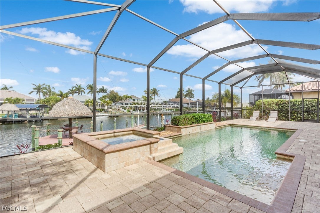 Located in a highly sought after Gulf Access area for boaters in SW Cape Coral, this Frei & Sons built 4-bedroom, 3-bathroom pool home combines a sense of elegance with relaxing everyday comfort. Situated on the 150-foot-wide Julep Canal, it is approximately a 30-minute boat ride from your backyard to the docks at Rumrunners, and only about 3-1/2 miles from there to the open waters of the Gulf of America off of Sanibel. This home features a large dock with a 10,000 pound covered boatlift for single or cat hulls, a jet ski lift, Tiki Hut, and an impressive paver dockside deck with a wide paver ramp providing easy accessibility going to and from the screened pool and lanai to the dock, making it a perfect spot for canal side entertaining and watching sunsets. The heated pool and spa combine with a large pool deck and lanai featuring an outdoor kitchen, an outdoor shower, plus access to a pool bath. This home is designed for outdoor living, entertaining, and a boating lifestyle.Moving back inside of this spacious 2,348 square foot split floor plan home, there is tile flooring throughout the main living area and tall Low E PGT hurricane impact sliders and windows, which combine with the high ceilings for a bright and open feeling. The kitchen features granite countertops, 42 inch tall wood cabinets, a pantry closet, stainless steel appliances, and a breakfast bar. There is also an informal dining nook providing relaxing views of the pool and canal through a large mitered window and a separate formal dining room with a high ceiling off of the kitchen. The master bedroom has engineered wood flooring and impact slider doors with access to the lanai and pool area, along with a large master bathroom featuring two separate vanities with granite tops, a glass enclosed walk-in shower, a garden-style soaking tub, and a private water closet. The three large guest bedrooms, all with engineered wood flooring, offer privacy on the other side of this home. One of the guest bathrooms serves as a pool bath with a walk-in shower, while the other guest bathroom features a combination tub/shower, with granite countertop vanities in both guest bathrooms. The laundry room has a full sized washer, dryer, and a sink, and it leads out to an oversized three car garage with epoxy floors, a WiFi-operated garage door opener, and a generator plug. This home is move-in ready with a new roof and new AC, both installed in 2023. This low-traffic, quiet neighborhood is ideal for walkers, joggers, and bike riders. Publix at Camelot Isles, Walgreens, a variety of restaurants, banks, and medical offices are just minutes away. Shops and waterfront dining at Cape Harbour are within walking and biking distance, with Tarpon Point Marina restaurants and the Rotary Dog Park nearby. This home has had no flooding or water intrusion from past hurricanes.