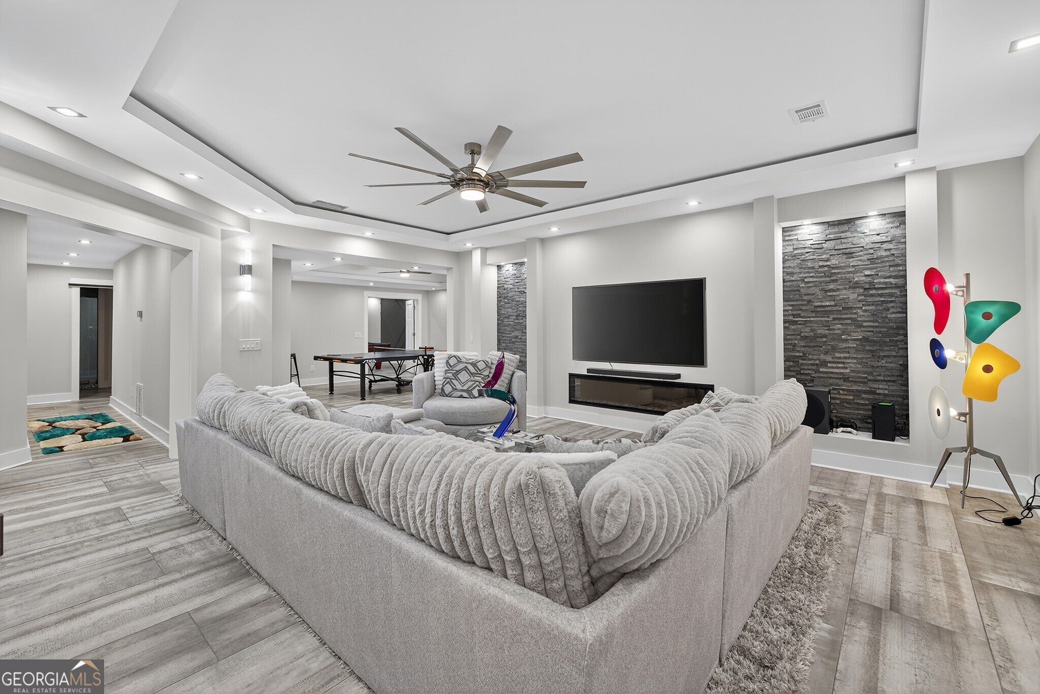 Step into luxury, space, and thoughtful design in this stunning 5-bedroom den residence, perfectly crafted for both everyday living and exceptional entertaining. Situated on over a half-acre lot, this home offers a true split floor plan with remarkable versatility and privacy. The east wing features four spacious bedrooms and two baths--ideal for family or guests--while the west wing is dedicated entirely to an extraordinary primary retreat. And this truly is a retreat... complete with a private step-down sitting area featuring its own fireplace, wet bar, and separate living space--perfect for unwinding at the end of the day. The spa-inspired primary bath showcases a travertine shower, jetted soaking tub, dual vanities, and multiple walk-in closets, including one so expansive it rivalsthe size of a bedroom. At the heart of the home, the open-concept great room welcomes you with a gas fireplace and a 3-panel sliding glass wall that seamlessly blends indoor and outdoor living. The chefs kitchen is equally impressive, offering granite countertops, gas cook top, double ovens, a large island, coffee bar, and wine rack--designed for both functionality and gathering. Additional highlights include a formal dining room, a versatile den with built-in desk and shelving, tile flooring throughout, 3.5 baths, and a generously sized laundry room with utility sink. Step outside to your private backyard oasis, where youll enjoy a play pool and spa, built-in BBQ, gas fire pit, and a luxury gazebo--all set against the backdrop of breathtaking Sunrise Mountain views. Car enthusiasts and hobbyists will appreciate the extended 4-car garage with an attached workshop/utility room--an incredibly rare find--totaling approximately 1,100 sq ft, along with an RV gate for added convenience. This is more than just a home--its a lifestyle, offering space, privacy, and amenities that are increasingly hard to find.