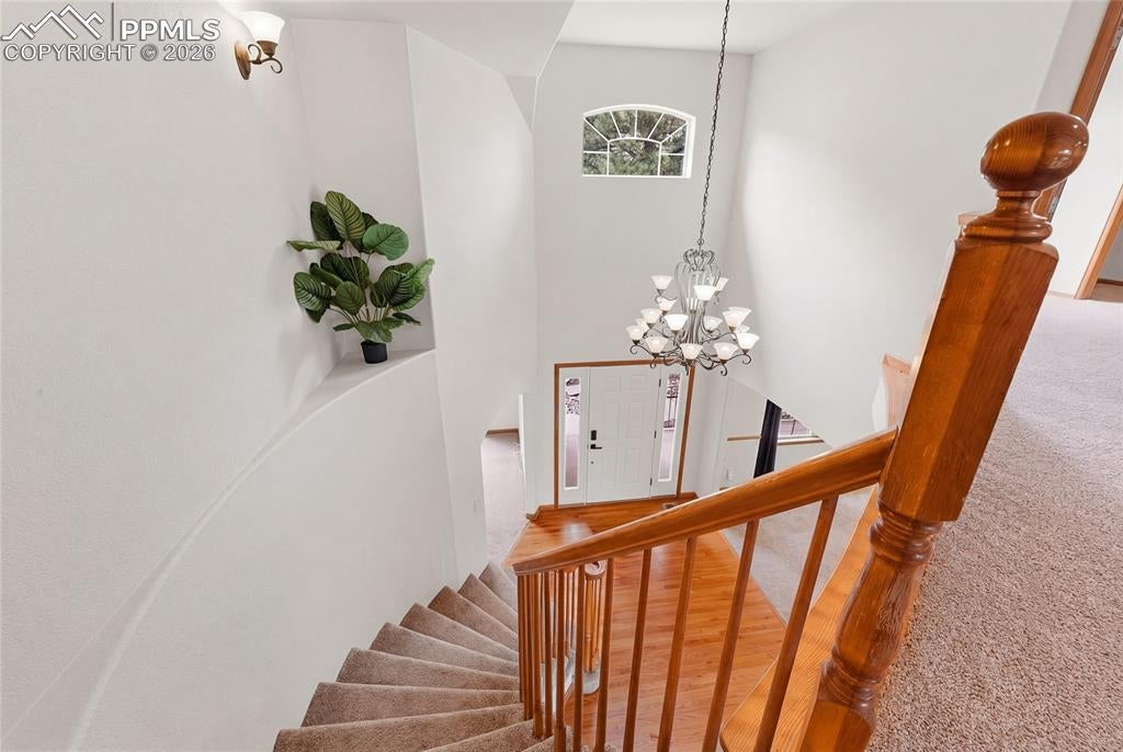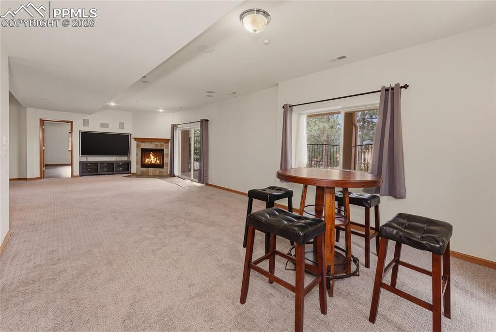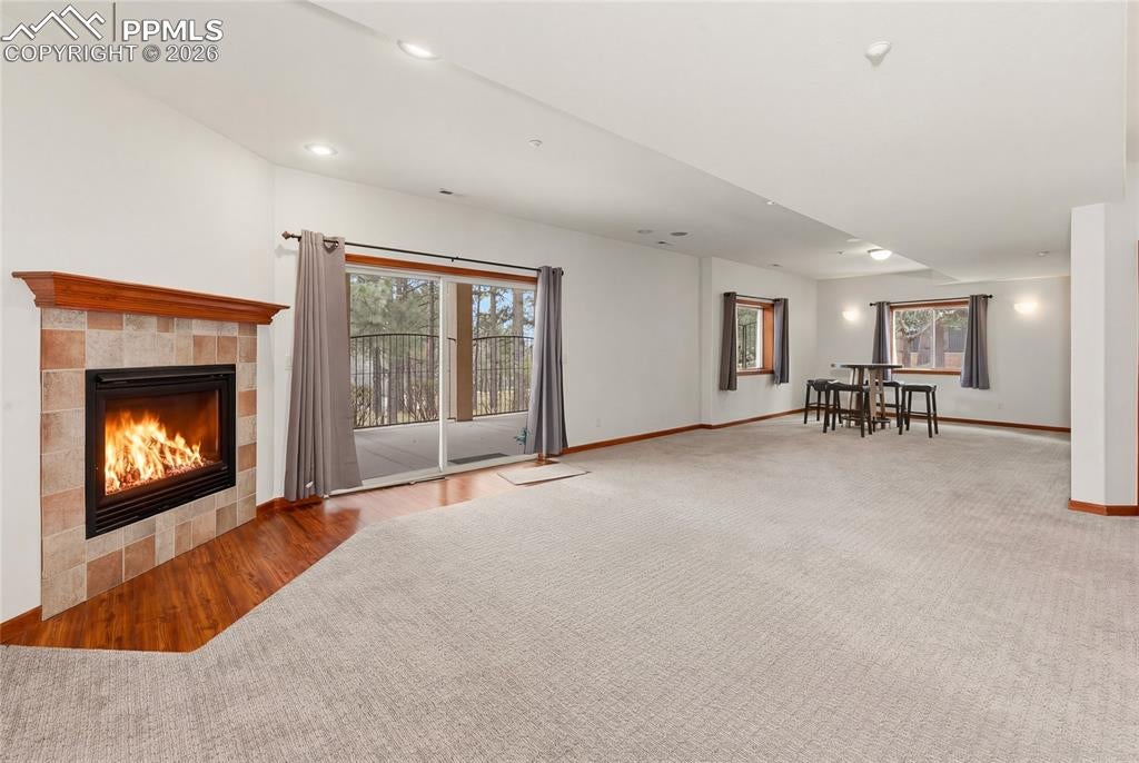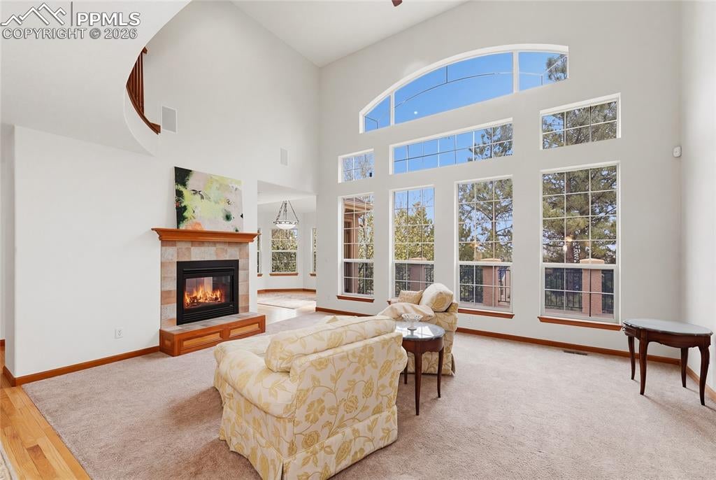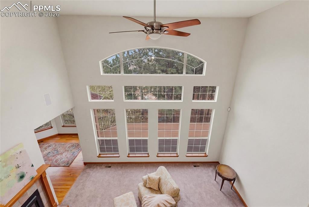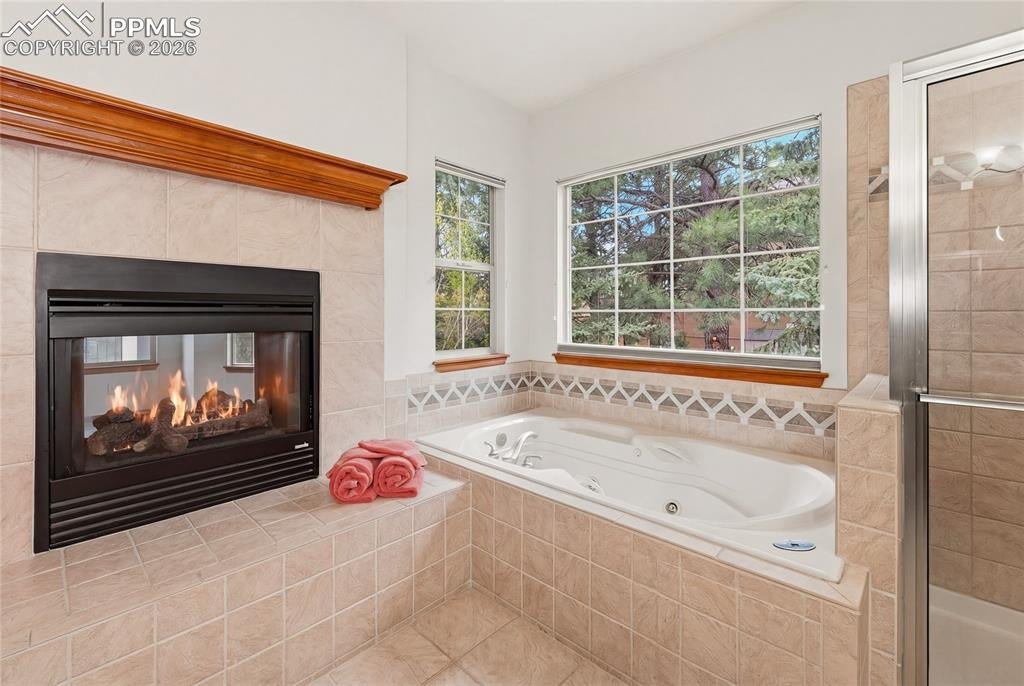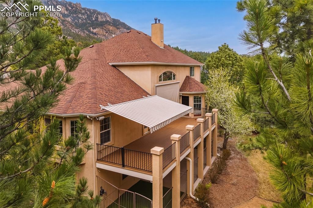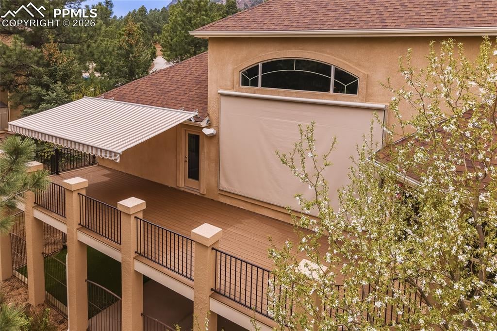 Nestled in the sought-after Spires neighborhood at the base of Cheyenne Mountain, this exceptional home blends elegance, comfort, and natural beauty. Set on a beautifully landscaped lot with mature trees, it offers breathtaking mountain views and inviting outdoor living spaces.The main level is an open, light-filled floor plan designed for both everyday living and refined entertaining. Just off the grand entry, a formal dining room showcases classic crown molding, while a versatile living room or study features a vaulted ceiling, fireplace, and stunning views. The impressive two-story great room is the heart of the home, highlighted by soaring ceilings, a dramatic wall of windows, and a cozy fireplace.The chefs kitchen is well-appointed with a center island, granite countertops, Samsung smart refrigerator, Bosch dishwasher, and JennAir gas cooktop. The adjoining hearth room, with a two-sided fireplace, flows seamlessly into the breakfast nook and out to an expansive deck with an automatic retractable awning and sunshadeperfect for enjoying the flat, usable backyard.The main-level primary suite is a private retreat featuring a two-sided fireplace, luxurious five-piece bath with jetted tub, and a walk-in closet with built-ins. Upstairs, a second primary suite provides added privacy, while two additional bedrooms share a Jack-and-Jill bath.The walk-out basement offers exceptional flexibility with a spacious recreation room, wet bar with dishwasher, and access to a covered, fenced patio with artificial turfideal for pets or play. Two additional basement rooms can serve as bedrooms, a gym, or game rooms. Recent upgrades include: fully rebuilt covered deck with drainage system, fireproof ceiling below on the covered patio with overhead lighting, new railing on deck, driveway concrete repair for easy drive access, stucco repaired and added all around the house, all gutters, downspouts and trim painted. Interior painted. electric shade and awning on rear of home.