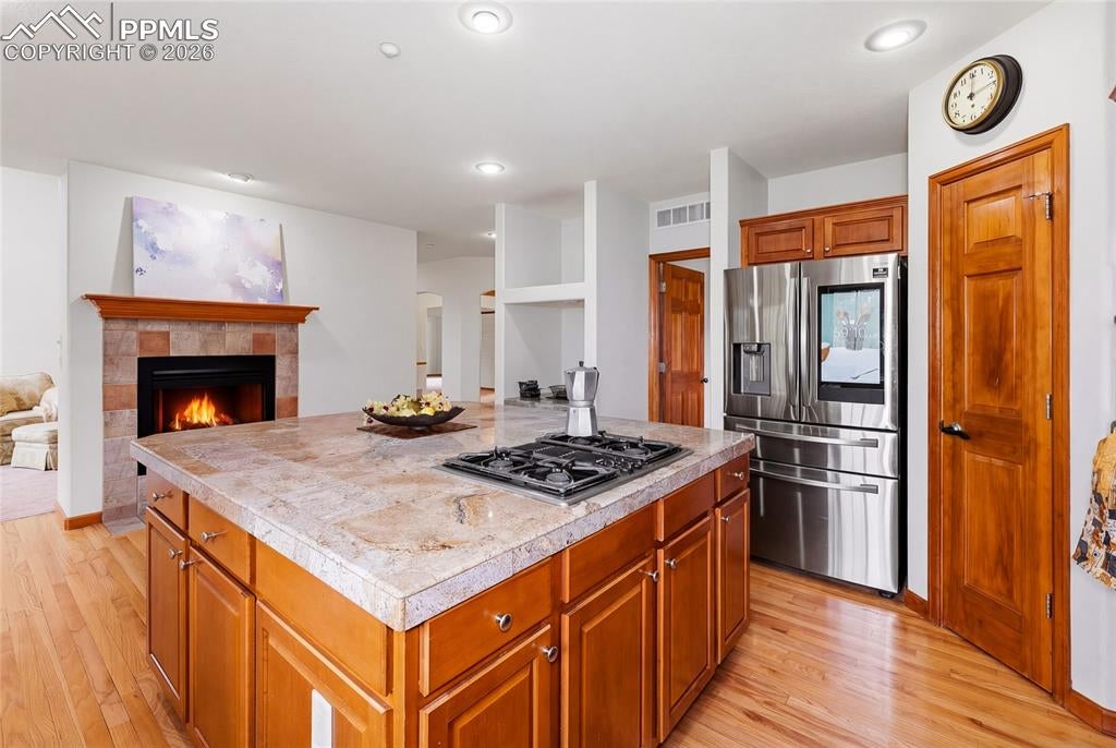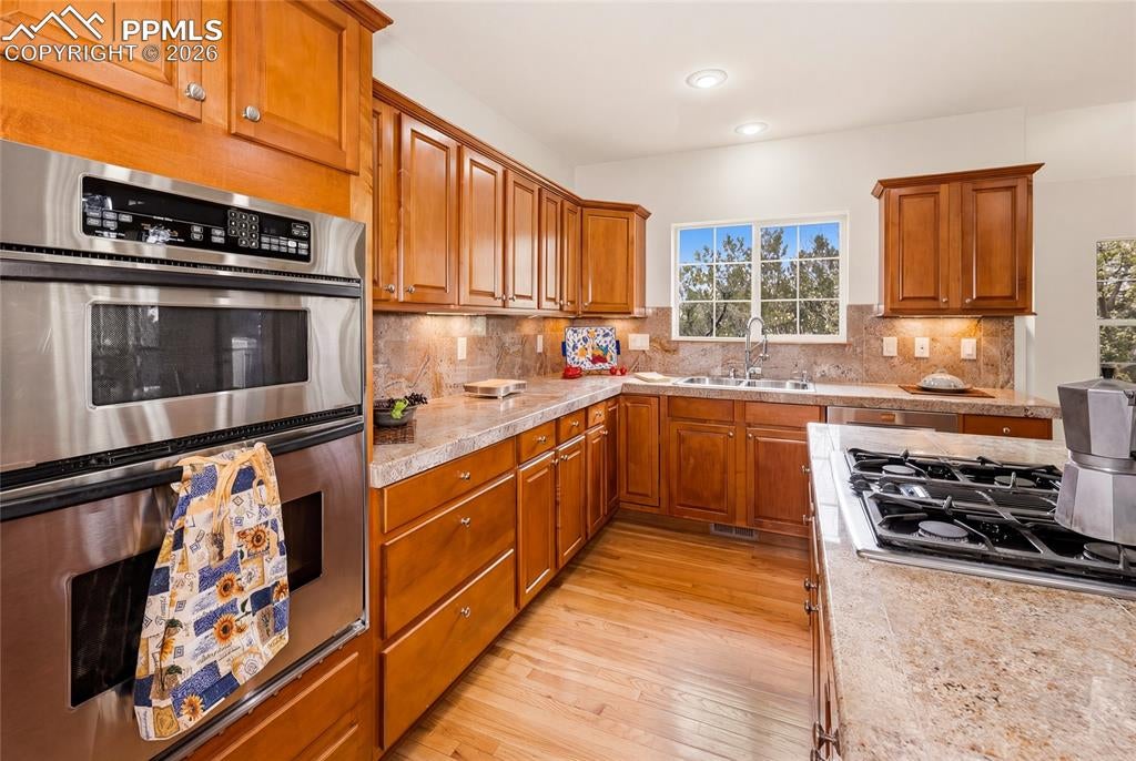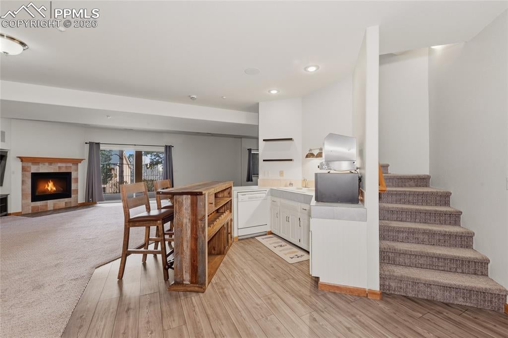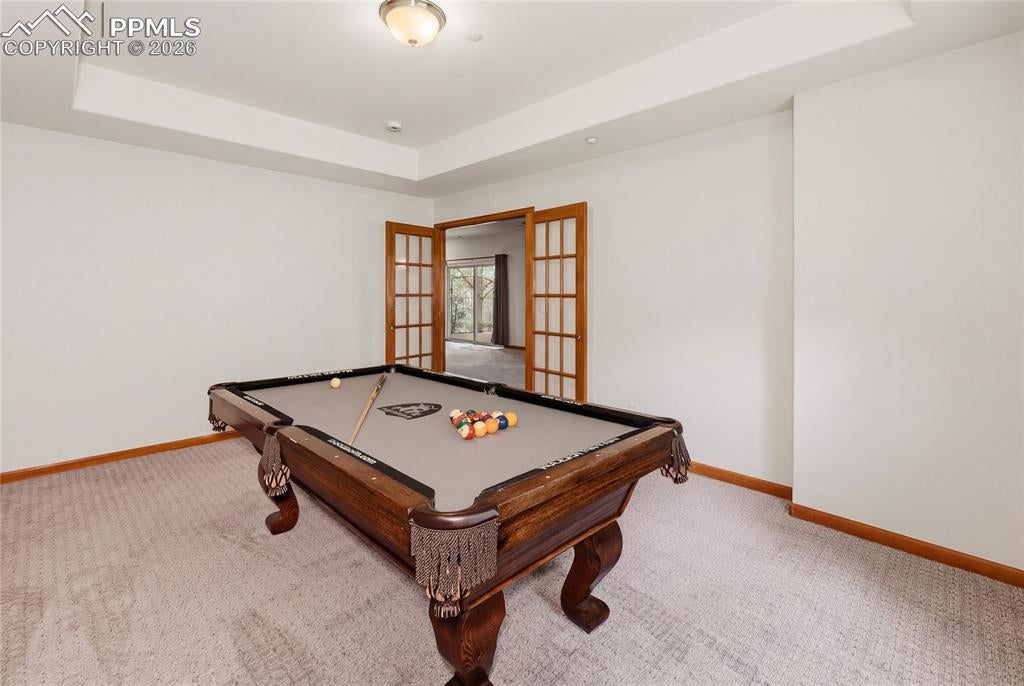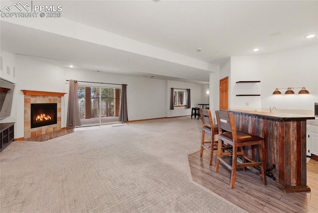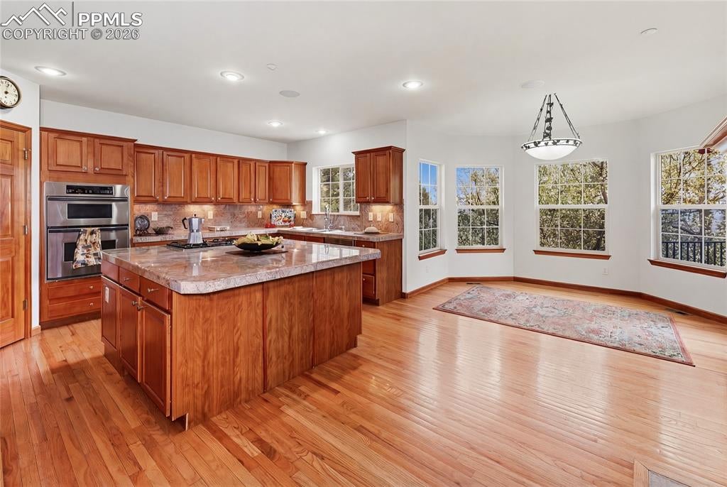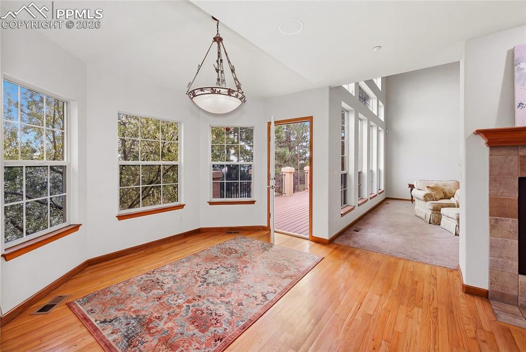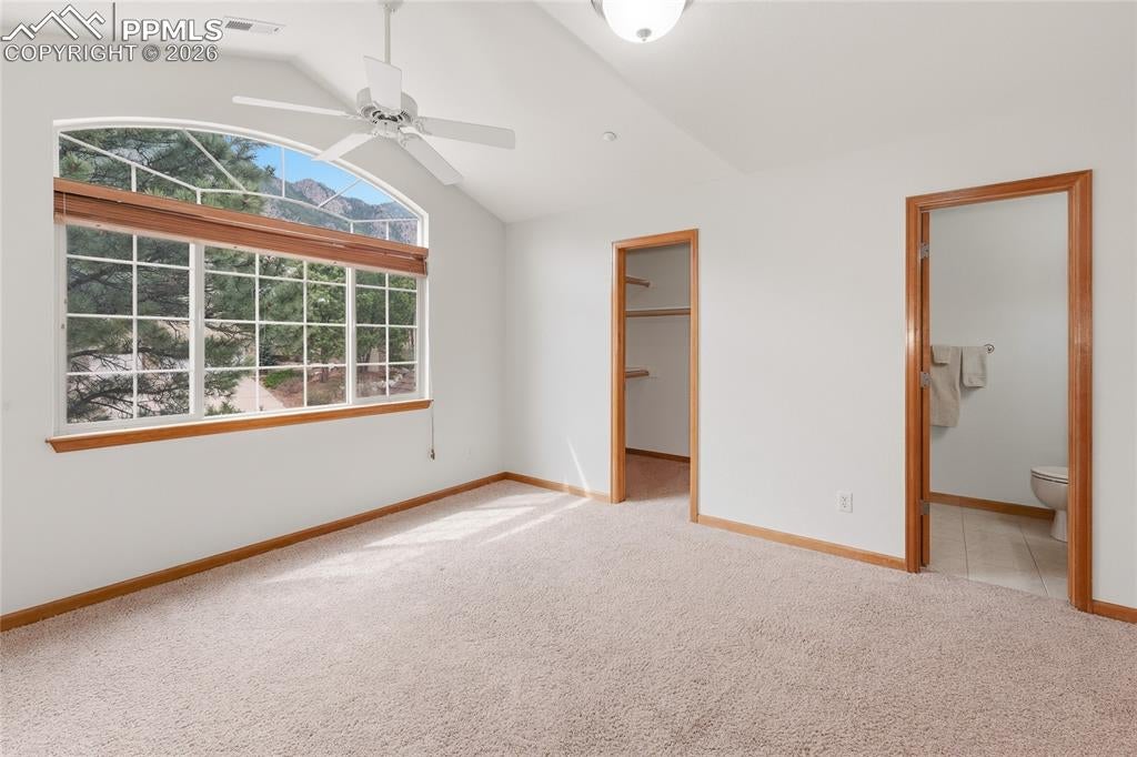 Nestled in the sought-after Spires neighborhood at the base of Cheyenne Mountain, this exceptional home blends elegance, comfort, and natural beauty. Set on a beautifully landscaped lot with mature trees, it offers breathtaking mountain views and inviting outdoor living spaces.The main level is an open, light-filled floor plan designed for both everyday living and refined entertaining. Just off the grand entry, a formal dining room showcases classic crown molding, while a versatile living room or study features a vaulted ceiling, fireplace, and stunning views. The impressive two-story great room is the heart of the home, highlighted by soaring ceilings, a dramatic wall of windows, and a cozy fireplace.The chefs kitchen is well-appointed with a center island, granite countertops, Samsung smart refrigerator, Bosch dishwasher, and JennAir gas cooktop. The adjoining hearth room, with a two-sided fireplace, flows seamlessly into the breakfast nook and out to an expansive deck with an automatic retractable awning and sunshadeperfect for enjoying the flat, usable backyard.The main-level primary suite is a private retreat featuring a two-sided fireplace, luxurious five-piece bath with jetted tub, and a walk-in closet with built-ins. Upstairs, a second primary suite provides added privacy, while two additional bedrooms share a Jack-and-Jill bath.The walk-out basement offers exceptional flexibility with a spacious recreation room, wet bar with dishwasher, and access to a covered, fenced patio with artificial turfideal for pets or play. Two additional basement rooms can serve as bedrooms, a gym, or game rooms. Recent upgrades include: fully rebuilt covered deck with drainage system, fireproof ceiling below on the covered patio with overhead lighting, new railing on deck, driveway concrete repair for easy drive access, stucco repaired and added all around the house, all gutters, downspouts and trim painted. Interior painted. electric shade and awning on rear of home.