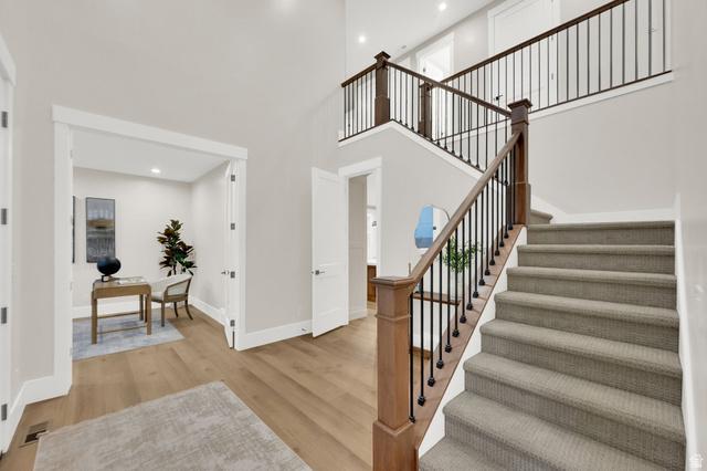 Beautifully designed brand-new custom two-story home loaded with upgrades throughout! This fully finished home offers 6 bedrooms, 4 bathrooms, and a basement entrance with kitchenette, making it ideal for multigenerational living or added flexibility. Step into an impressive two-story entry with custom railing and a spacious main-floor office. The open-concept living room features a cozy fireplace and large gathering area, perfect for entertaining. The gourmet kitchen showcases a butlers pantry, double ovens, 6-burner gas range, quartz countertops, custom soft-close cabinetry, oversized refrigerator/freezer combo, and pebble ice machine. The luxurious primary suite includes its own fireplace and amazing views, along with a spa-style bathroom featuring a walk-in shower with four shower heads, garden tub, and oversized walk-in closet. Upstairs youll find four additional bedrooms and a large laundry room with cabinetry and quartz countertops. The fully finished basement offers a separate entrance, kitchenette with custom cabinetry and quartz countertops, laminate flooring, second laundry room, large storage room, cold storage, and two additional bedrooms. Additional features include two energy-efficient furnaces, tankless water heater, and a huge 3-car garage with insulated doors, an oversized 12-ft-high garage door, and epoxy floor finish. Situated on a beautiful fully landscaped cul-de-sac lot in the exclusive Myers Park community, a private neighborhood with only 15 custom homes. Conveniently located just off 11800 S Myers Park Ln in the Riverton/South Jordan area, only 8 minutes to I-15. HOA includes water, garbage, and snow removal. Move-in ready - must see to fully appreciate!
