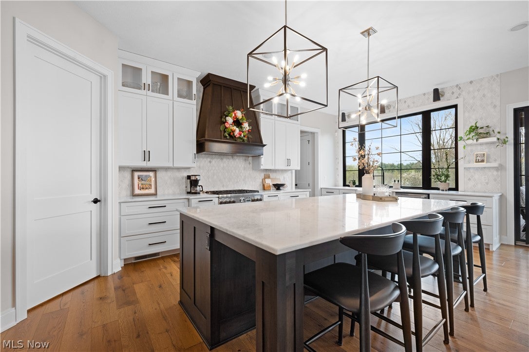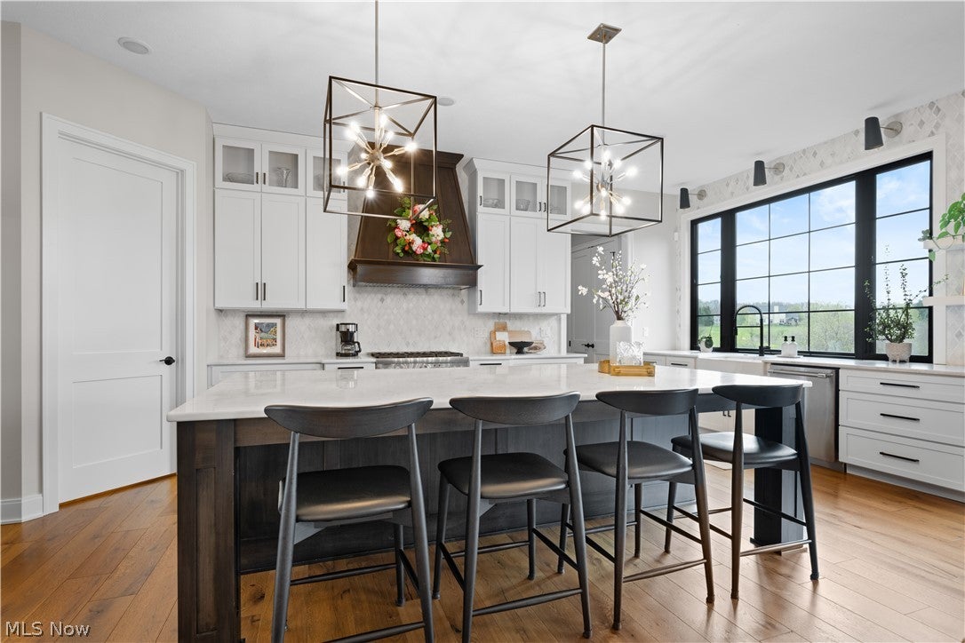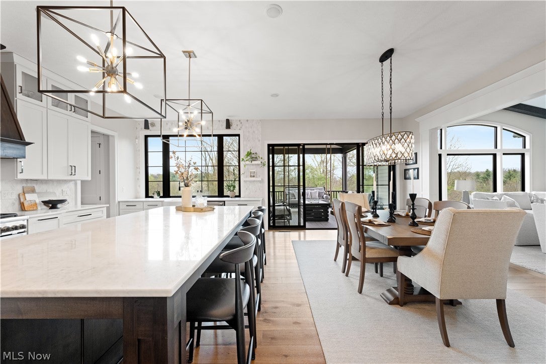 Step through the front door and you immediately feel this is a home where intention meets artistry. Sunlight pours through **Milgard Ultra Series windows**, dancing across carefully curated spaces, while a striking solid metal entry sets the tone for the craftsmanship found within. At the center of it all, the kitchen invites connection.