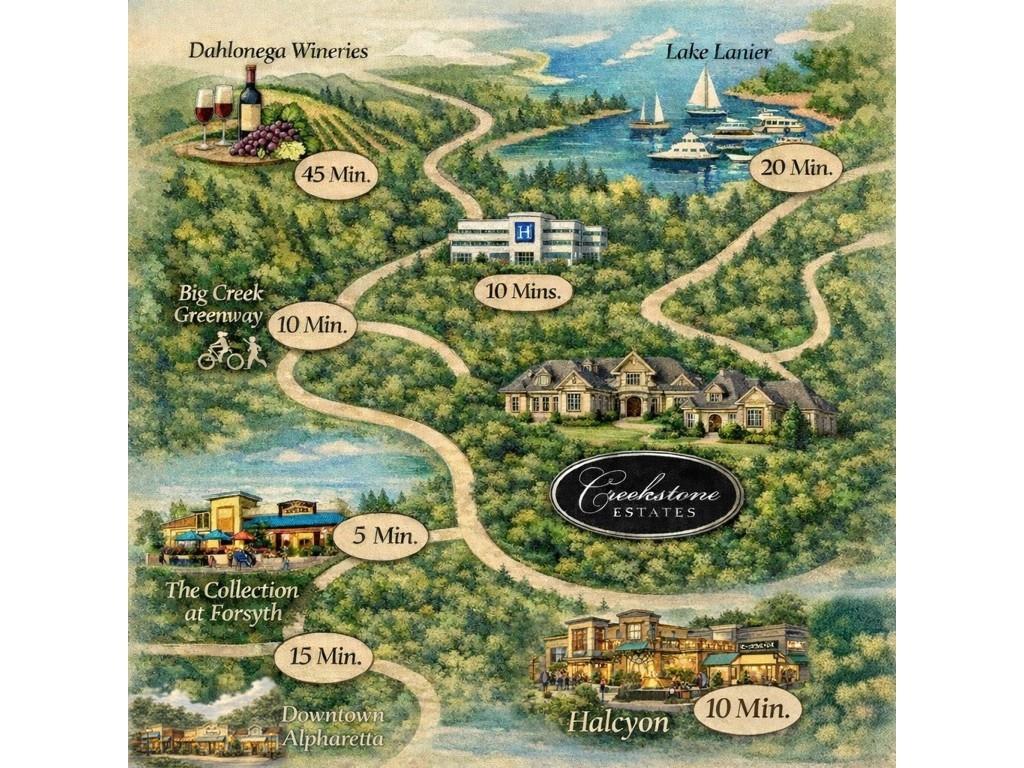 Imagine waking each day to the quiet beauty of serene lake views in one of South Forsyths most sought-after luxury communities. Perfectly positioned on one of Creekstone Estates rare and coveted LAKE LOTS with a floating dock! This exceptional home sits on a private cul-de-sac street, set back with a large, flat front yard for added privacy and presence. It pairs breathtaking scenery with a beautifully designed, light-filled floor plan featuring a desirable GUEST SUITE ON THE MAIL LEVEL, created for both elegant entertaining and comfortable everyday living. Built with impressive quality and craftsmanship, this home presents a truly exceptional opportunity. Expansive windows and high ceilings throughout the home invite the outdoors in, filling the living spaces with natural light while showcasing tranquil views of the water. From the moment you step inside, the homes bright and open design is immediately evident. A dramatic TWO-STORY FAMILY ROOM showcases a spectacular wall of windows that floods the main level with natural light while framing picturesque views of the lake. The expansive kitchen serves as the heart of the home, overlooking the breakfast area and a warm fireside keeping room, creating an inviting space where everyone naturally gathers. Outdoor living is just as impressive. A SCREENED-IN, COVERED PORCH with thoughtfully placed skylights creates a bright and welcoming retreat, allowing you to enjoy the outdoors while taking in peaceful lake views throughout the day. Just below, a stone patio with outdoor fireplace offers the perfect setting for relaxing evenings or entertaining friends and family. with the privacy of a FENCED BACKYARD. Throughout the home, beautiful trim detail and craftsmanship add timeless character and elegance, and in total the residence features five fireplaces, adding warmth and charm throughout the living spaces. Upstairs, the home continues to impress with a thoughtfully designed layout featuring spacious secondary bedrooms, each with its own private ensuite bath, offering comfort and privacy for family members and guests. The oversized owners suite serves as a true private retreat, highlighted by a beautiful fireside sitting room that creates a warm and relaxing escape within the suite itself. The finished terrace level expands the homes living and entertaining possibilities with large open recreation spaces, a bar, and wine cellar, creating the perfect setting for gatherings. Residents of Creekstone Estates enjoy resort-style amenities, including a 9,000-square-foot clubhouse with fitness center, Junior Olympic swimming pool, tennis courts with active teams, and beautifully maintained grounds that define luxury community living. Located in the heart of South Forsyth, the community is minutes from Halcyon, The Collection at Forsyth, Downtown Alpharetta, and the future Gathering at South Forsyth, placing premier shopping, dining, and entertainment just moments away. Listing agent is available for a private tour! SELLER OFFERING 10K IN CLOSING COSTS.