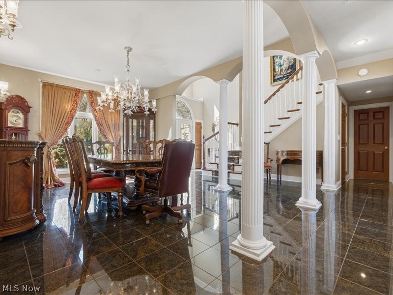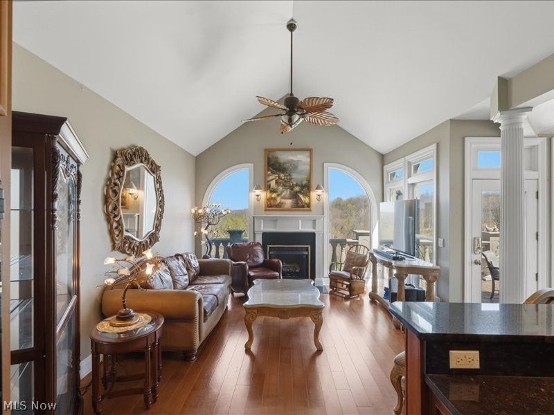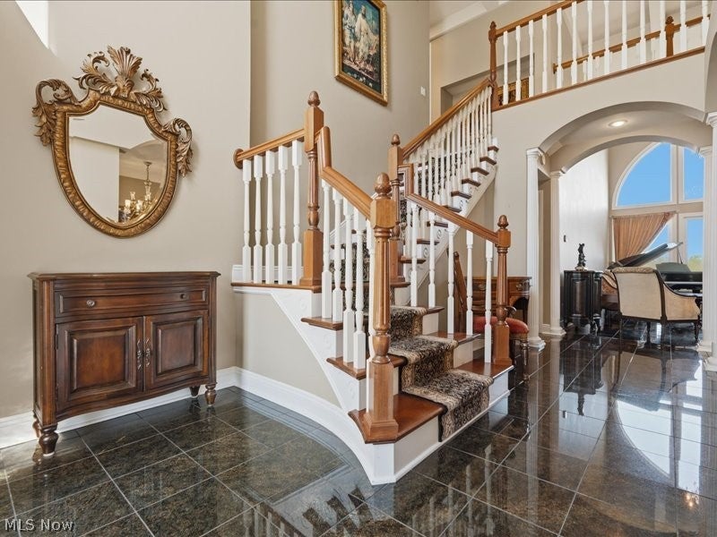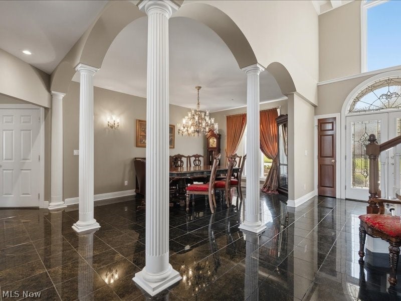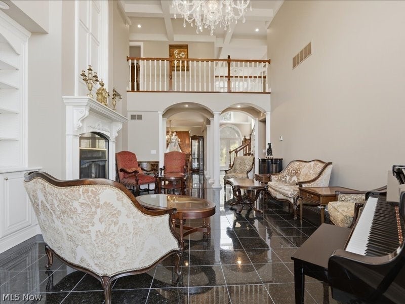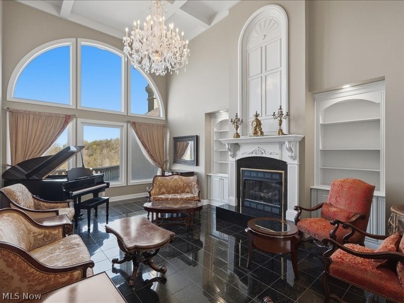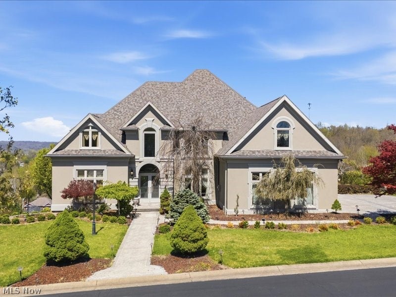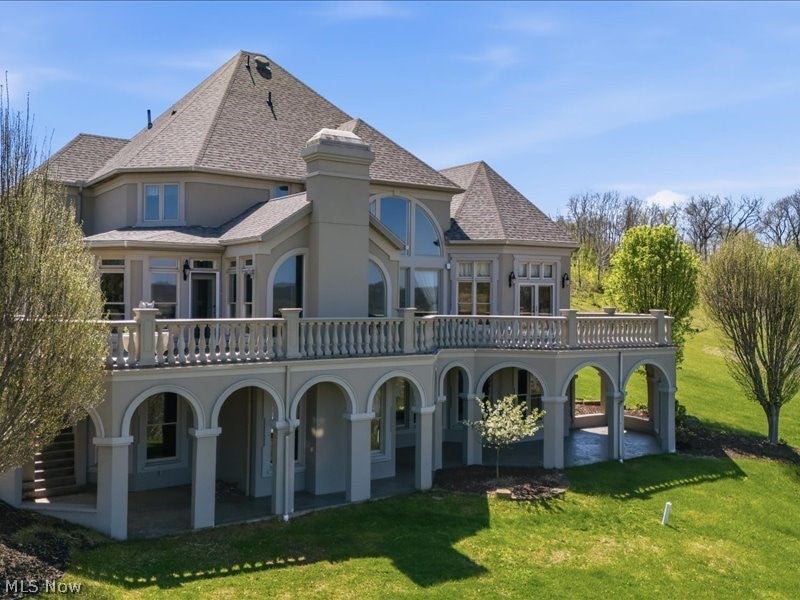 One of a kind architectural design with a presence! Artfully designed and custom built you have it all with six bedrooms, including a first floor ensuite, three fireplaces, and custom architectural accents that were well planned in this beautiful home. Your view is breathtaking with a large wrap around balcony and a lower stamped patio from the lower level living quarters. Beautiful marble floors, and coffered high ceilings in the grand entrance with stately marble floors extending through the formal living area providing large windows for natural light. The dining area windows are accented with totally custom handmade draperies. Entering the kitchen, it opens into a family room with cathedral ceilings, gas fireplace and more light friendly large windows. A morning room awaits with open design more large windows and a unique circular textured ceiling. Need space for family members, there is over 2300 sq feet of finished completely private living in the lower level of home with exterior access. Additional amenities include two custom motorized chandeliers one in grand entry foyer, one in formal living, 2 separate laundry areas, central vac, multiple HVAC systems, custom designed window treatments throughout, and new roof Sept 2025. Home sits on two parcels, totaling .98 acres. The vacant parcel is buildable however it would also make wonderful space for a private pool area. The community is gated. Nearby amenities include schools, houses of worship, shopping, hospitals, grocery, public park, restaurants and easy access to major highways.