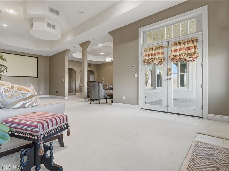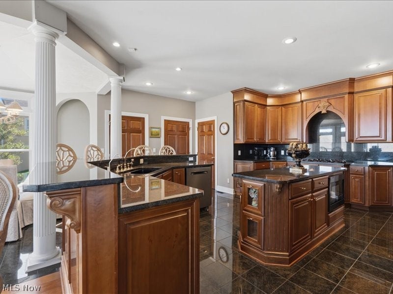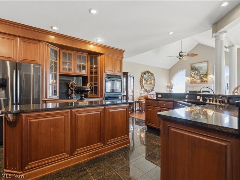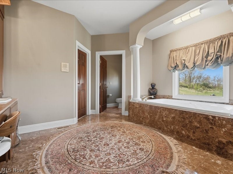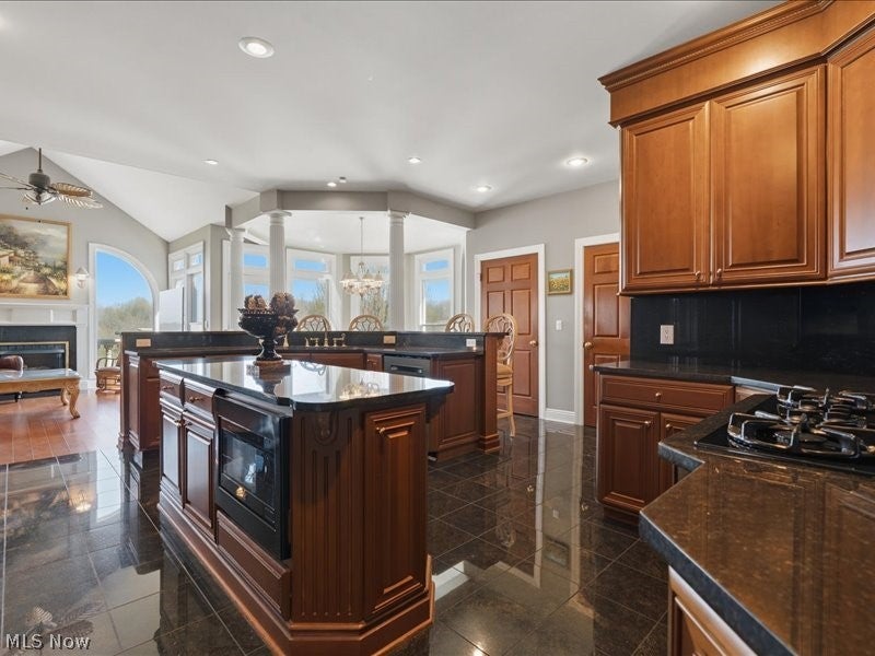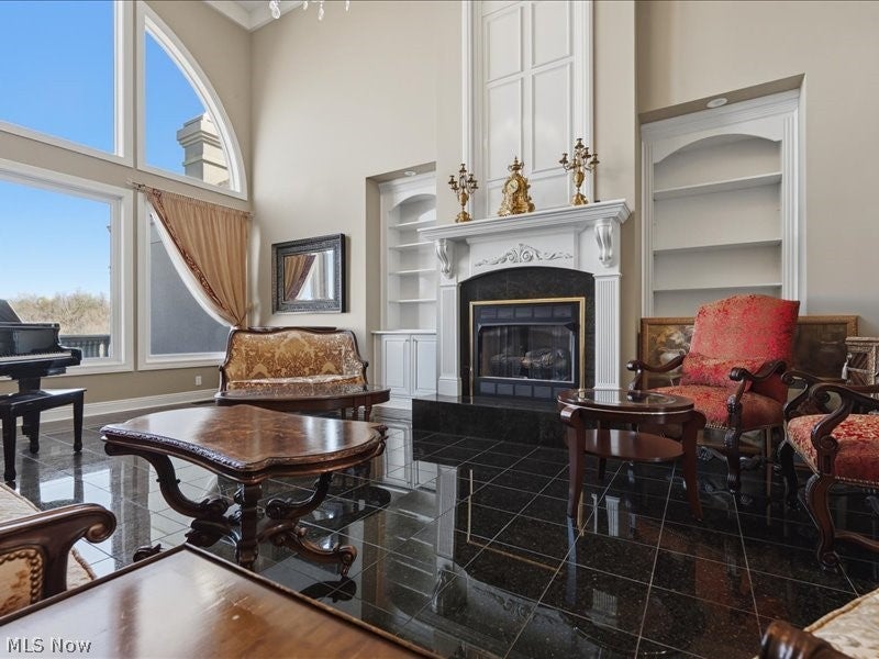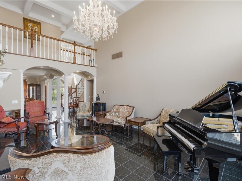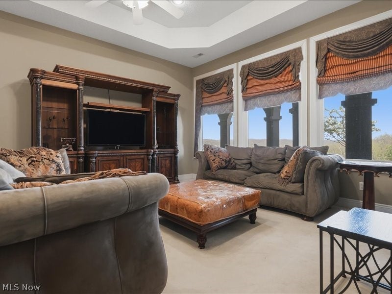 One of a kind architectural design with a presence! Artfully designed and custom built you have it all with six bedrooms, including a first floor ensuite, three fireplaces, and custom architectural accents that were well planned in this beautiful home. Your view is breathtaking with a large wrap around balcony and a lower stamped patio from the lower level living quarters. Beautiful marble floors, and coffered high ceilings in the grand entrance with stately marble floors extending through the formal living area providing large windows for natural light. The dining area windows are accented with totally custom handmade draperies. Entering the kitchen, it opens into a family room with cathedral ceilings, gas fireplace and more light friendly large windows. A morning room awaits with open design more large windows and a unique circular textured ceiling. Need space for family members, there is over 2300 sq feet of finished completely private living in the lower level of home with exterior access. Additional amenities include two custom motorized chandeliers one in grand entry foyer, one in formal living, 2 separate laundry areas, central vac, multiple HVAC systems, custom designed window treatments throughout, and new roof Sept 2025. Home sits on two parcels, totaling .98 acres. The vacant parcel is buildable however it would also make wonderful space for a private pool area. The community is gated. Nearby amenities include schools, houses of worship, shopping, hospitals, grocery, public park, restaurants and easy access to major highways.