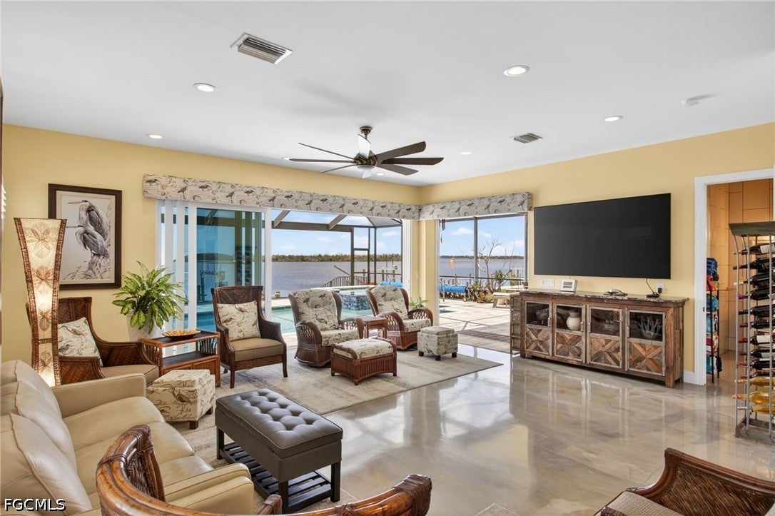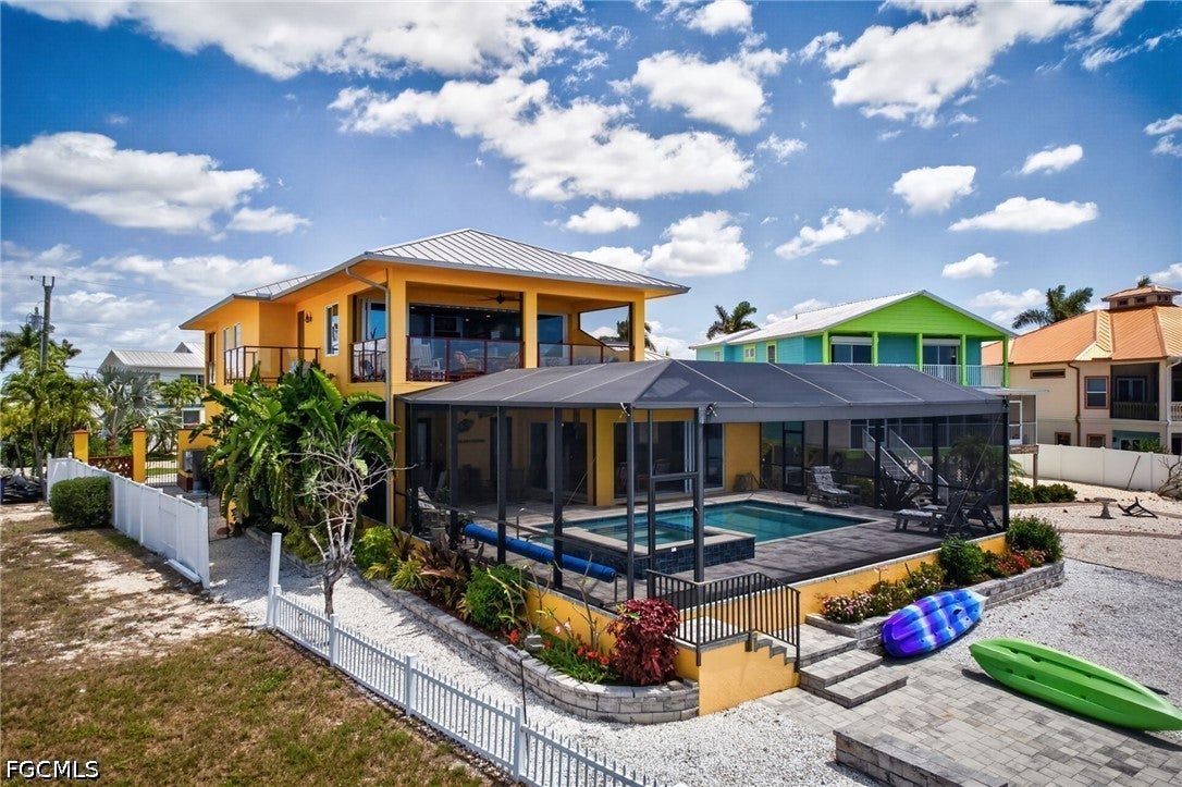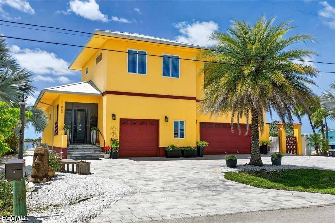 This unique custom-built waterfront home offers direct access to the Gulf of Mexico and boasts expansive water views that are sure to impress. BUILT IN 2020, this property features multiple balconies, decks, and rooms designed to capture Matlachas serene coastal vibe. Situated on direct Gulf access with no bridges to slow you down, the home includes a new SEAWALL with a TREX DOCK and a COVERED 10,000lb BOAT LIFT, providing convenient storage and protection, all right in your own backyard.Upon entering through the leaded glass doors, you will be greeted by the warmth of sunlight reflecting off the stunning custom-designed epoxy flooring that flows throughout the main floor. The main floor features a divided primary bedroom with an en-suite and access to the private Orchid deck. The west facing primary offers direct access to the pool deck and the screened lanai which features ELECTRIC ROLL DOWN SHADES for easy sun control. The main floor also includes a laundry area, open concept kitchen, dining, and living areas. The spacious Chefs Kitchen features beautiful maintenance-free CAMBRIA QUARTZ countertops and top-of-the-line BLACK STEEL appliances. Family and guests can enjoy socializing with the cook while seated at the EXPANSIVE serving island before heading to the lanai and pool deck to savor the breathtaking water views.Upstairs, a spacious family room awaits, accessible by a PRIVATE ELEVATOR. The second floor includes a primary bedroom with an en-suite and a sitting area. There is also a second-floor laundry, a bonus area, observation deck, a family room with kitchen facilities, and a screened porch also outfitted with electric roll-down shades. There are two additional bedrooms, one with an en-suite and the other bedroom with easy access to the screened balcony at the front of the house. Its always fun to watch the boats head out Matlacha Pass while enjoying your morning coffee and watching the sunrise! The bottom ground floor features a three-car garage/workshop designed to function seamlessly in the event of severe weather. All important elements such as A/C, electric, and plumbing are raised high along block walls to avoid impact from severe weather. Additionally, there is no sheetrock, only cement block which can be easily hosed down if needed.This property offers a one-of-a-kind Matlacha living experience, combining luxury, convenience, and coastal charm in a picturesque waterfront setting.