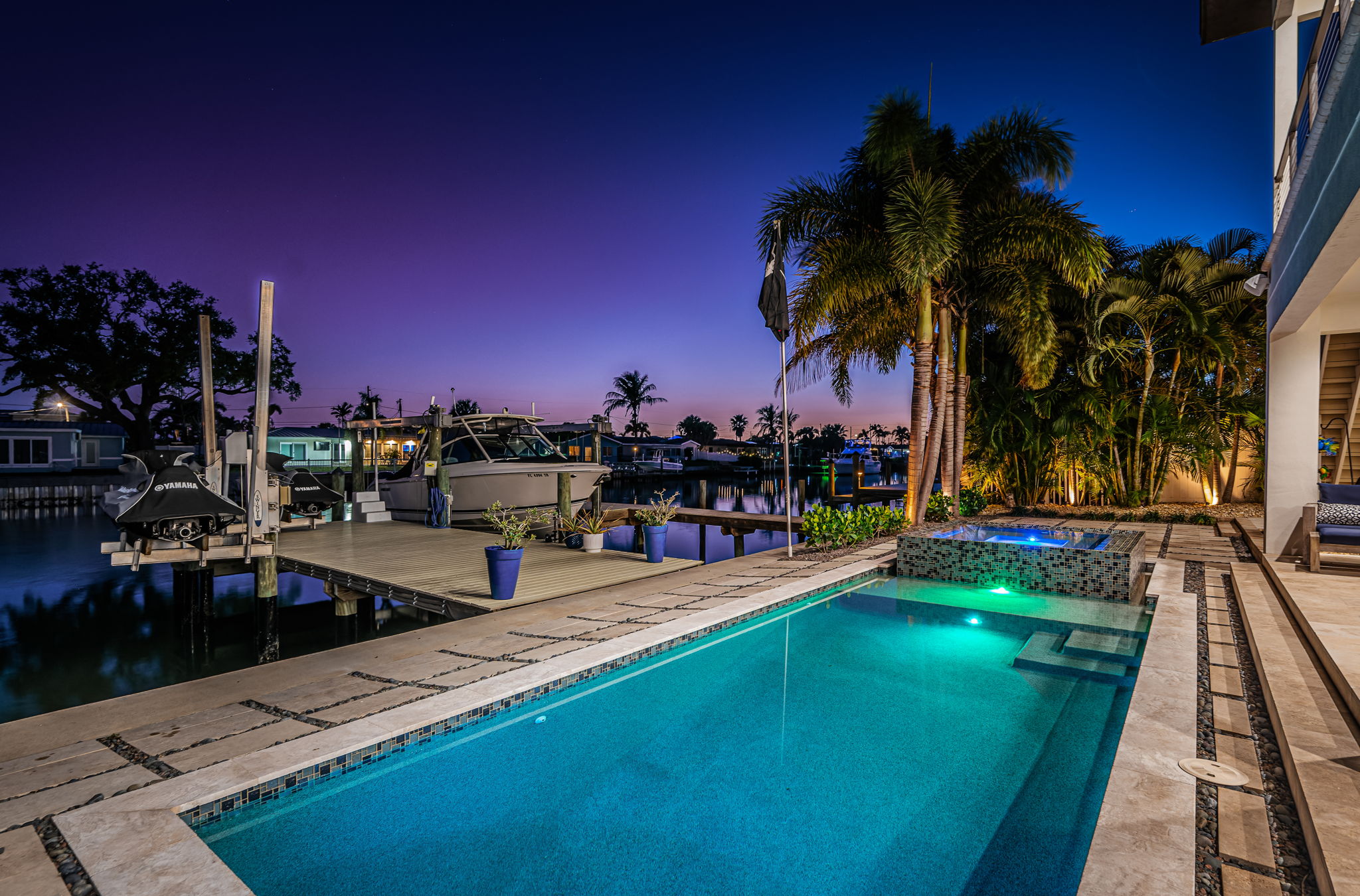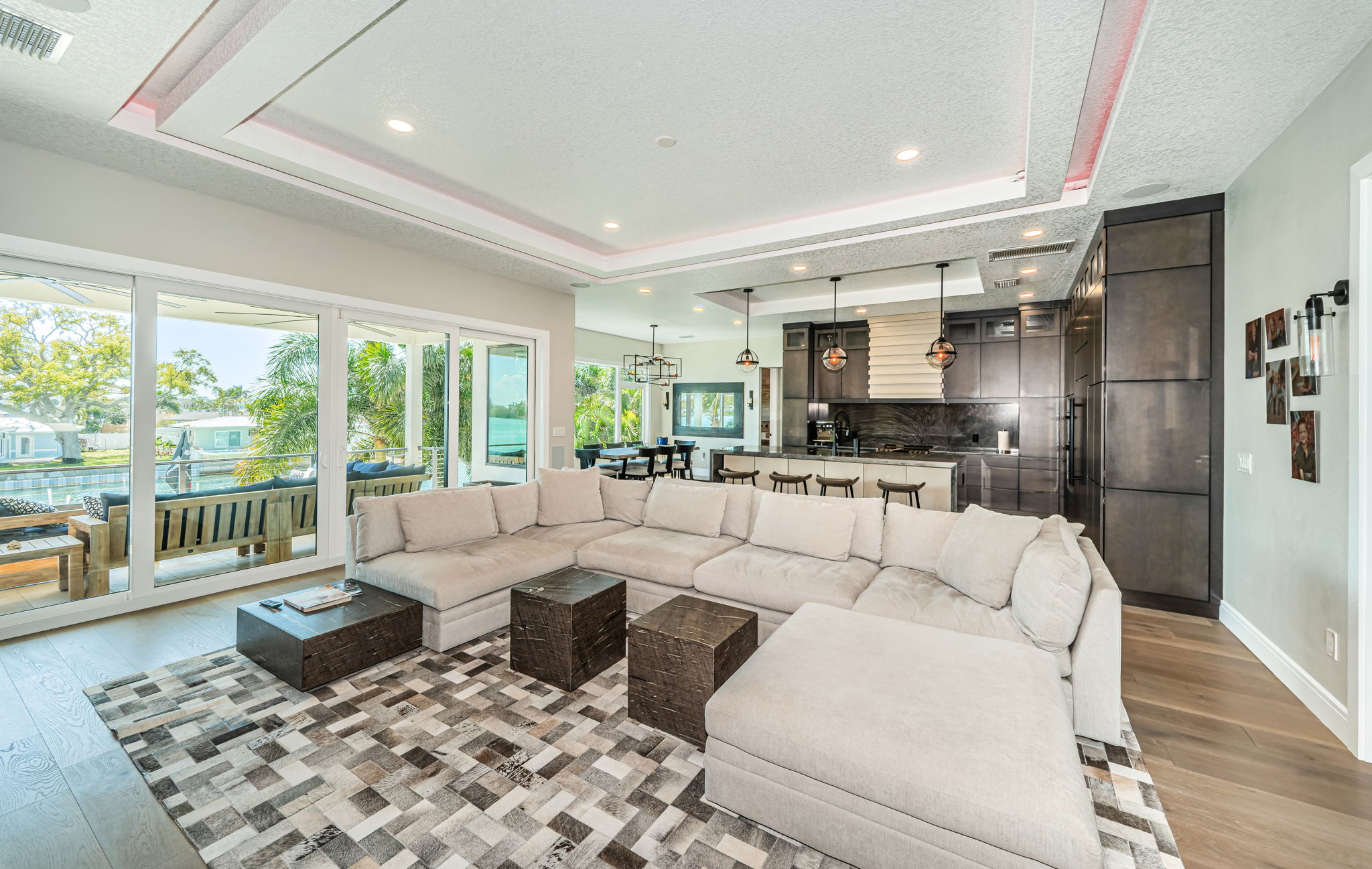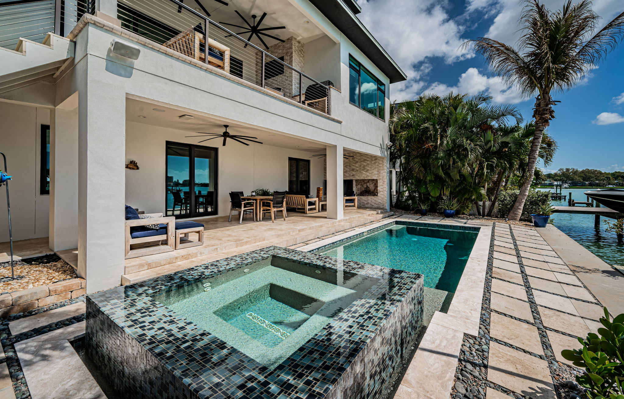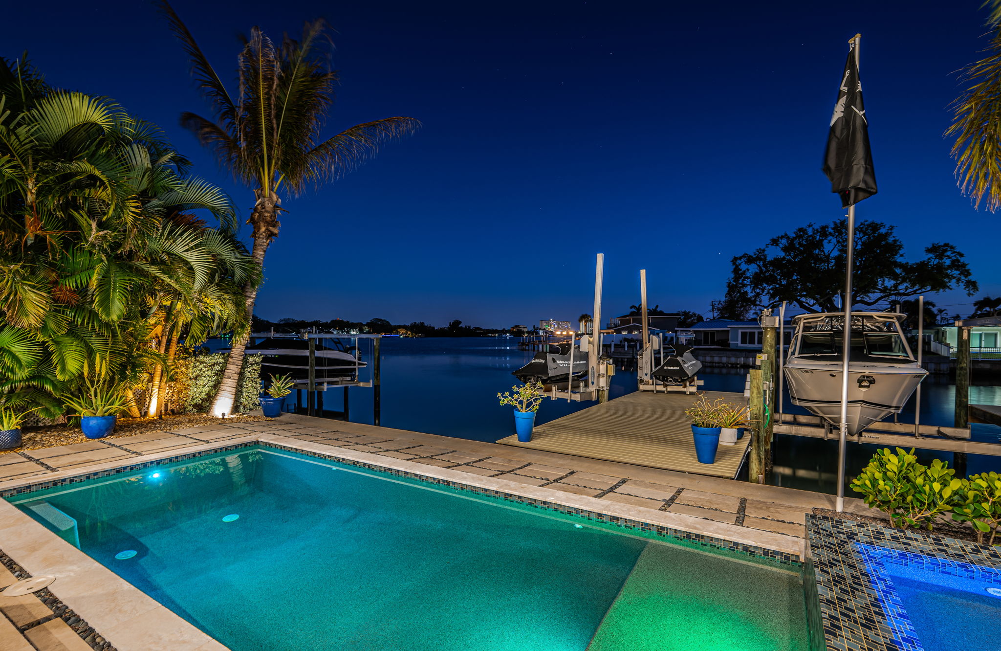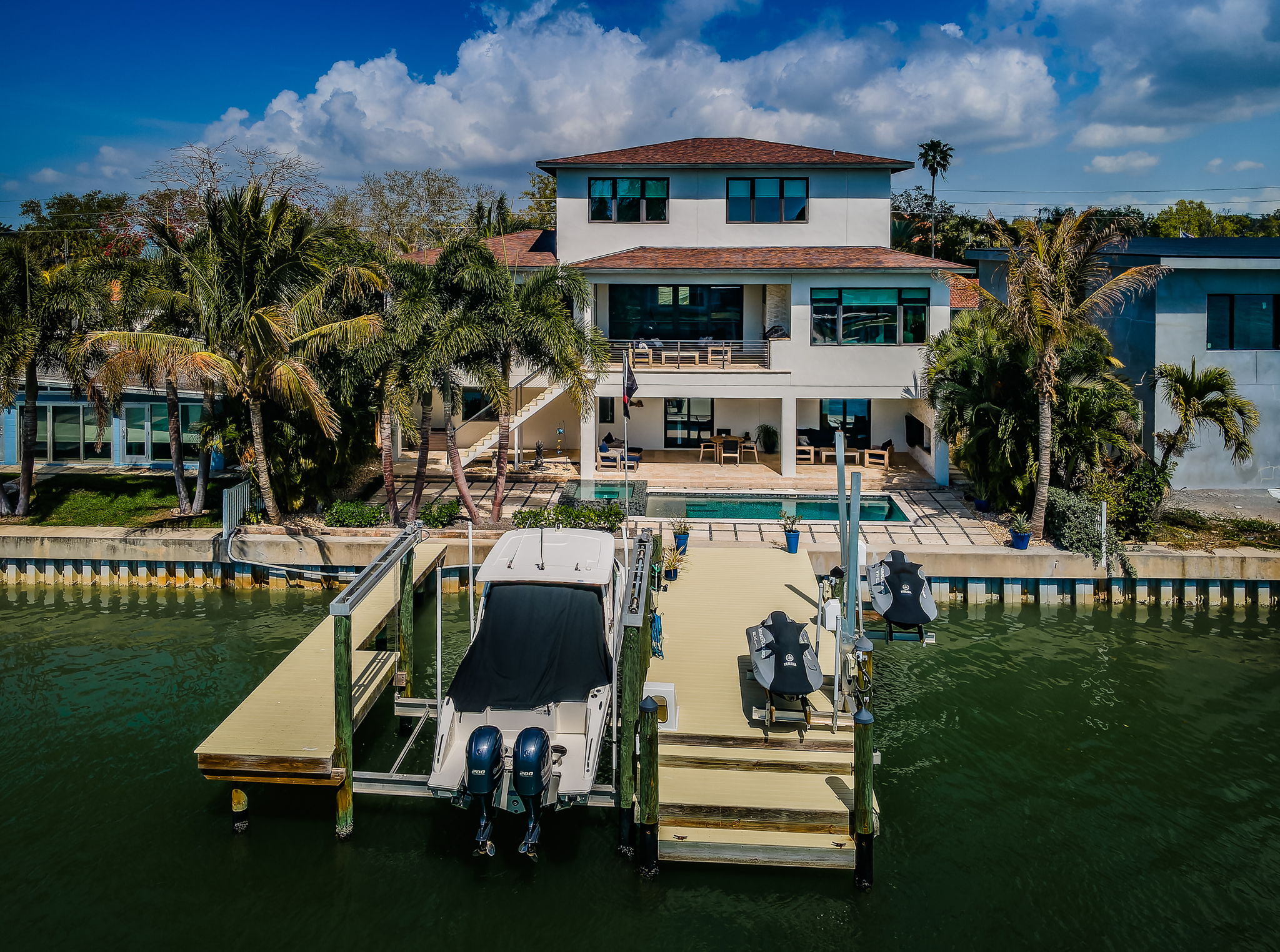 DAZZLING COASTAL CONTEMPORARY ELEGANCE WITH EXCEPTIONAL CUSTOM DESIGNER FINISHES! Lushly landscaped with a striking curbside appeal, this remarkable waterfront estate residence boasts rich structural symmetry and elite exterior finishes. Beyond its towering covered entry, discover numerous luxury upgrades, beautiful wood flooring, impressive custom ceilings, radiant lighting and poshly-tailored built-ins. Step inside the magnificent great room overlooking the waterfront. Your grand living room area enjoys a bespoke media wall with fireplace, built-in surround sound, and a lovely wet bar with beverage chiller and icemaker. The sumptuous chef’s kitchen is an eye-catching delight, with double-thick quartz waterfall counters, quartz backsplash, high-quality appliances, a hidden pantry closet, and a huge island bar. The wonderful open concept dining area overlooks the waterfront. Step out to the luxurious 250sqft covered waterfront balcony with built-in, tumbled marble media wall/fireplace and gas grilling center. The resplendent owner’s suite features attractive window treatments, a spacious walk-in closet system and big window views of waterfront. The plush, inspiring owner’s bath offers two exquisite vanities, a dedicated cosmetics center, impressive herringbone-pattern tilework, a pampering stand-alone soaking tub, and a spectacular glass rainshower enclosure. You’ll appreciate the large modern office (with designer built-ins) suitable as a den or separate media room. Upper level includes a fine sitting area and three large bedroom suites (two of which overlook the water) with excellent closet systems and gracefully-appointed with superb finishes. Lower level has a significant oversized multi-purpose area ideal for storage/fitness/gaming. Step out back and discover the true definition of outdoor luxury living. 545sqft finished covered deck with exceptional pavers and tumbled marble media/fireplace wall, transitions to a stunning Pebbletec pool with beautifully-tiled 4-sided spill-over spa. Thick tropical landscaping encloses the backyard area – assuring privacy. Updated seawall and composite dock support 2 Swinger jetski lifts and a 16,000lb boat lift with catwalk (for accessing both sides of boat). Incredible laundry facility provides two washers/dryers, beautiful counters and substantial storage. Fine 3-stop elevator. Many, many extras. This is an extraordinary custom waterfront home close to the beaches and less than a 15-minute drive to downtown St. Petersburg. Dimensions are estimates, buyer to verify.