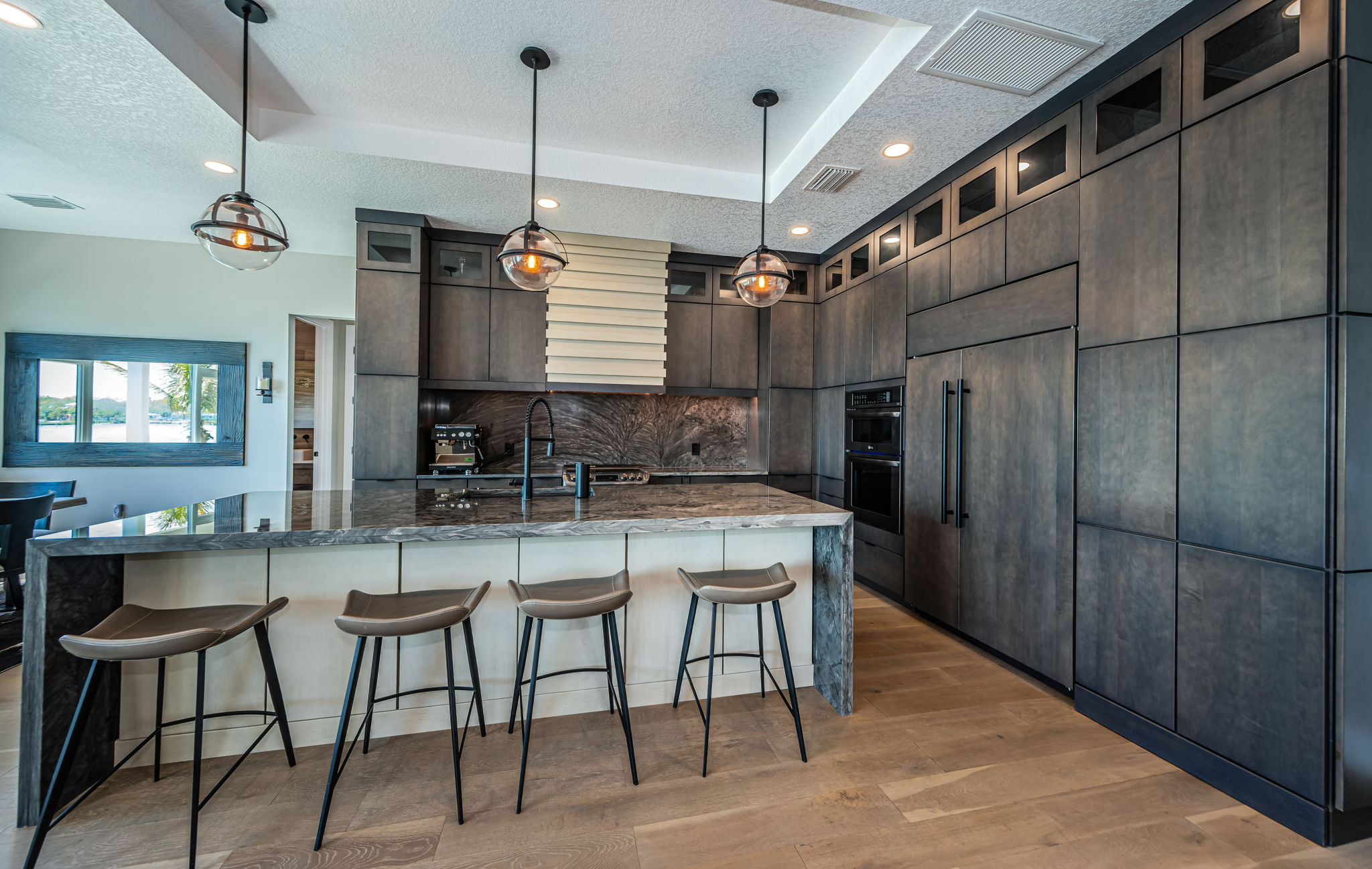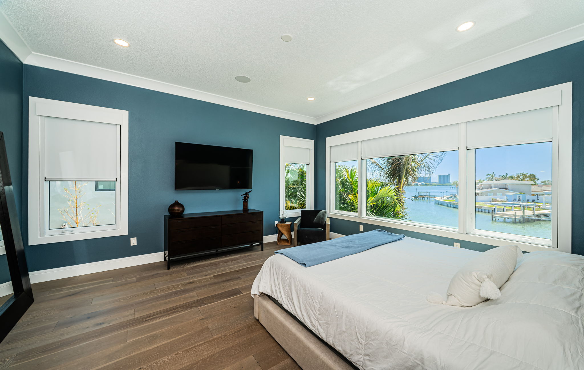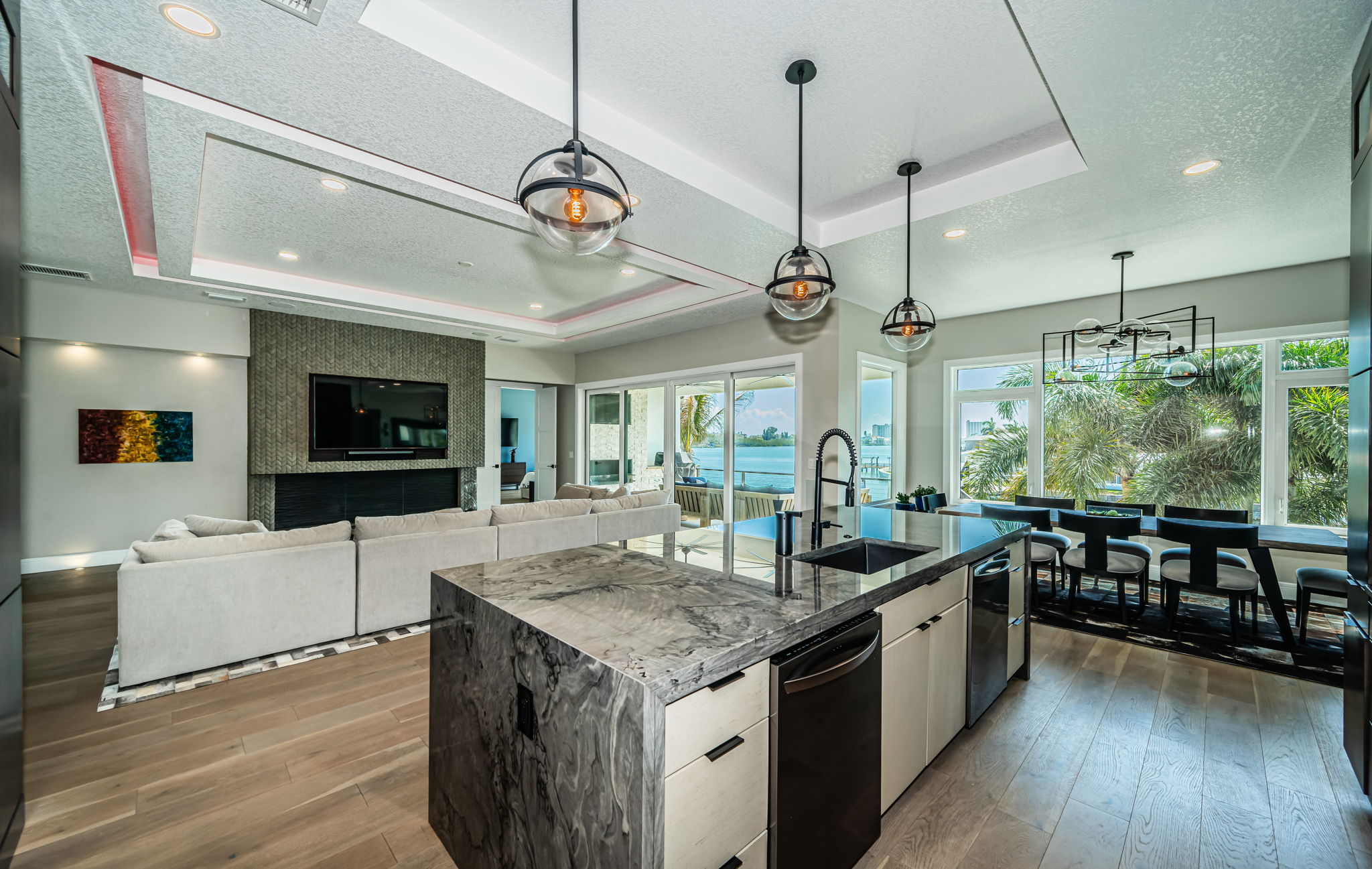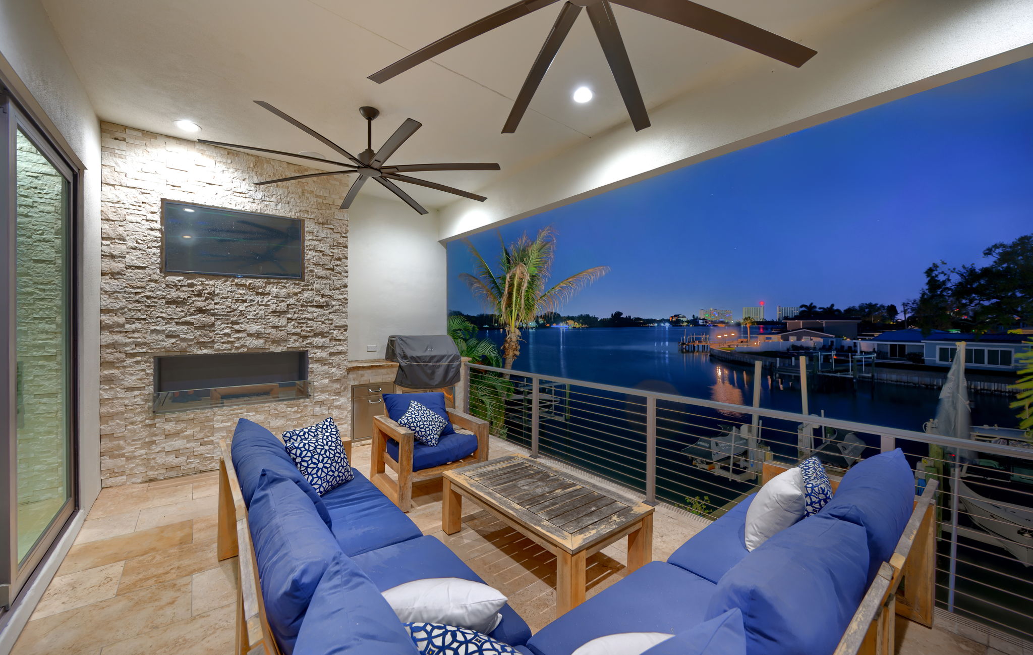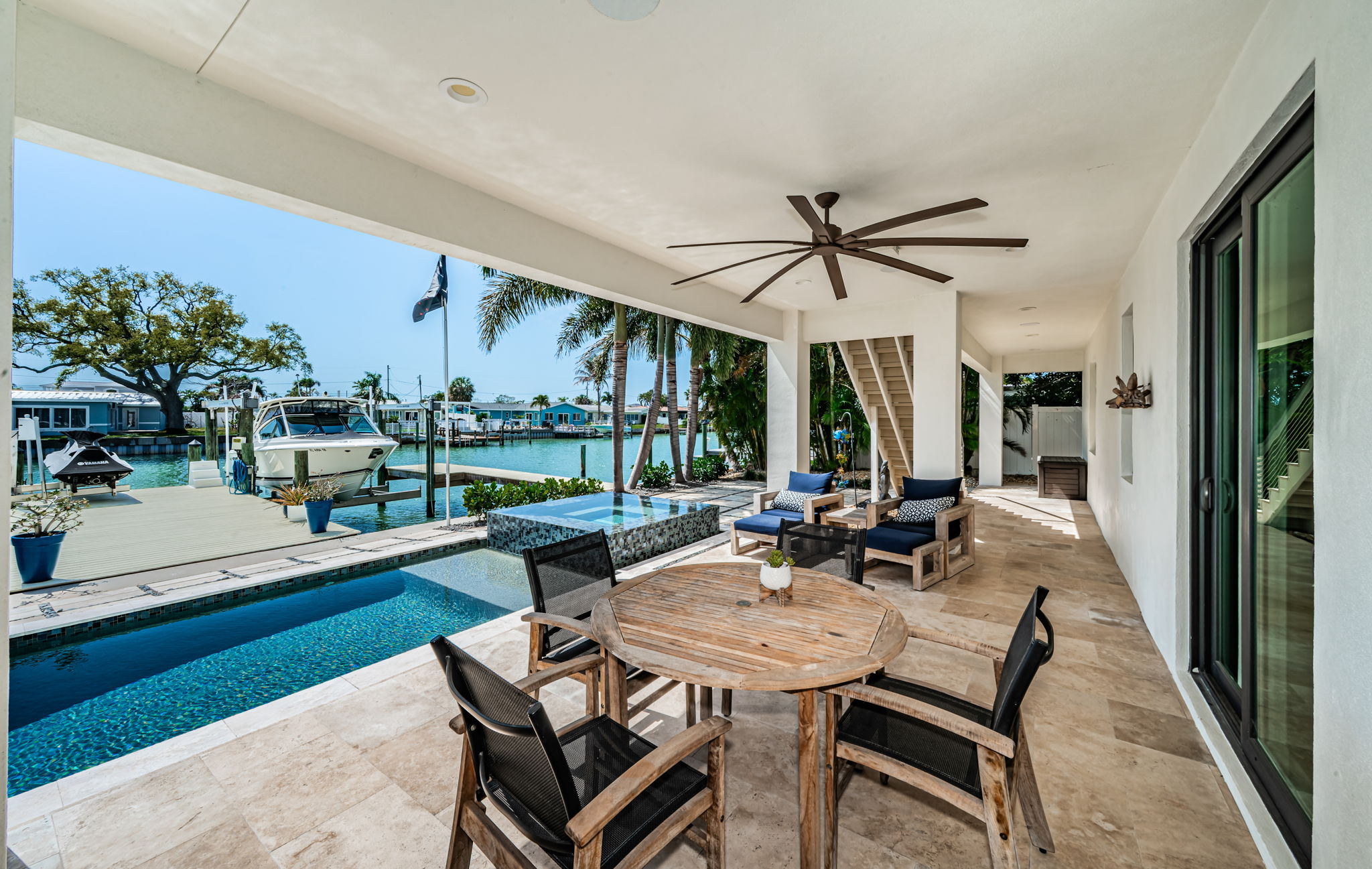 DAZZLING COASTAL CONTEMPORARY ELEGANCE WITH EXCEPTIONAL CUSTOM DESIGNER FINISHES! Lushly landscaped with a striking curbside appeal, this remarkable waterfront estate residence boasts rich structural symmetry and elite exterior finishes. Beyond its towering covered entry, discover numerous luxury upgrades, beautiful wood flooring, impressive custom ceilings, radiant lighting and poshly-tailored built-ins. Step inside the magnificent great room overlooking the waterfront. Your grand living room area enjoys a bespoke media wall with fireplace, built-in surround sound, and a lovely wet bar with beverage chiller and icemaker. The sumptuous chef’s kitchen is an eye-catching delight, with double-thick quartz waterfall counters, quartz backsplash, high-quality appliances, a hidden pantry closet, and a huge island bar. The wonderful open concept dining area overlooks the waterfront. Step out to the luxurious 250sqft covered waterfront balcony with built-in, tumbled marble media wall/fireplace and gas grilling center. The resplendent owner’s suite features attractive window treatments, a spacious walk-in closet system and big window views of waterfront. The plush, inspiring owner’s bath offers two exquisite vanities, a dedicated cosmetics center, impressive herringbone-pattern tilework, a pampering stand-alone soaking tub, and a spectacular glass rainshower enclosure. You’ll appreciate the large modern office (with designer built-ins) suitable as a den or separate media room. Upper level includes a fine sitting area and three large bedroom suites (two of which overlook the water) with excellent closet systems and gracefully-appointed with superb finishes. Lower level has a significant oversized multi-purpose area ideal for storage/fitness/gaming. Step out back and discover the true definition of outdoor luxury living. 545sqft finished covered deck with exceptional pavers and tumbled marble media/fireplace wall, transitions to a stunning Pebbletec pool with beautifully-tiled 4-sided spill-over spa. Thick tropical landscaping encloses the backyard area – assuring privacy. Updated seawall and composite dock support 2 Swinger jetski lifts and a 16,000lb boat lift with catwalk (for accessing both sides of boat). Incredible laundry facility provides two washers/dryers, beautiful counters and substantial storage. Fine 3-stop elevator. Many, many extras. This is an extraordinary custom waterfront home close to the beaches and less than a 15-minute drive to downtown St. Petersburg. Dimensions are estimates, buyer to verify.