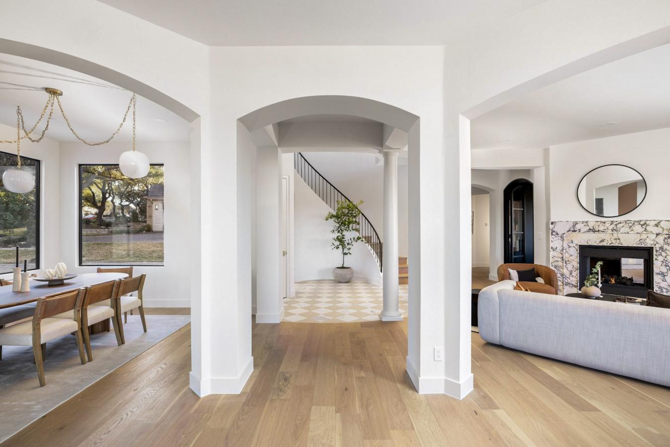 Completely reimagined within the gated enclave of Governors Hill in Barton Creek, this residence has undergone a down-to-the-studs renovation executed with an exceptional level of craftsmanship and design. Extensive updates throughout represent a significant capital investment, resulting in a home that lives like new construction while preserving the character of its original setting. From the moment you enter, clean architectural lines, level five drywall, and expansive light-filled spaces immediately set a tone rarely seen in the area. Hand-selected Italian marble is featured throughout, paired with wide plank white oak engineered hardwood flooring and a JennAir appliance package, delivering a level of finish and cohesion that is both elevated and timeless. The open-concept living spaces flow effortlessly, oriented to capture sweeping 180-degree views. Custom cabinetry, designer lighting, and carefully curated materials bring a sense of depth and intention evident in every space. Set among mature trees in one of Austins most established luxury communities, the property offers privacy and the natural surroundings Barton Creek is known for, along with a social membership to Barton Creek Country Club. The home also benefits from a comparatively low effective tax rate for the area, adding meaningful long-term value (buyer to verify). In a market where many homes rely on location alone, this one distinguishes itself as one of the most compelling offerings in Governors Hill, defined by a level of design, execution, and finish that is difficult to replicate. A rare opportunity to own a fully renovated home that is truly move-in ready.