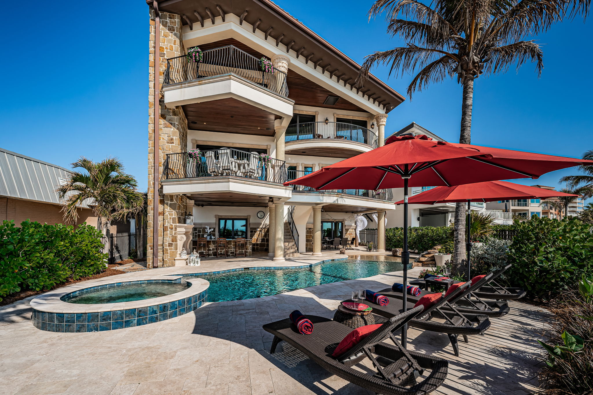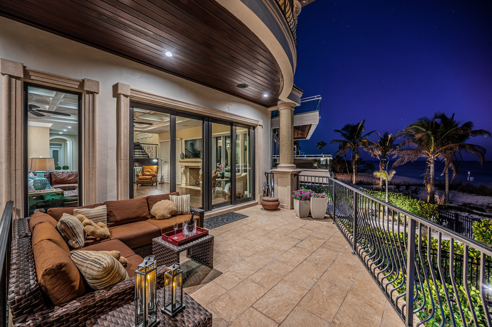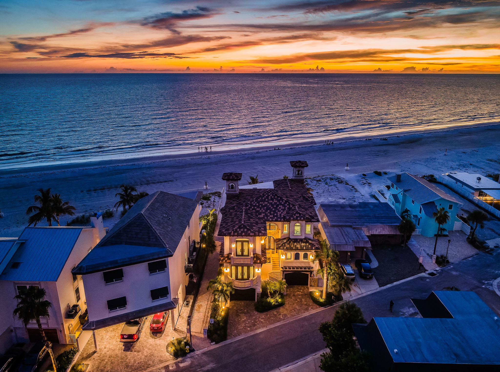 What happens when Tampa Bay’s premier architect, most accomplished structural engineer, and most respected builder come together? The result is an extraordinary beachfront residence that merges architectural brilliance, meticulous engineering, and beautiful state-of-the-art construction. Dan Dawson, Koly International, and Monogram Builders have created a modern 7719 sqft under one roof Gulf-front masterpiece where every detail has been carefully considered, tested, and refined. Balanced and cantilevered concrete engineering minimize columns and maximize sweeping Gulf views. Built on a foundation of 47 pilings, poured concrete structural columns, and poured concrete floors on every level, the home offers superior strength that is unmatched in the Tampa Bay area. Hurricane-rated windows and doors, and a roofing system engineered for the harshest coastal conditions help create a residence that is designed to last for generations. The impressive structural integrity is matched by luxurious, finely crafted finishes. Cast stone accents and custom exterior detailing set the tone, leading into a grand covered entry. Inside, you’ll find an open floor plan designed for Gulf-front living, with porcelain floors that echo the look of distressed Brazilian hardwood, level 5 drywall, intricate woodwork, designer lighting, custom ceilings, and integrated whole-house audio, lighting, and electronics. The gourmet kitchen is a chef’s dream – boasting expansive granite counters, custom cabinetry, double islands, two bar seating areas, Wolf / Subzero appliances, dual Miele luxury dishwashers, gas cooking, and a hidden pantry with built-in work center. The adjoining dining space opens to a covered beachfront balcony, while the Gulf-front living room offers coffered ceilings, a gas fireplace, and wide balcony access. A unique 3-stop glass elevator with custom hammered copper finish adds artistry to function. The beachfront owner’s suite is an indulging retreat, with luxe ceilings, a private balcony and a custom mahogany closet system. The spa-like bath contains a hammered copper soaking tub, dual vanities, cosmetics station, and a glass-enclosed rain shower. The four additional bedroom suites include two with Gulf-front balconies and two bedrooms with their own private terrace overlooking the Intracoastal Waterway. Step out back and discover a true beachfront oasis: a zero-entry PebbleTec pool and spa with cascading stone waterfall, expansive Travertine paver deck, 800 sq ft of covered outdoor living space with a built-in gas cooking center and bar, a stone-encased gas fireplace, and separates area for dining and entertaining. With additional features including a 22KW Generac gas generator, dual Rinnai tankless water heaters, central vacuum system, and countless luxury details, this home delivers an uncommon luxury Gulf front living experience built with unparalleled precision, quality and elegance. Dimensions are estimates, buyer to verify.