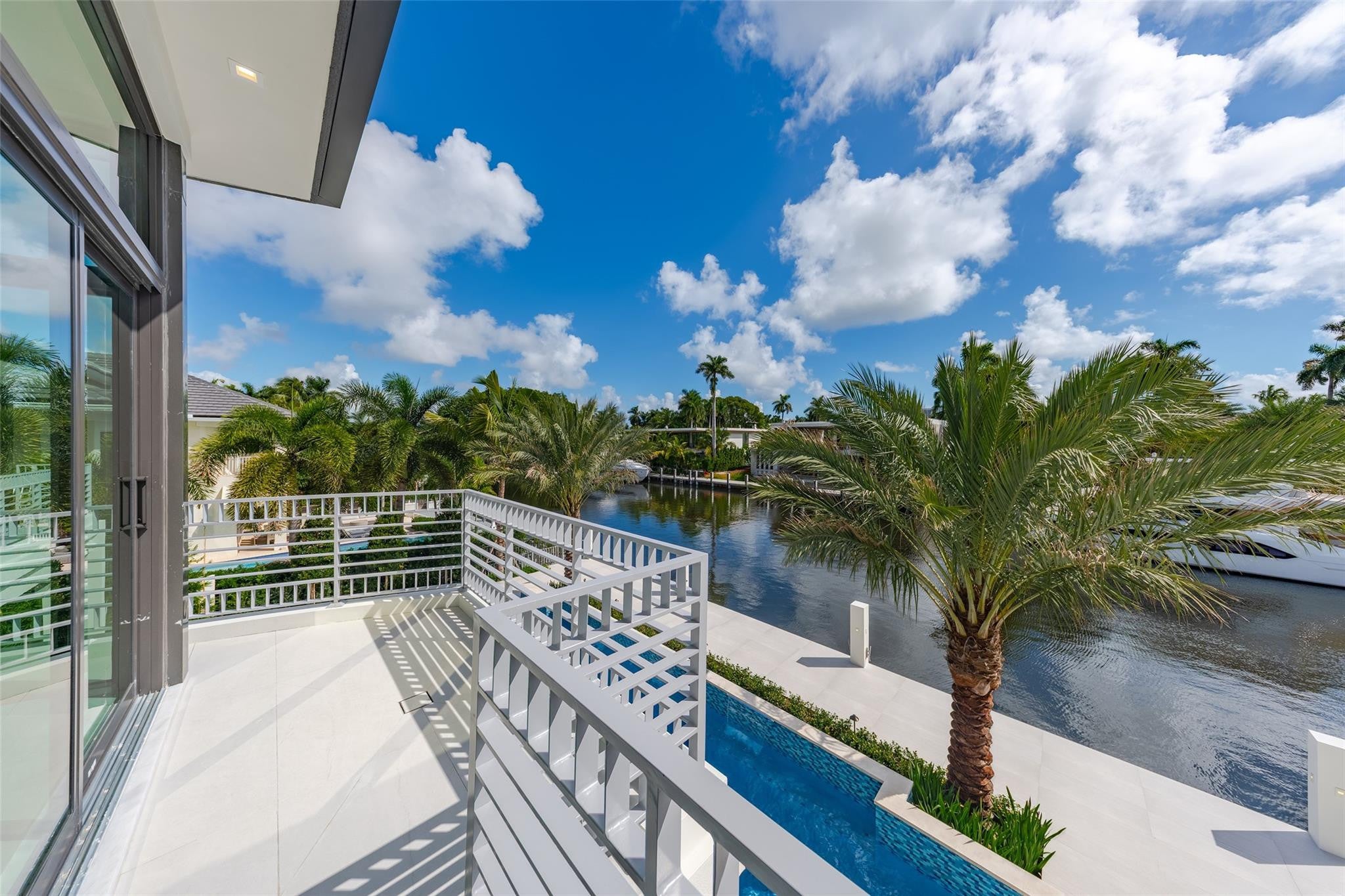 A statement of modern waterfront luxury, 24 Fiesta Way captivates with clean architecture, curated finishes, and 6,479 SF of refined living. Gated and private, this new residence rests on an 85 WF lot with beautifully designed landscaping and canal views. Interiors reveal custom veneered cabinetry, detailed ceiling carpentry, and expansive glass framing the courtyard.