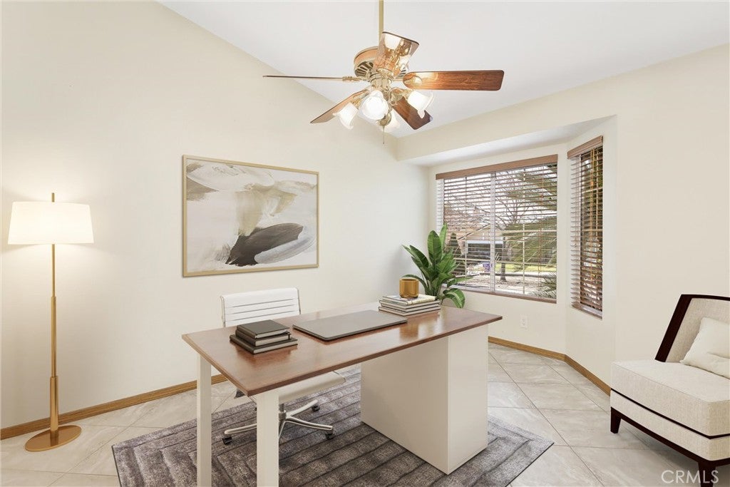 Beautifully maintained single level, 3 bedroom office / den home situated on a quiet cul-de-sac with breathtaking mountain views. Custom exterior hardscape in front and rear yards. Front entry door has a decorative security screen, which allows you to enjoy cool evening breezes along with the calming sound of the fountain. The open floor plan features a versatile den/office space that flows seamlessly into the main living area, ideal for today’s flexible lifestyle. The living room has a cozy gas fireplace with stone design and wood mantle. The spacious kitchen showcases custom cabinetry with expert detailing, granite countertops, custom tile backsplash, and a new 36” stove. There is a convenient Lazy Susan and some pullouts in cabinets. The range hood doubles as a whole house fan, along with an attic fan controlled from the kitchen, offering energy-efficient cooling. The kitchen and dining areas open directly to the backyard, creating the perfect setup for entertaining or relaxing. Enjoy peaceful mornings with sunrise and mountain views from the backyard patio and rear bedrooms. The private, oversized backyard includes a large patio slab, mature avocado tree with yummy producing fruit, block wall and wrought iron fencing, tool shed (with power and light fixture) and a seasonal shade fixture to help keep the home cool in summer while allowing natural light to fill the space in winter. The primary suite features large mirrored wardrobes and a handcrafted built-in dresser designed by a local artisan, creating space and a clean, minimal aesthetic. Bathrooms have been tastefully remodeled with cast iron and tile finishes for a spa-like experience. One of the secondary bedrooms includes a custom built-in Murphy bed, adding flexibility and functionality. Additional highlights include custom wood stained doors throughout, ceiling fans in every room for enhanced comfort and energy efficiency. Central Air with an upgraded 4 ton unit and Forced Air Heat. Ample closet space with heavy-duty closet rods in all bedrooms. The garage is drywalled with abundant storage, including reclaimed kitchen cabinetry and additional rafter space for seasonal items. There is direct access from the garage into the home. Conveniently located near schools, shopping, and everyday amenities. Call now and schedule your appointment to see this wonderful home today!