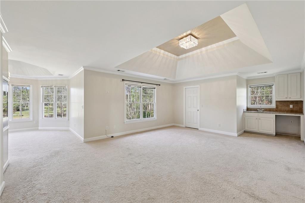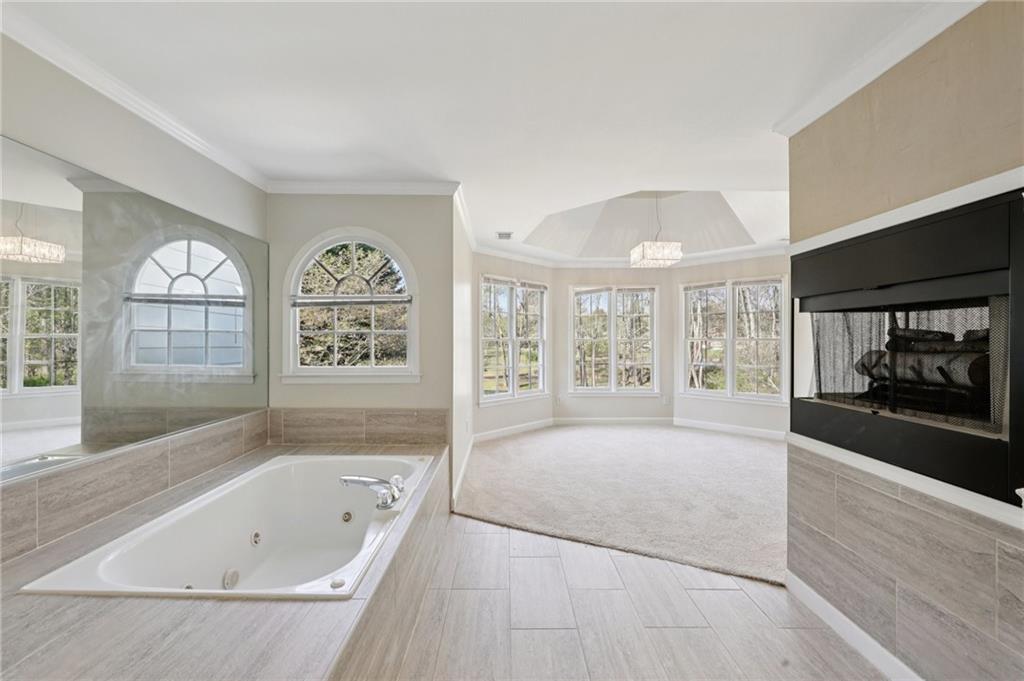 Stunning architectural design meets modern comfort in this move-in-ready home, highlighted by a striking two-story elevation, soaring cathedral ceilings, and a dramatic open-concept layout. Thoughtfully crafted with clean lines and elegant detailing, the home features a grand family room anchored by a floor-to-ceiling gas log fireplace, flanked by custom built-in bookshelves and expansive windows that flood the space with natural light. The seamless flow between living spaces enhances both everyday living and entertaining, while refined finishes like classic wainscoting, tray ceilings, and glass French doors add timeless character throughout. This 4-bedroom, 3.5-bath residence offers durable luxury vinyl plank flooring across the main floor. Just off the entry, a private den provides the ideal space for a home office, playroom, or flex room. The gourmet kitchen is a chef's dream, complete with soft-close cabinetry, granite countertops, stainless steel appliances (including a fingerprint-resistant refrigerator), gas cooktop, wall oven/microwave combo, a spacious center island with seating for four, and a walk-in pantry. Adjacent to the kitchen, the bright breakfast room offers abundant natural light and a convenient office nook-perfect for work or organization. The functional mudroom off the 3-car garage includes built-in cubbies. The main floor also has a half bath laundry room with floor-to-ceiling cabinetry and utility sink. Upstairs, the primary suite features a tray ceiling and double-door entry to a luxurious ensuite bath with dual vanities, a garden tub, separate water closet, and a large walk-in closet. Two additional bedrooms share a full bath, while the home's fourth bedroom includes its own private ensuite. The unfinished basement is ready for your personal touch and includes rough-in plumbing for a future bathroom. Step outside to enjoy the fully fenced backyard with a low-maintenance composite deck and peaceful green space backing to a tree line-per