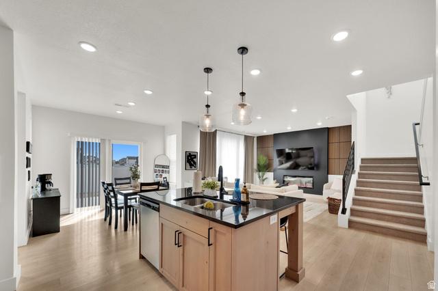 Located in the 55 community of Fields at Indian Creek, this single home is the largest model in the neighborhood and offers a spacious open layout with over 3,000 square feet of living space. A dramatic foyer with soaring ceilings welcomes you inside and leads to a private library or study featuring custom cherry built in shelving to create a comfortable space for relaxing with a good book. The main living area features vaulted ceilings, LVP flooring, plantation shutters, and a cornered gas fireplace. The space flows openly into the kitchen and eating areas, creating an inviting layout suited for both everyday living and entertaining. The kitchen includes quartz countertops, subway tile backsplash, wall oven/microwave, and a large center island with slide-in range and statement vent hood. The adjacent dining area features a built-in serving buffet cabinetry and quartz countertop that functions as a butlers pantry while providing additional storage and serving space. The main level provides convenient first floor living with a spacious primary suite featuring two walk-in closets and an en-suite bath with dual vanities and an oversized tiled shower with built in bench seating. A second bedroom and full bath are also located on this level. The laundry room is positioned between the hallway and the primary suite, allowing easy access from both areas. Upstairs, a large loft provides additional living space along with a third bedroom and full bath, creating a pleasant space for guests. This level also includes a substantial unfinished insulated storage area with built in workbench offering excellent space for storage, hobbies, or workshop use. Outdoor access from the kitchen leads to a deck and stone patio. Additional features include an extra wide two car garage, central vacuum system, generator hookup, and beadboard panel styled interior doors throughout. Residents of Fields at Indian Creek have access to community amenities including a clubhouse, fitness center, pool, pickleball and bocce courts, and walking trails. A seamless blend of timeless elegance and refined detail, this home offers a truly elevated living experience.