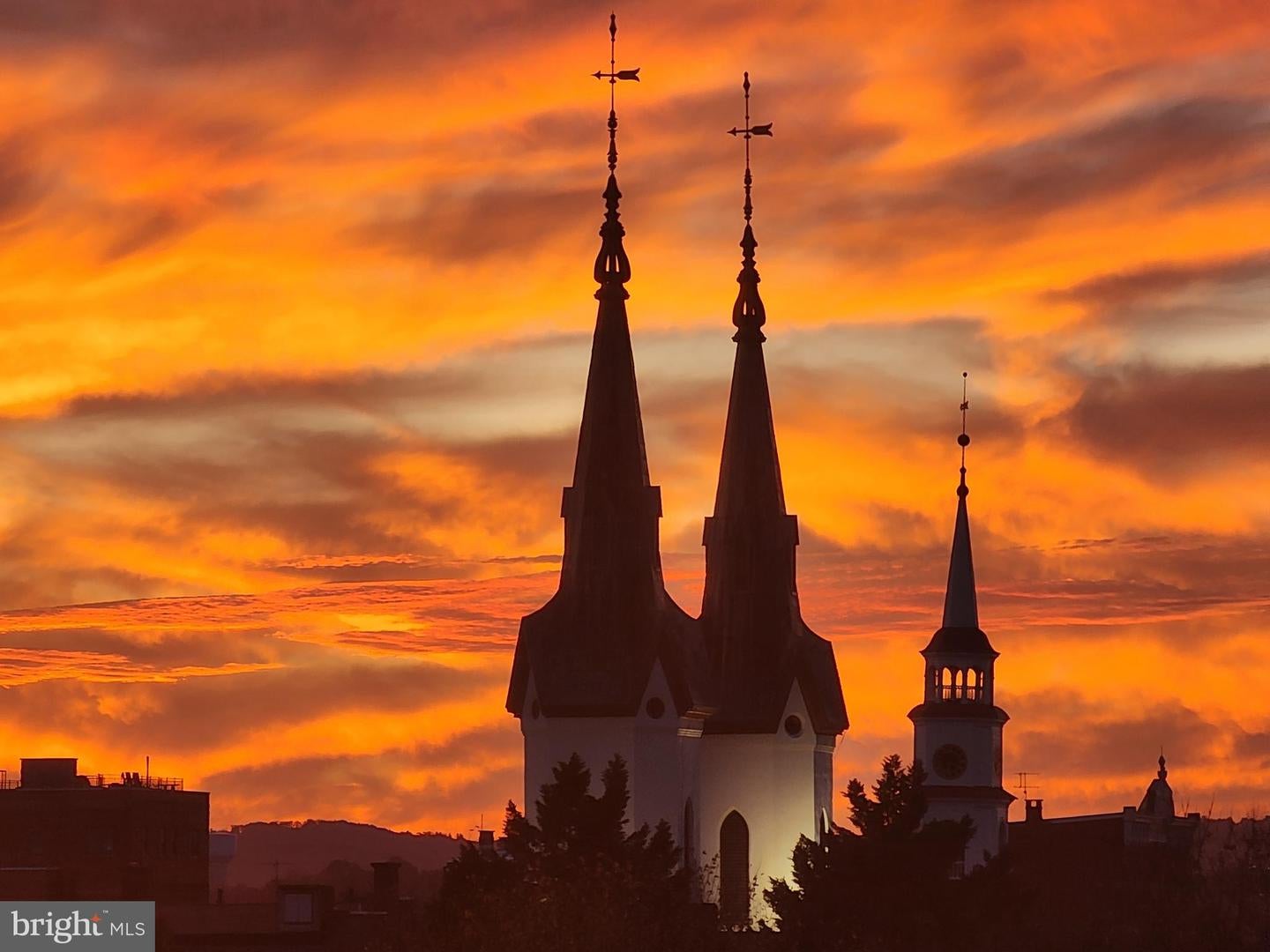 Luxury, penthouse condo in downtown Frederick, adjacent to Frederick Visitation Hotel and Wye Oak Tavern! Showcased on the Frederick holiday tour. Move-in ready, no waiting for new construction. Exceptional open floor plan is perfect for entertaining. Gourmet kitchen with Thermador refrigerator and double ovens, living room with fireplace featuring stacked stone surround and custom mantel and beautiful dining room. Bar area with glass display cabinetry and wine refrigerator. Two primary bedrooms with en-suite bathrooms and walk-in closets. Separate laundry room, powder room and den/bedroom 3. Expansive, private balcony with retractable awnings. Panoramic views include Sugarloaf Mountain , Frederick Visitation Hotel and the iconic clustered spires. Condo includes private extended garage with parking for 2 cars, electric car charger, additional space for storage and separate room with ceiling fan, refrigerator with ice/water and utility sink with hot/cold water.