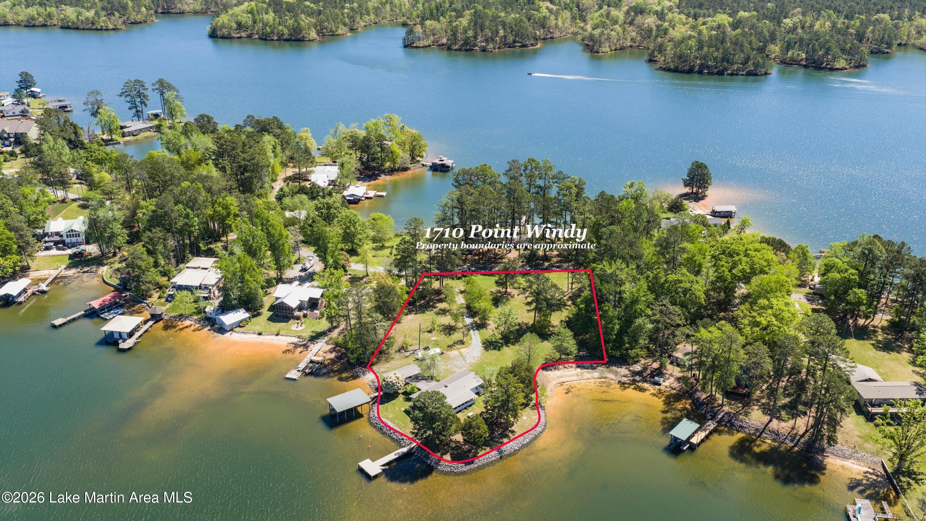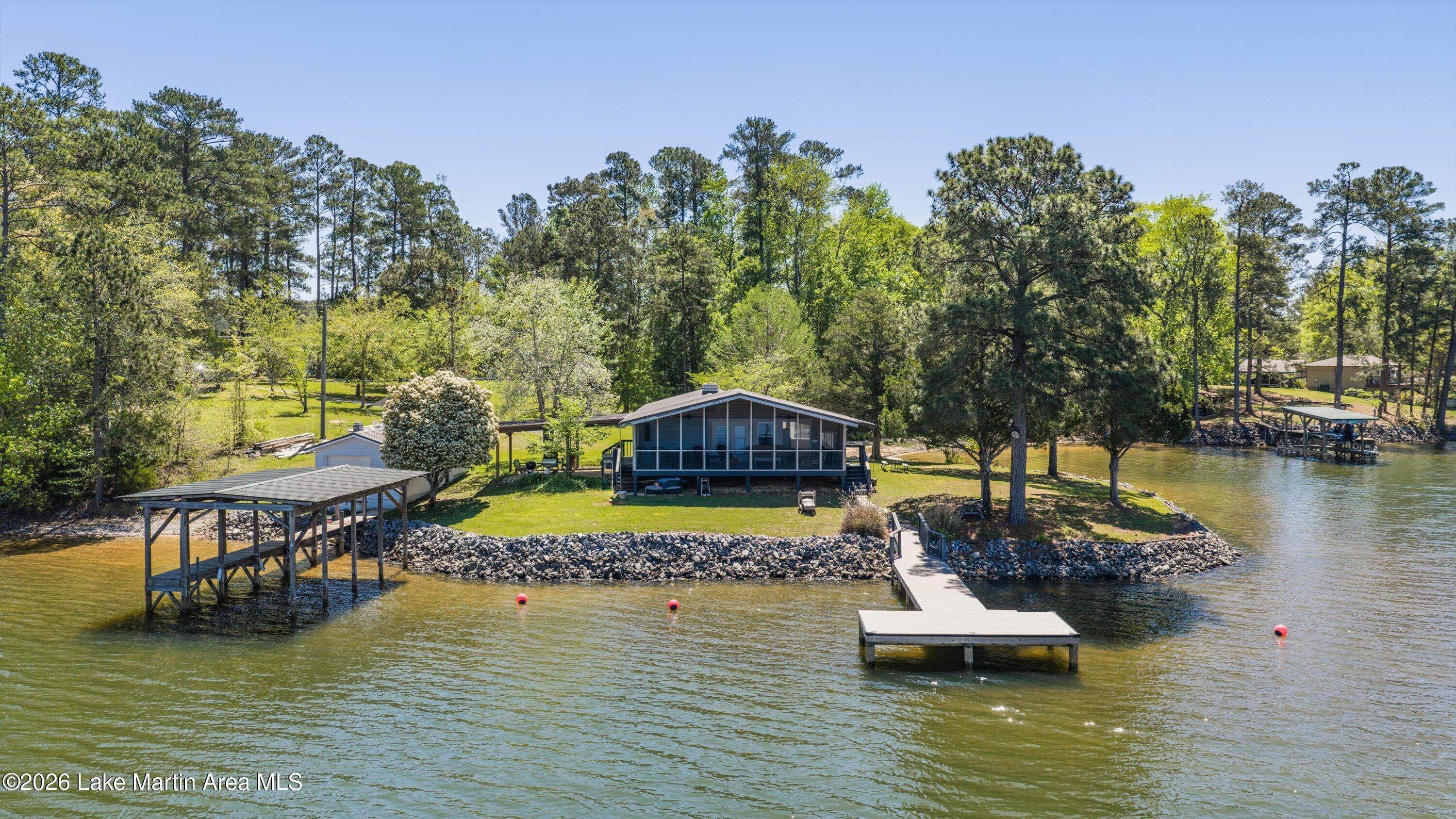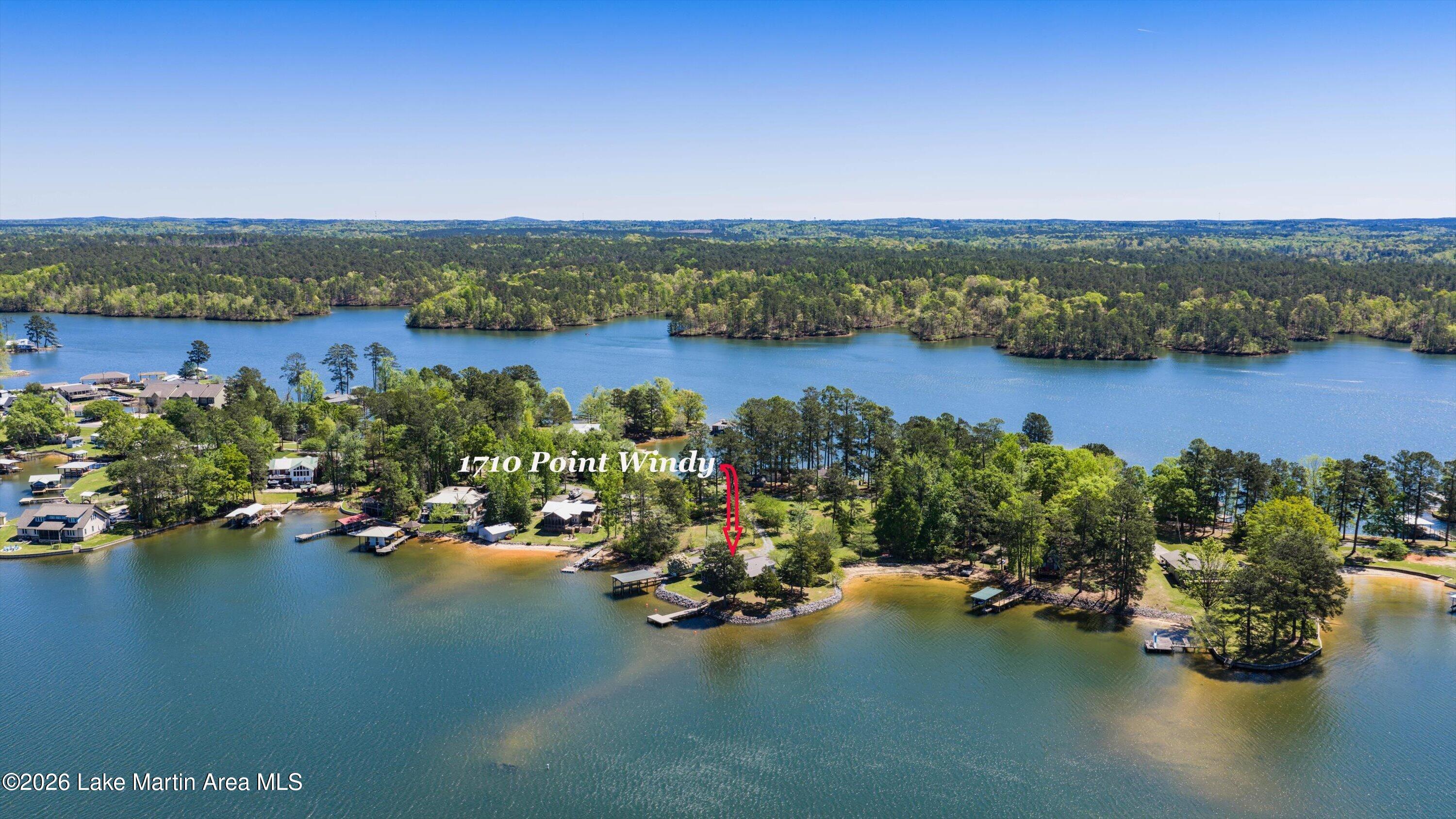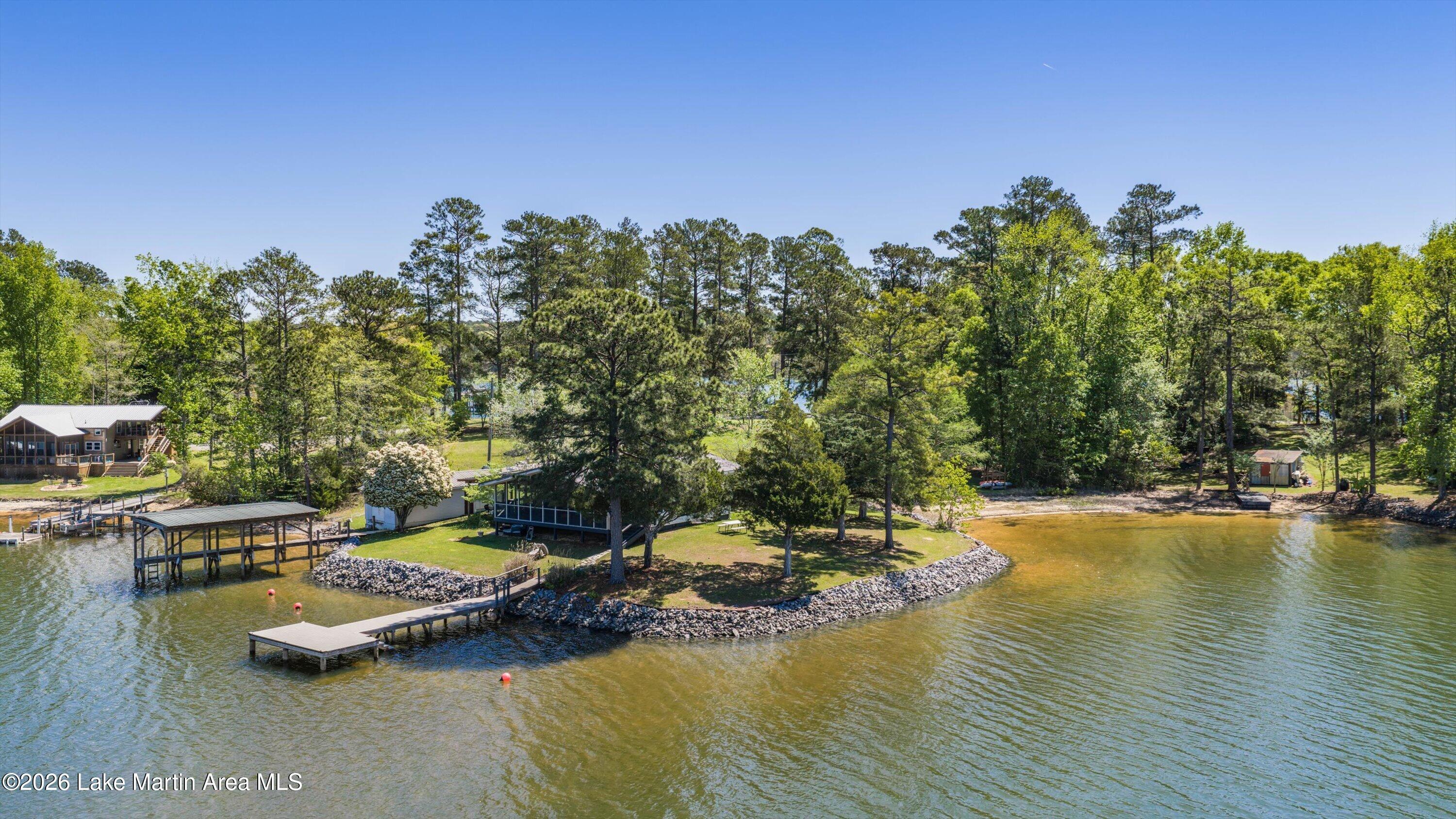 Rare LEGACY Property on POINT WINDY on private point. Peaceful & serene 1.38 /- Acres, 469 /- ft of bulkheaded waterfront--Pristine TURN KEY 3bd/2ba furnished cottage with open water views & breathtaking sunsets, wrap around screened porch, outdoor shower, wood burning original fireplace, hardwood floors throughout, covered boat slip and dock, freestanding boathouse for additional storage. With a second new composite swimming dock (Lake Martin Docks 2024), 2018 septic (pumped 2025), 2020 metal roof, HVAC ( 5 years old), gravel boat launch. Updated HVAC, water heater, electrical panel, pipes/plumbing, & septic. Close proximity to Alex City, Publix, Auburn, Boondocks Marina, Point Windy Public Boat Ramp and Peanut Point.