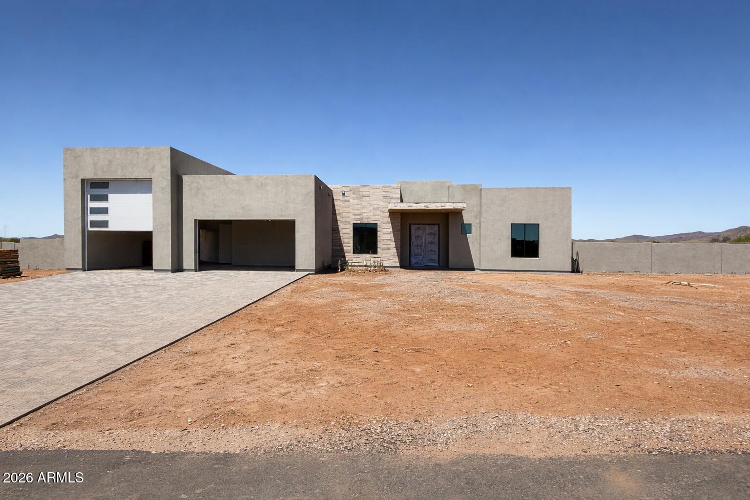 Luxury full-spec home to be built with a 2-bed, 1-bath guest house. Double iron/glass entry leads to 4 bedrooms plus an office/den and 3.5 baths. Features include 12 ft ceilings, 8 ft doors, 90/10 drywall finish, spray foam insulation, and a 47 ft RV garage plus 2-car garage. The chefs kitchen offers a large island, Wolf/Sub-Zero appliances including a 48 gas range and 48 built-in Sub-Zero refrigerator with custom panel front, and Quartzite waterfall countertop. All bedrooms have walk-in closets. Primary suite features a spacious shower, stand-alone tub, double sinks, and custom closet built-ins. Exterior includes paved road, post-tension foundation, paver driveway, walkway, and block fencing with 12 ft RV and 4 ft gates. No HOA. Photos are of a completed model; images for info only.