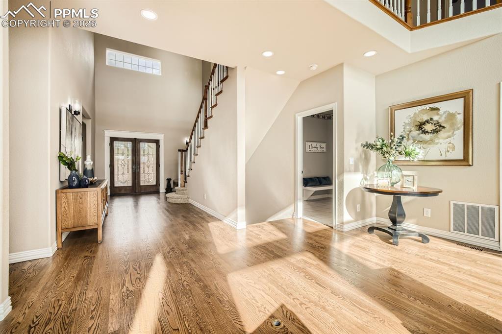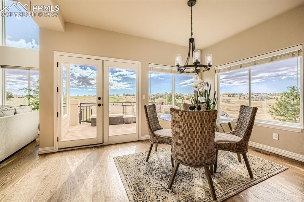 Enjoy this exceptional Colorado living experience on 2.5 acres with beautiful mountain views. Situated on the 18th tee box of Kings Deer Golf course lot in cul-de sac! Located in the highly sought after Kings Deer neighborhood and in the Lewis Palmer School District 38! Stunning views from every window. When you enter through the front door you will notice the impressive stair case & beautiful wood floors and lofty ceilings. This home has 6 bedrooms, 4 bathrooms and a 7-car garage! This gourmet kitchen is a chefs dream. Beautiful granite countertops & custom cherry wood cabinets, equipped with stainless steel appliances, a reverse Osmosis water system and plenty of space to spread out. Also, you will find a spacious eating area with amazing views and a walk-in pantry, formal dining room and private bath on main. Upstairs you will find the large primary suite with French doors, luxurious 5-piece bath, soaking tub, and a generous walk-in-closets and remote controlled blinds. In addition you will find 4 private bedrooms each with a bath & walk-in-closet. The fully finished basement is made for entertaining, featuring a home theater, antique bar, & a dedicated wine room. Theres also an additional suite with ample space for visitors. Outdoor living is just as inviting, with a large composite deck supported by elegant stucco columns & a lower-level patio pre-wired for a hot tub. Both spaces are ideal for entertaining, all while enjoying unparalleled views of Pikes Peak & golf course. Recently enhanced newly completed garage addition, offering space for 7 vehicles. The garage wall organization system comes with cabinets and wall mounted system for extra storage areas, custom epoxy floor, pre-wiring for electric vehicle & generator. So many updates have been made that make this home better than new! Easy access to I-25, COS & Denver. Dont miss this opportunity to own this one-of-a-kind property!