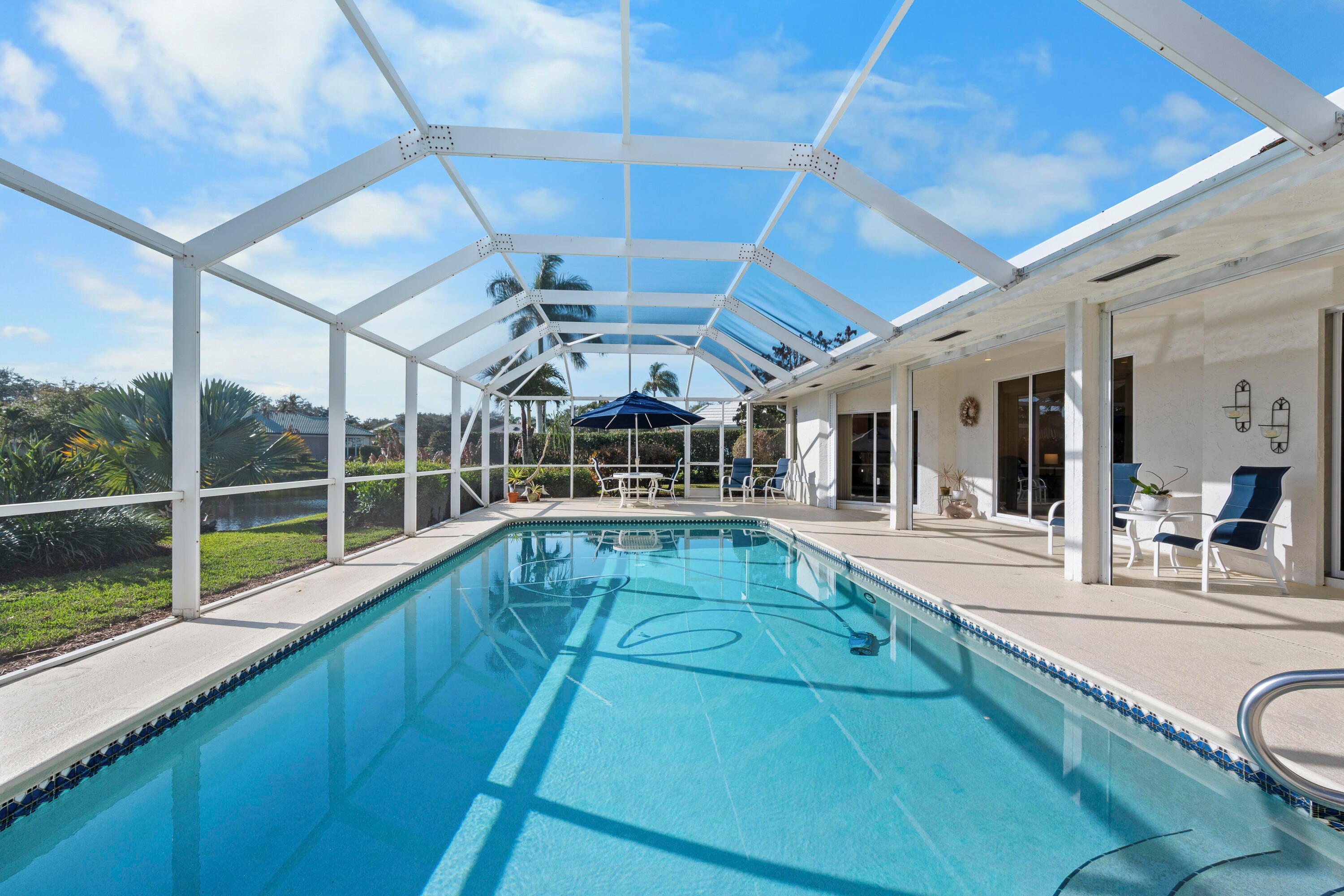 Luxury lakefront pool home in the prestigious gated community of Heritage Oaks. This spacious 4-bedroom, 3-bath residence sits on an .49-acre waterfront lot with wide lake views from the living room, kitchen, primary suite, guest room, and outdoor living areas. Enjoy Florida lifestyle living with a large screened pool, covered lanai, and hot tub--perfect for entertaining or relaxing. The split floor plan offers privacy, while the open-concept kitchen flows into a comfortable sitting area featuring a two-sided fireplace. The primary suite includes sliding glass doors leading to the pool and patio. Updated bathrooms, oversized 2-car garage, and circular paver driveway add convenience and curb appeal. Ideal Florida luxury home, waterfront property, and private retreat.