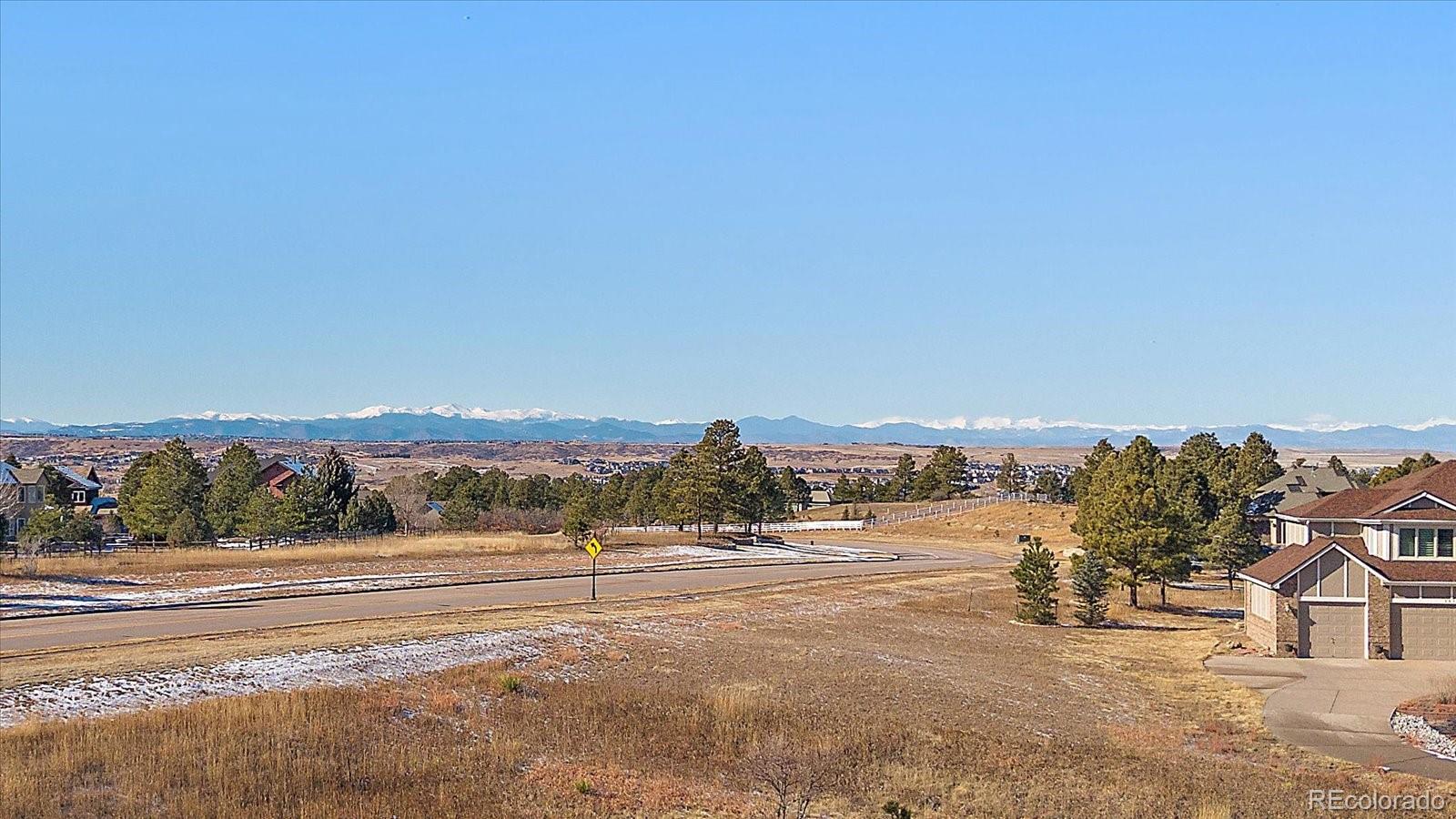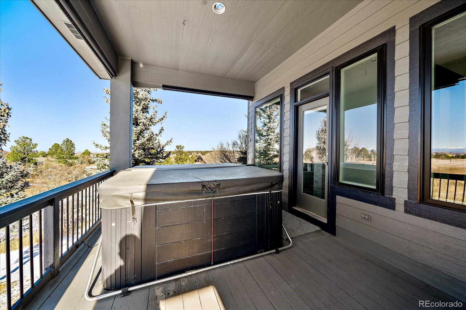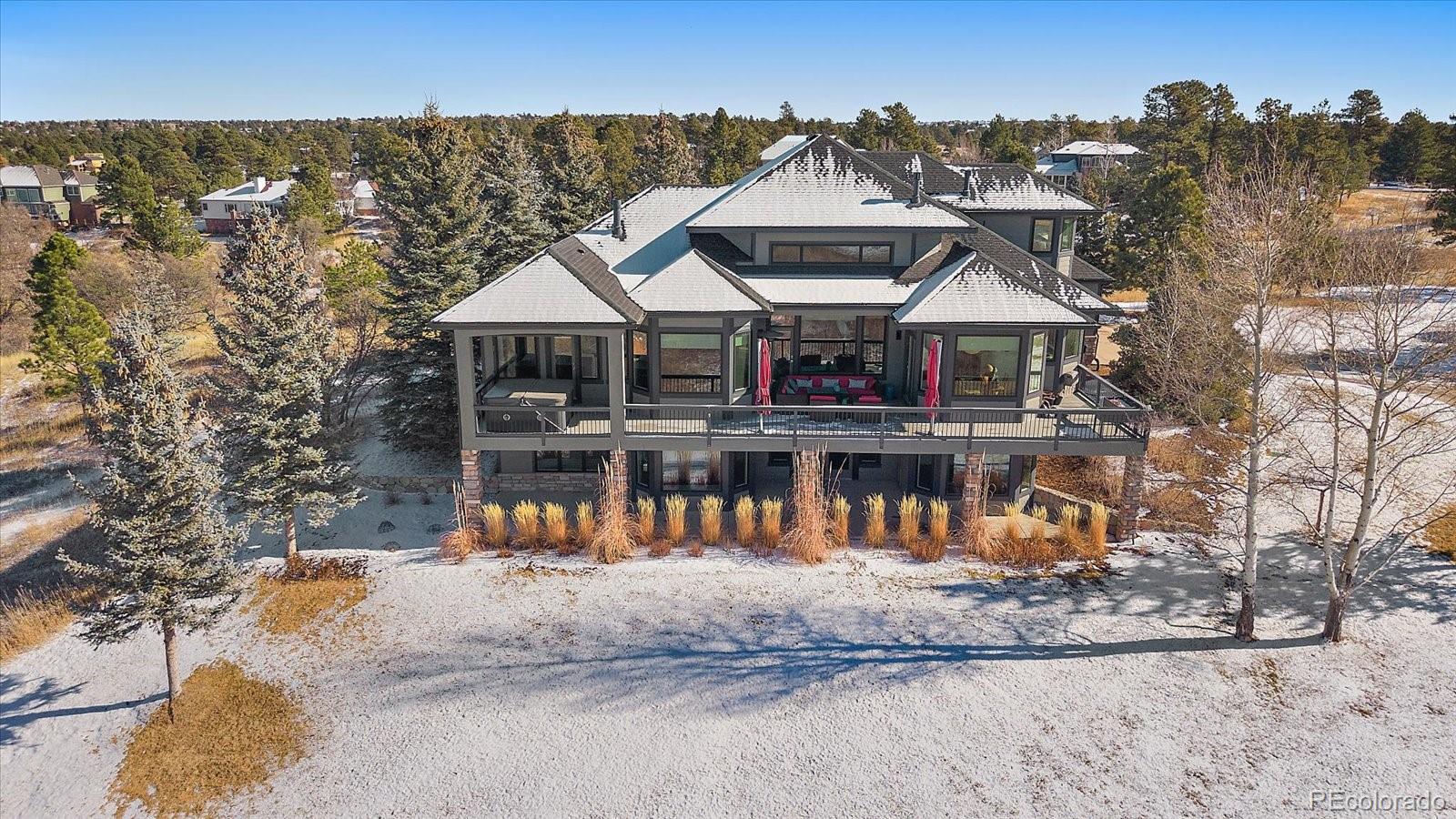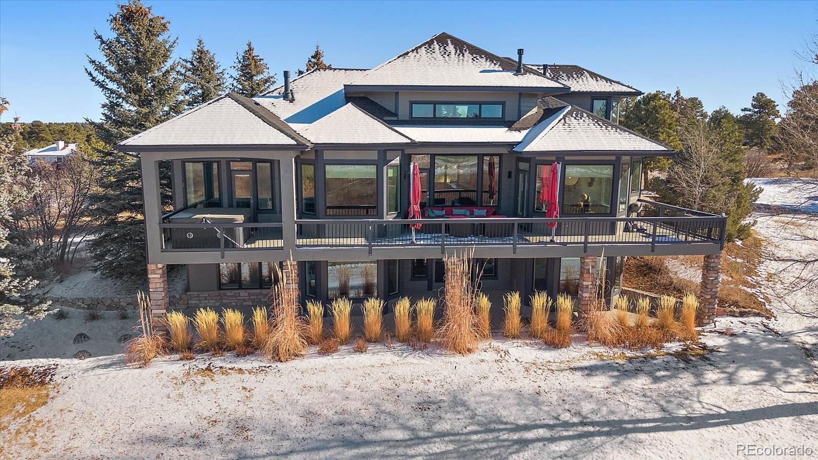 Want to enjoy Colorado to its fullest? This beautiful 4631-square foot, 4-bedroom, 3.5 bath contemporary home sits on 1.67 acres tucked into an oversized cul-de-sac, framed by towering Ponderosa pines, spruce, aspen, and maple trees and native as well as professional landscaping. The home sits at 6776 feet in elevation and the view of the Colorado mountains is spectacular, from Pikes Peak to Mount Blue Sky and further up the front range. Enter this home through the custom-made leaded glass front doors and be greeted by soaring vaulted ceilings and numerous large custom windows that flood the home with natural light and allow for breathtaking mountain views from almost every room in the home, as well as views of Bingham Lake to the north. The kitchen is the heart of the home with upgraded stainless steel appliances, quartz counters, and a stylish tile accent wall. The kitchen is open to the large family and dining room areas, as well as a separate kitchen nook, creating a generous open space perfect for casual living and easy entertaining. The primary suite is large and includes a separate but easily accessible office space, a beautifully tiled fireplace, and a custom, spa-like bathroom complete with heated floors and easy access to the hot tub just one step outside the primary bathroom, on a deck that spans the entire length of the home. Upstairs is a generously sized loft/library and a very private secondary bedroom and en-suite bath. The walk-out basement (yes, you can see the mountains from rooms in the basement!) has a wet bar, an expansive game room for family and friends fun, two additional bedrooms, a full bath, and the perfect space for a future wine cellar. An easily accessible cart path in the neighborhood leads to the Pinery Country Clubs 6th hole (out of 27) and its a straight shot to the Pinery club house. The golf cart is negotiable!