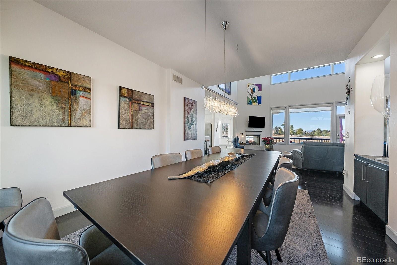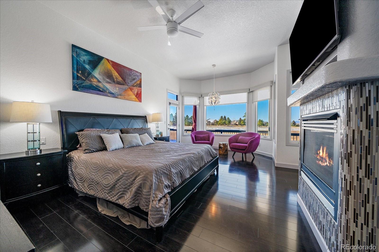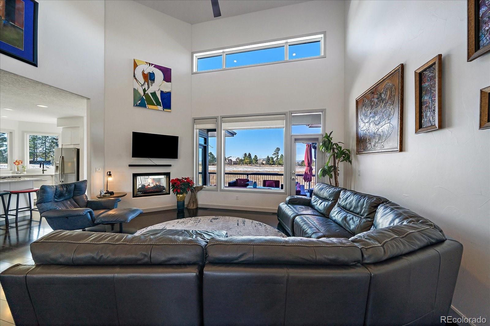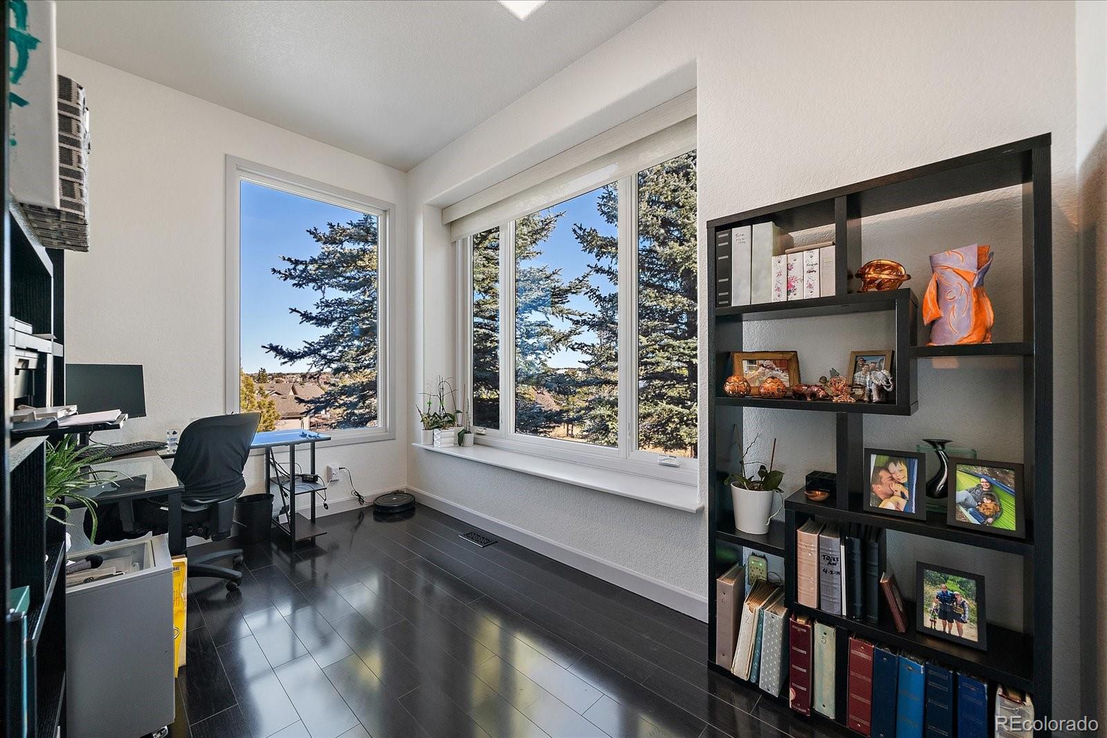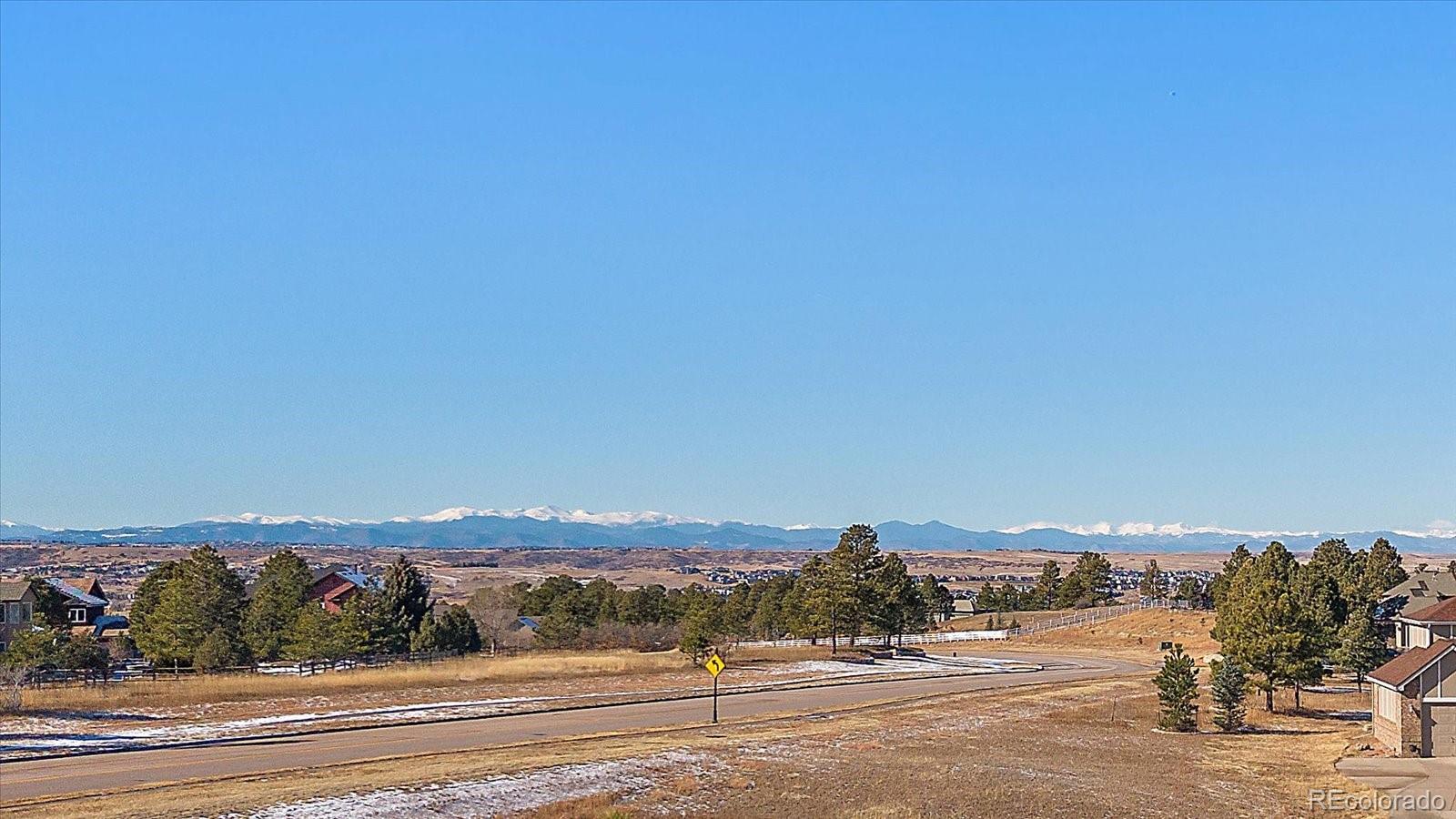 Want to enjoy Colorado to its fullest? This beautiful 4631-square foot, 4-bedroom, 3.5 bath contemporary home sits on 1.67 acres tucked into an oversized cul-de-sac, framed by towering Ponderosa pines, spruce, aspen, and maple trees and native as well as professional landscaping. The home sits at 6776 feet in elevation and the view of the Colorado mountains is spectacular, from Pikes Peak to Mount Blue Sky and further up the front range. Enter this home through the custom-made leaded glass front doors and be greeted by soaring vaulted ceilings and numerous large custom windows that flood the home with natural light and allow for breathtaking mountain views from almost every room in the home, as well as views of Bingham Lake to the north. The kitchen is the heart of the home with upgraded stainless steel appliances, quartz counters, and a stylish tile accent wall. The kitchen is open to the large family and dining room areas, as well as a separate kitchen nook, creating a generous open space perfect for casual living and easy entertaining. The primary suite is large and includes a separate but easily accessible office space, a beautifully tiled fireplace, and a custom, spa-like bathroom complete with heated floors and easy access to the hot tub just one step outside the primary bathroom, on a deck that spans the entire length of the home. Upstairs is a generously sized loft/library and a very private secondary bedroom and en-suite bath. The walk-out basement (yes, you can see the mountains from rooms in the basement!) has a wet bar, an expansive game room for family and friends fun, two additional bedrooms, a full bath, and the perfect space for a future wine cellar. An easily accessible cart path in the neighborhood leads to the Pinery Country Clubs 6th hole (out of 27) and its a straight shot to the Pinery club house. The golf cart is negotiable!