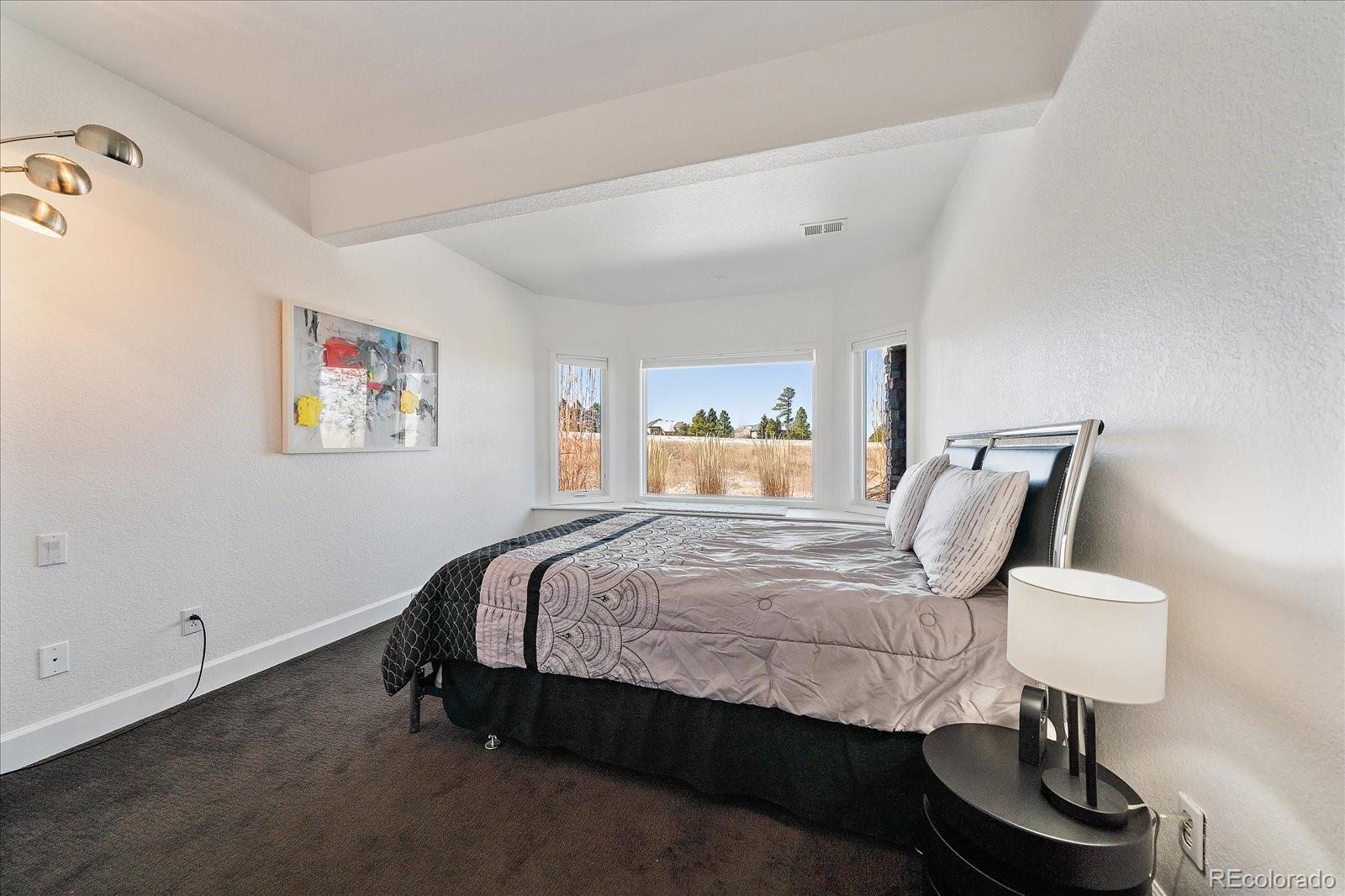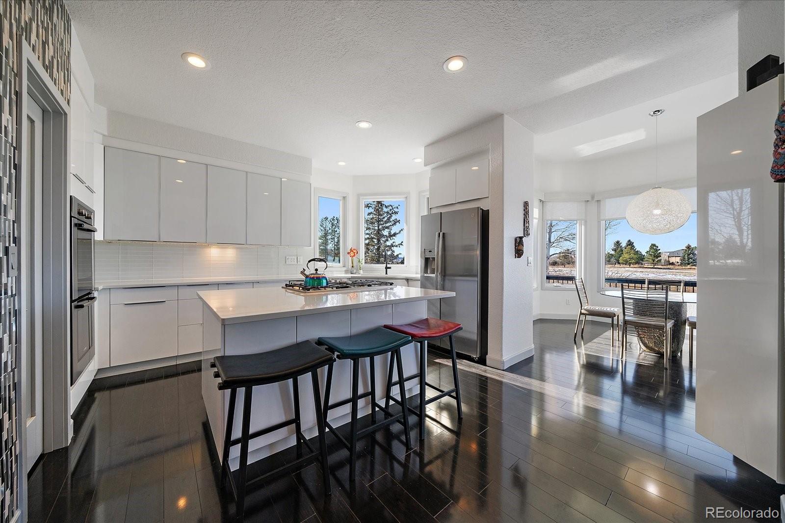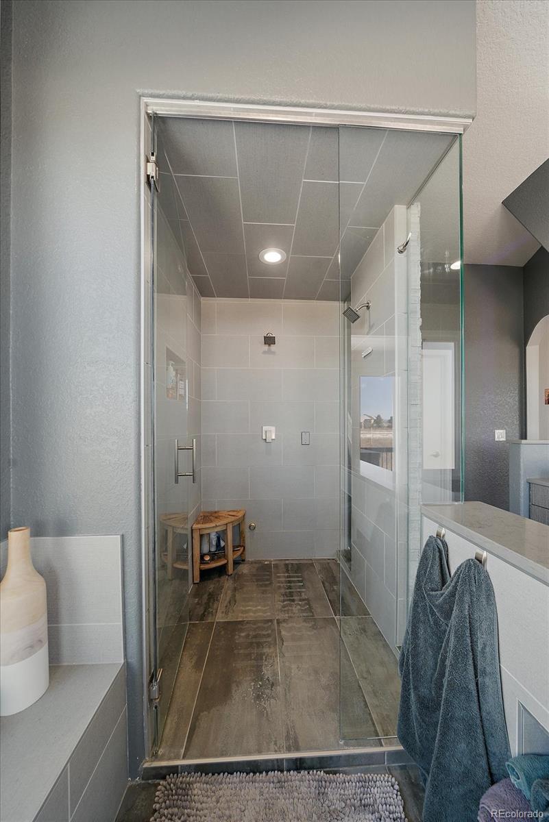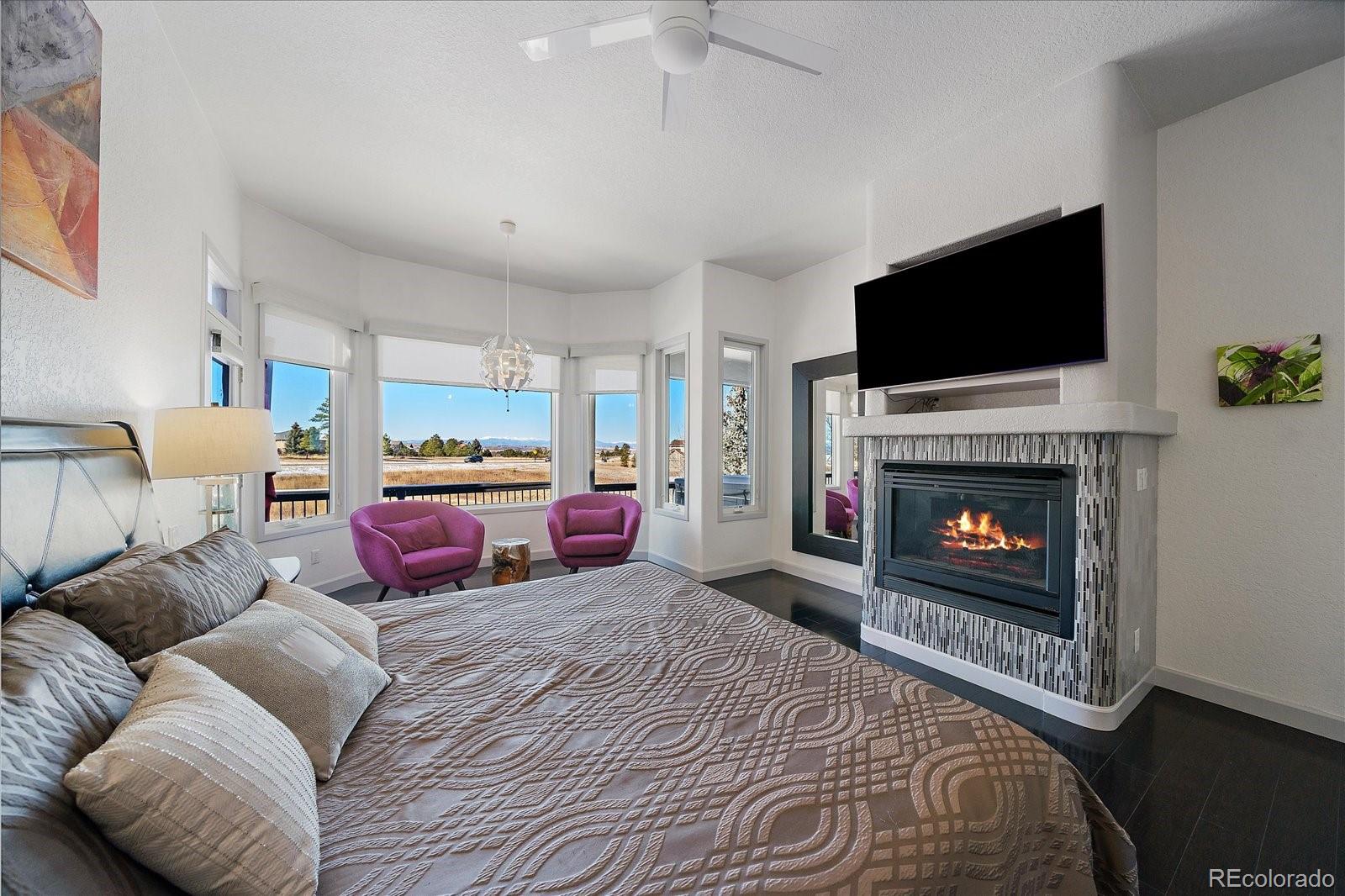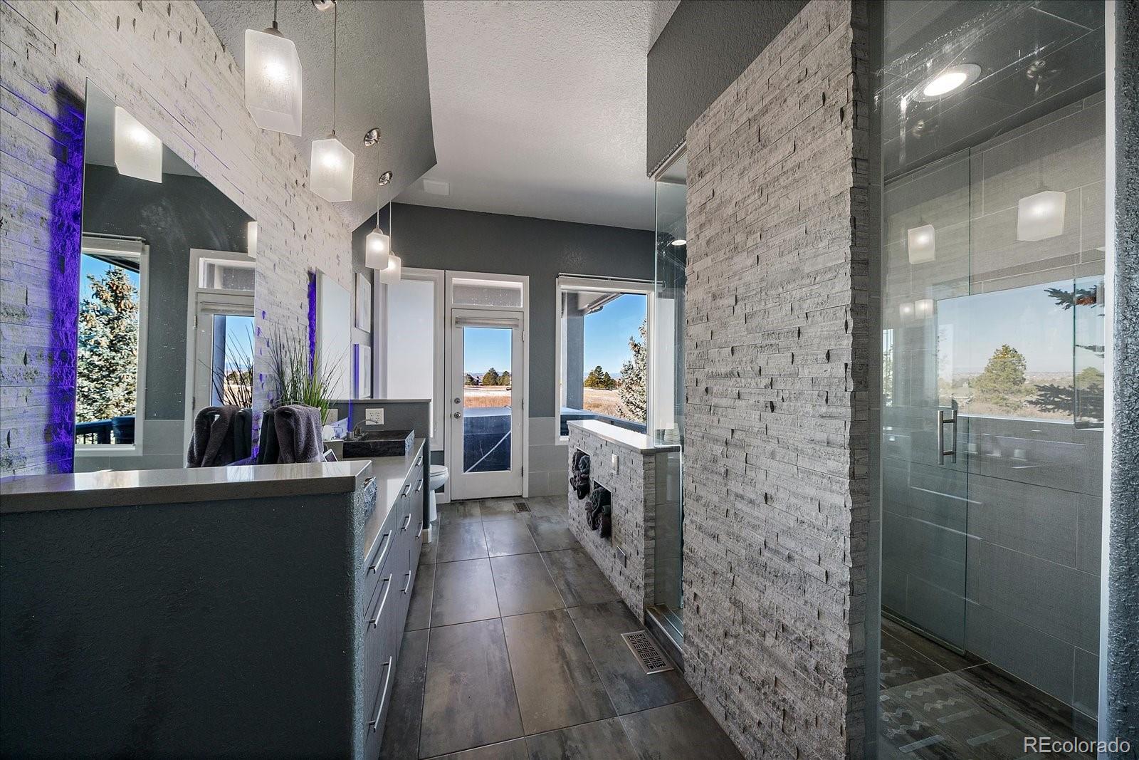 Want to enjoy Colorado to its fullest? This beautiful 4631-square foot, 4-bedroom, 3.5 bath contemporary home sits on 1.67 acres tucked into an oversized cul-de-sac, framed by towering Ponderosa pines, spruce, aspen, and maple trees and native as well as professional landscaping. The home sits at 6776 feet in elevation and the view of the Colorado mountains is spectacular, from Pikes Peak to Mount Blue Sky and further up the front range. Enter this home through the custom-made leaded glass front doors and be greeted by soaring vaulted ceilings and numerous large custom windows that flood the home with natural light and allow for breathtaking mountain views from almost every room in the home, as well as views of Bingham Lake to the north. The kitchen is the heart of the home with upgraded stainless steel appliances, quartz counters, and a stylish tile accent wall. The kitchen is open to the large family and dining room areas, as well as a separate kitchen nook, creating a generous open space perfect for casual living and easy entertaining. The primary suite is large and includes a separate but easily accessible office space, a beautifully tiled fireplace, and a custom, spa-like bathroom complete with heated floors and easy access to the hot tub just one step outside the primary bathroom, on a deck that spans the entire length of the home. Upstairs is a generously sized loft/library and a very private secondary bedroom and en-suite bath. The walk-out basement (yes, you can see the mountains from rooms in the basement!) has a wet bar, an expansive game room for family and friends fun, two additional bedrooms, a full bath, and the perfect space for a future wine cellar. An easily accessible cart path in the neighborhood leads to the Pinery Country Clubs 6th hole (out of 27) and its a straight shot to the Pinery club house. The golf cart is negotiable!