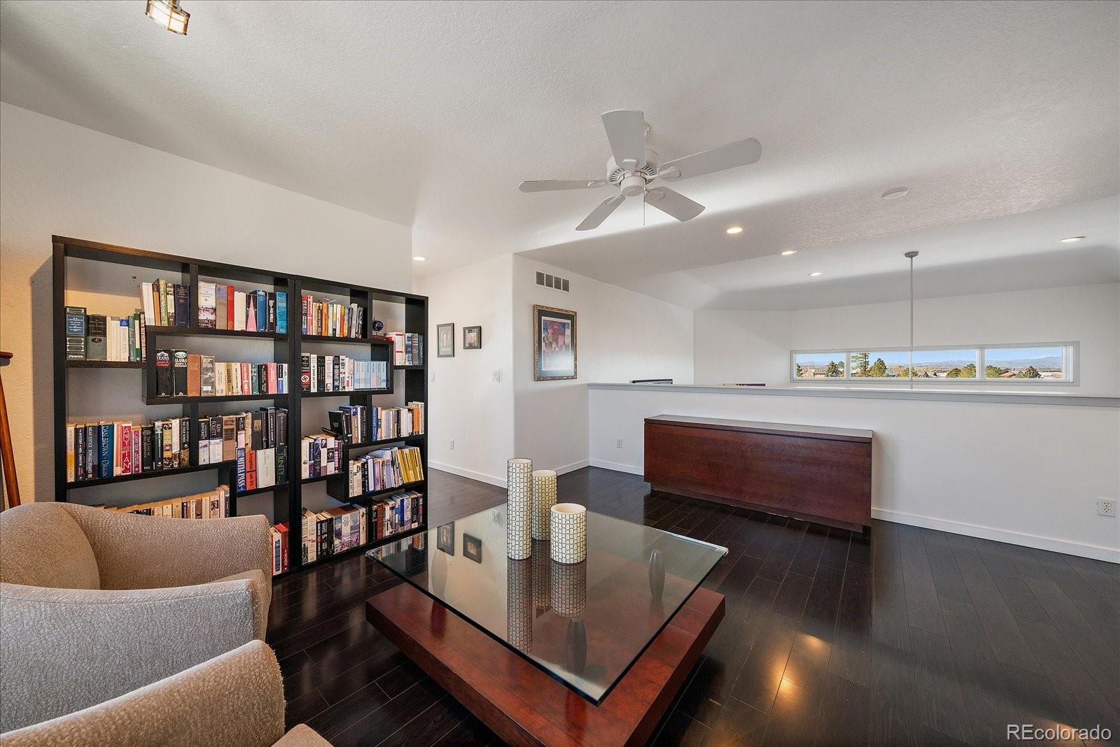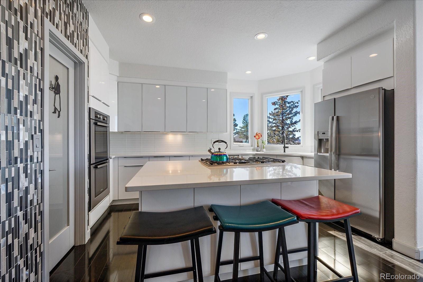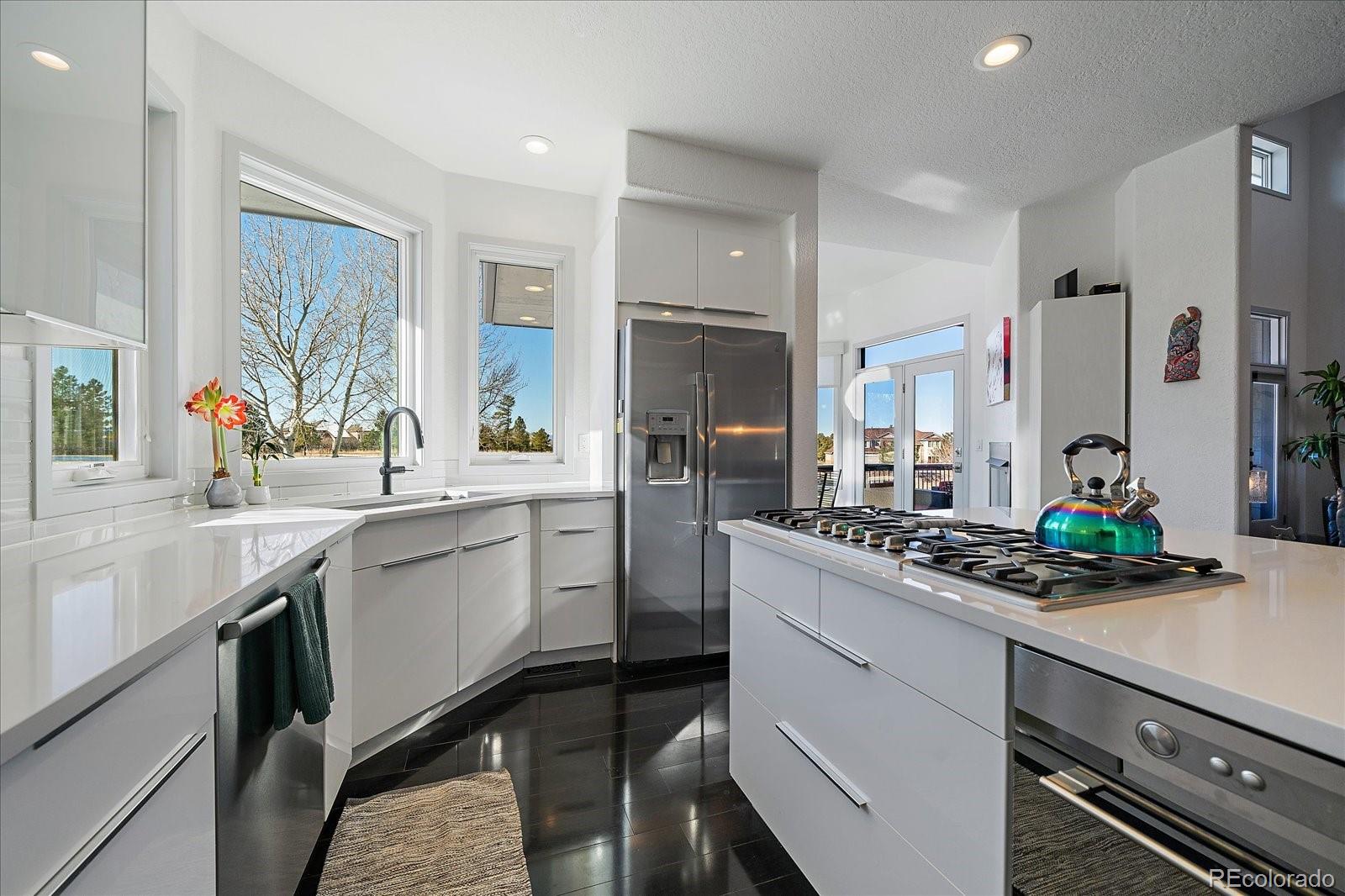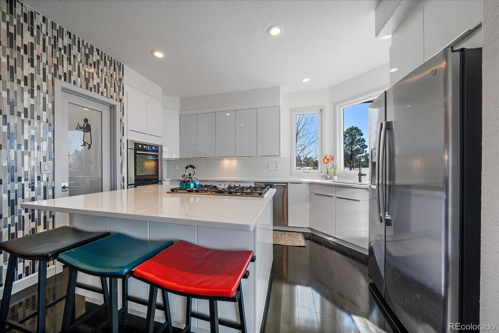 Want to enjoy Colorado to its fullest? This beautiful 4631-square foot, 4-bedroom, 3.5 bath contemporary home sits on 1.67 acres tucked into an oversized cul-de-sac, framed by towering Ponderosa pines, spruce, aspen, and maple trees and native as well as professional landscaping. The home sits at 6776 feet in elevation and the view of the Colorado mountains is spectacular, from Pikes Peak to Mount Blue Sky and further up the front range. Enter this home through the custom-made leaded glass front doors and be greeted by soaring vaulted ceilings and numerous large custom windows that flood the home with natural light and allow for breathtaking mountain views from almost every room in the home, as well as views of Bingham Lake to the north. The kitchen is the heart of the home with upgraded stainless steel appliances, quartz counters, and a stylish tile accent wall. The kitchen is open to the large family and dining room areas, as well as a separate kitchen nook, creating a generous open space perfect for casual living and easy entertaining. The primary suite is large and includes a separate but easily accessible office space, a beautifully tiled fireplace, and a custom, spa-like bathroom complete with heated floors and easy access to the hot tub just one step outside the primary bathroom, on a deck that spans the entire length of the home. Upstairs is a generously sized loft/library and a very private secondary bedroom and en-suite bath. The walk-out basement (yes, you can see the mountains from rooms in the basement!) has a wet bar, an expansive game room for family and friends fun, two additional bedrooms, a full bath, and the perfect space for a future wine cellar. An easily accessible cart path in the neighborhood leads to the Pinery Country Clubs 6th hole (out of 27) and its a straight shot to the Pinery club house. The golf cart is negotiable!